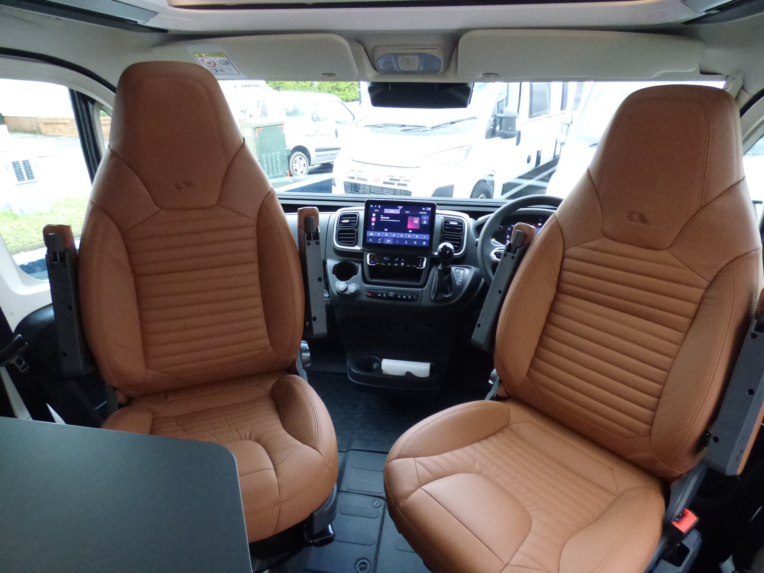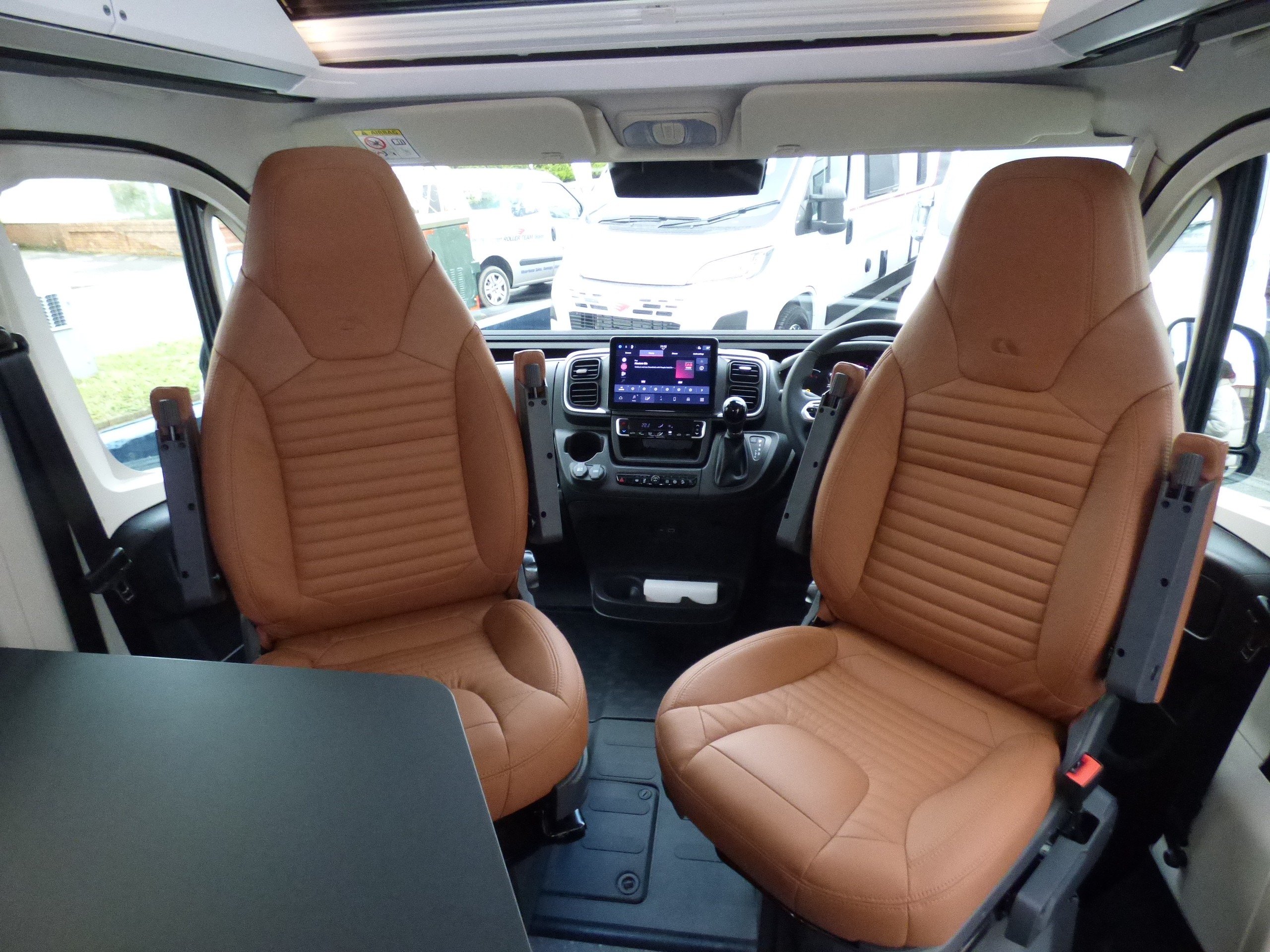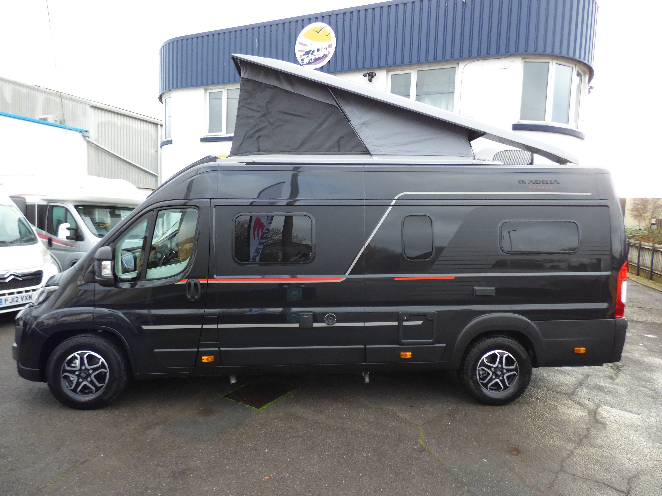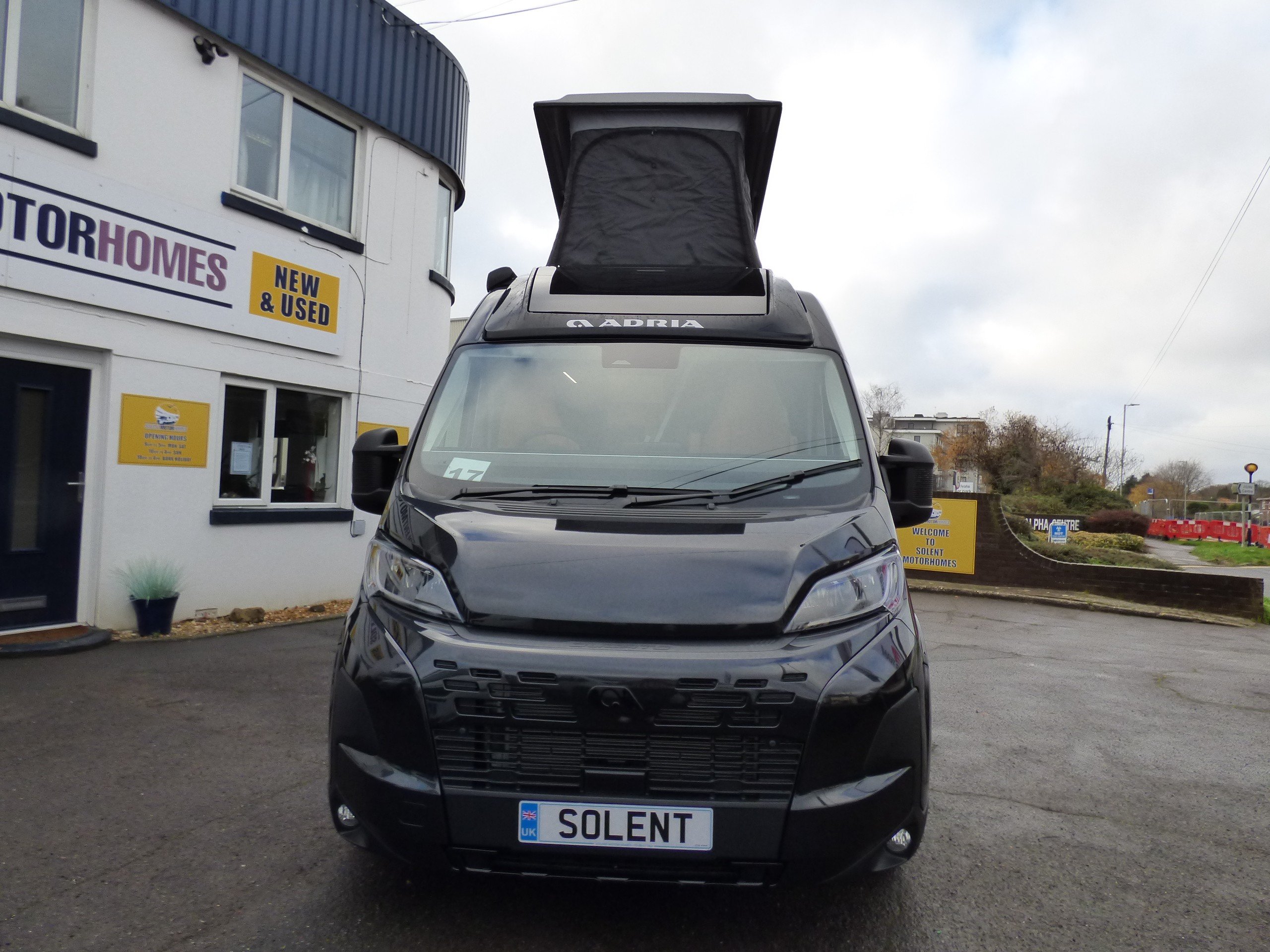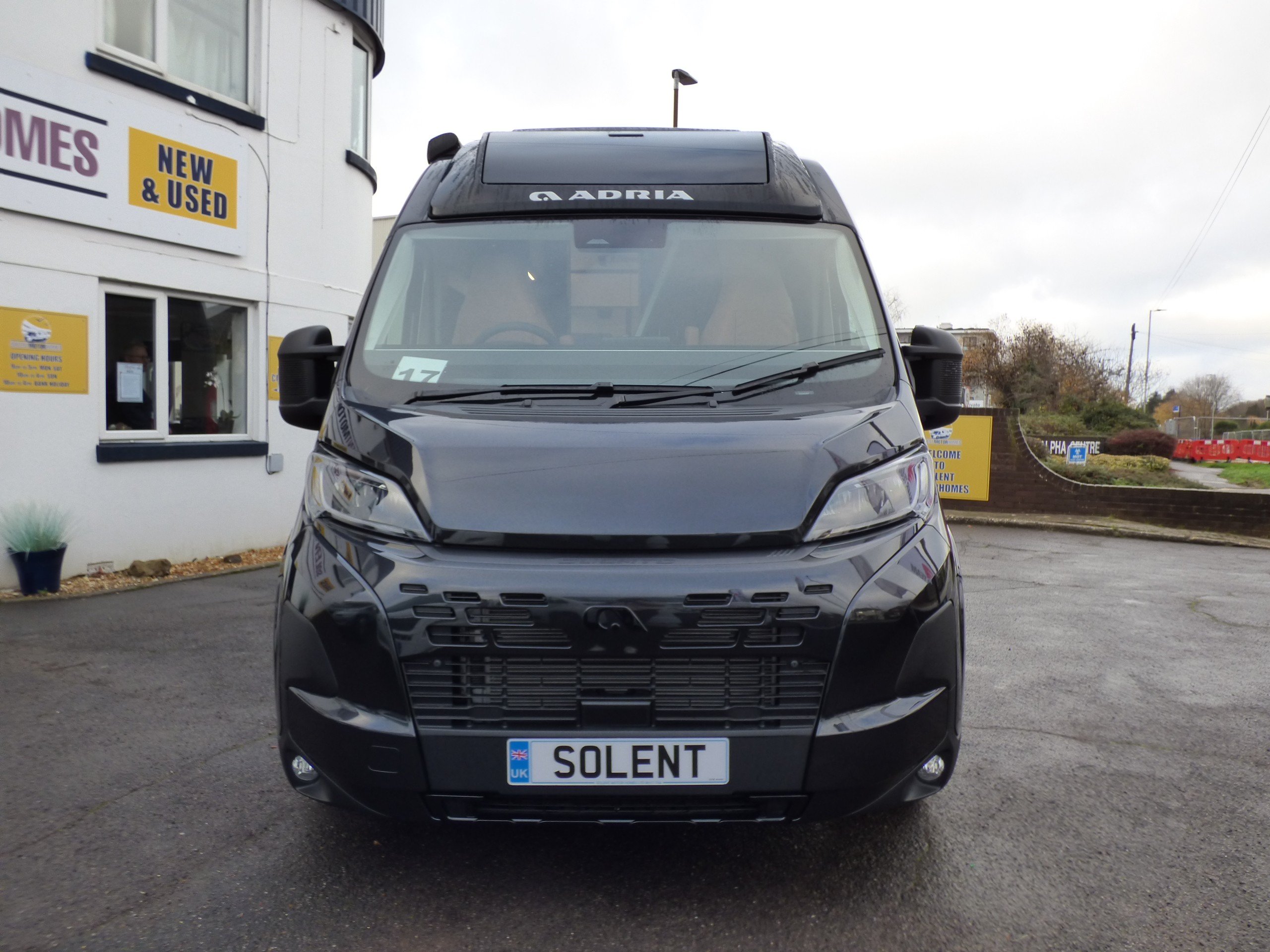 The stunning new 2026 model Adria Twin Sports 640 SLB in stunning Black metallic with Leather Harry Interior is in stock Now! One of the most sought after van conversions on the market, the Twin Sports is a superbly designed and built motorhome at home off the beaten track or travelling on adventures in foreign lands. The thoughtful design means there is a lot of storage space and every inch of the 6.36m is used well. The Twin is Fiat Ducato based featuring the new 2.2l 180bhp engine and 8 speed automatic transmission. Also fitted with the optional Lux pack, it boasts LED headlamps and a full LCD driving display. Behind the swivel seats is a dinette that seats 4 in comfort. A ladder accesses the pop-top roof with a comfortable, large double bed. To the side, the kitchen is fitted with a gas oven/grill, a 2 burner gas hob and a fridge/freezer. Opposite, behind a tambour door is the bathroom with cassette type toilet, wash hand basin and a clever partition for the shower. The bedroom has two single beds that can be used as a large double bed which can be moved out of the way to provide a huge storage area, ideal for transporting bikes. Heating is provided by a diesel heater with hot water by a Truma Combi unit. Other features for this Adria Twin Sports 640 SLB include: Truma Habitation Air Conditioning, Pleated Cab Blinds, Navigation, Carpets, Thule Omnistor wind out awning, Pop-Top roof, Solar Panel, Flyscreen for sliding door, Pack Safety with Adaptive Cruise Control, Twin Leisure Batteries, Add on airbed and Fiat Lux Pack. L. 6.36m, W. 2.05m, H. 2.60m, 3,500kg. 4 Berth, 4 Seatbelts, Delivery Mileage.