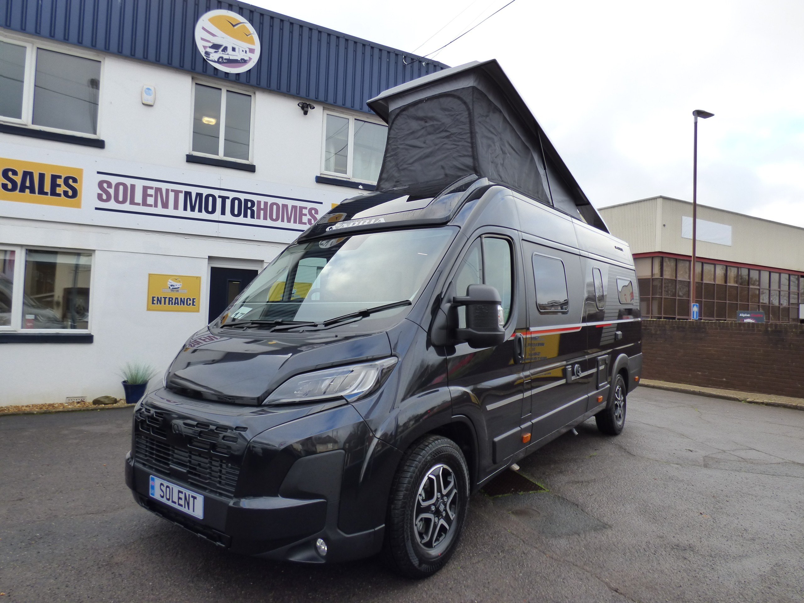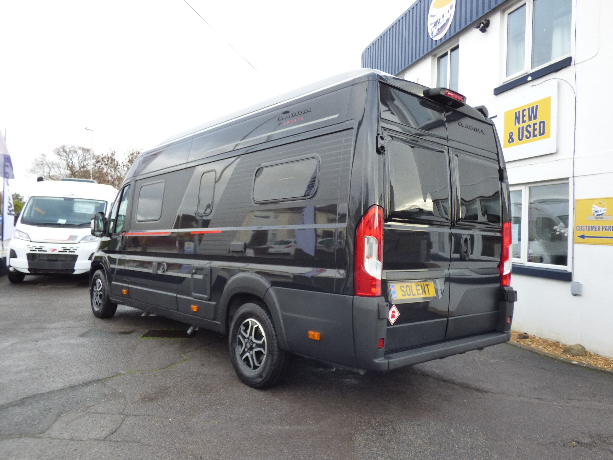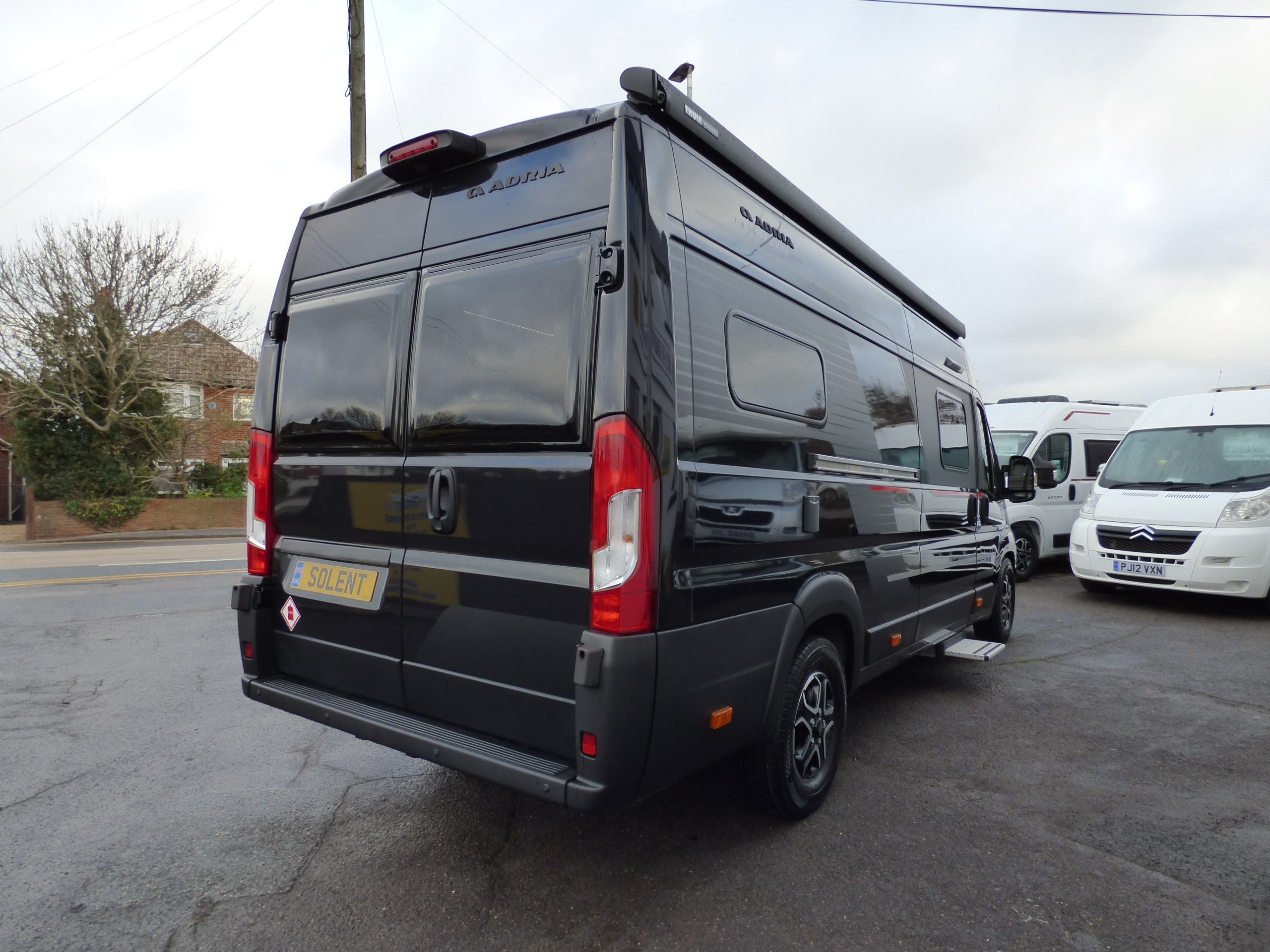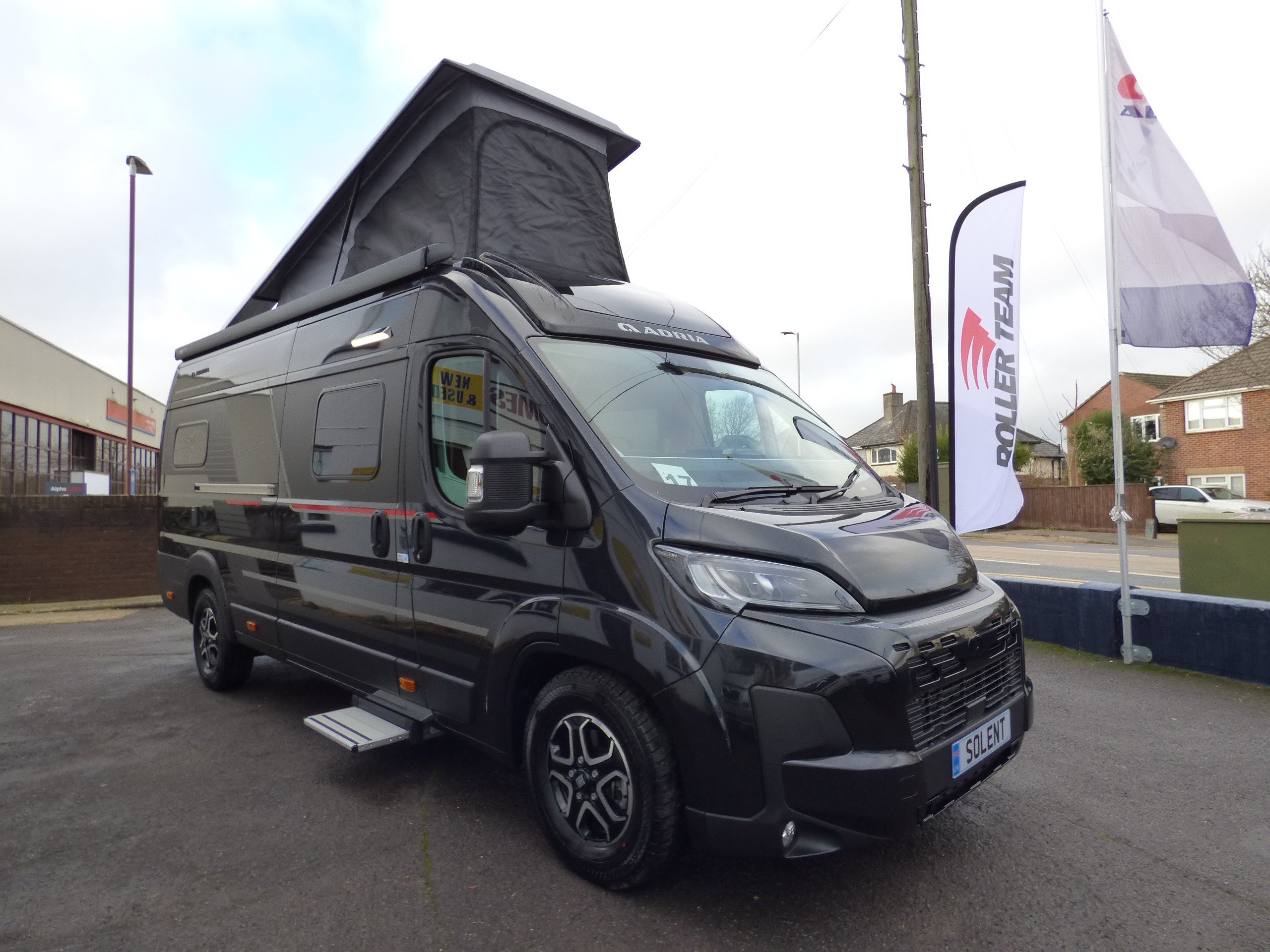 The stunning new 2026 model Adria Twin Sports 640 SLB in stunning Black metallic with Leather Harry Interior is in stock Now! One of the most sought after van conversions on the market, the Twin Sports is a superbly designed and built motorhome at home off the beaten track or travelling on adventures in foreign lands. The thoughtful design means there is a lot of storage space and every inch of the 6.36m is used well. The Twin is Fiat Ducato based featuring the new 2.2l 180bhp engine and 8 speed automatic transmission. Also fitted with the optional Lux pack, it boasts LED headlamps and a full LCD driving display. Behind the swivel seats is a dinette that seats 4 in comfort. A ladder accesses the pop-top roof with a comfortable, large double bed. To the side, the kitchen is fitted with a gas oven/grill, a 2 burner gas hob and a fridge/freezer. Opposite, behind a tambour door is the bathroom with cassette type toilet, wash hand basin and a clever partition for the shower. The bedroom has two single beds that can be used as a large double bed which can be moved out of the way to provide a huge storage area, ideal for transporting bikes. Heating is provided by a diesel heater with hot water by a Truma Combi unit. Other features for this Adria Twin Sports 640 SLB include: Truma Habitation Air Conditioning, Pleated Cab Blinds, Navigation, Carpets, Thule Omnistor wind out awning, Pop-Top roof, Solar Panel, Flyscreen for sliding door, Pack Safety with Adaptive Cruise Control, Twin Leisure Batteries, Add on airbed and Fiat Lux Pack. L. 6.36m, W. 2.05m, H. 2.60m, 3,500kg. 4 Berth, 4 Seatbelts, Delivery Mileage.