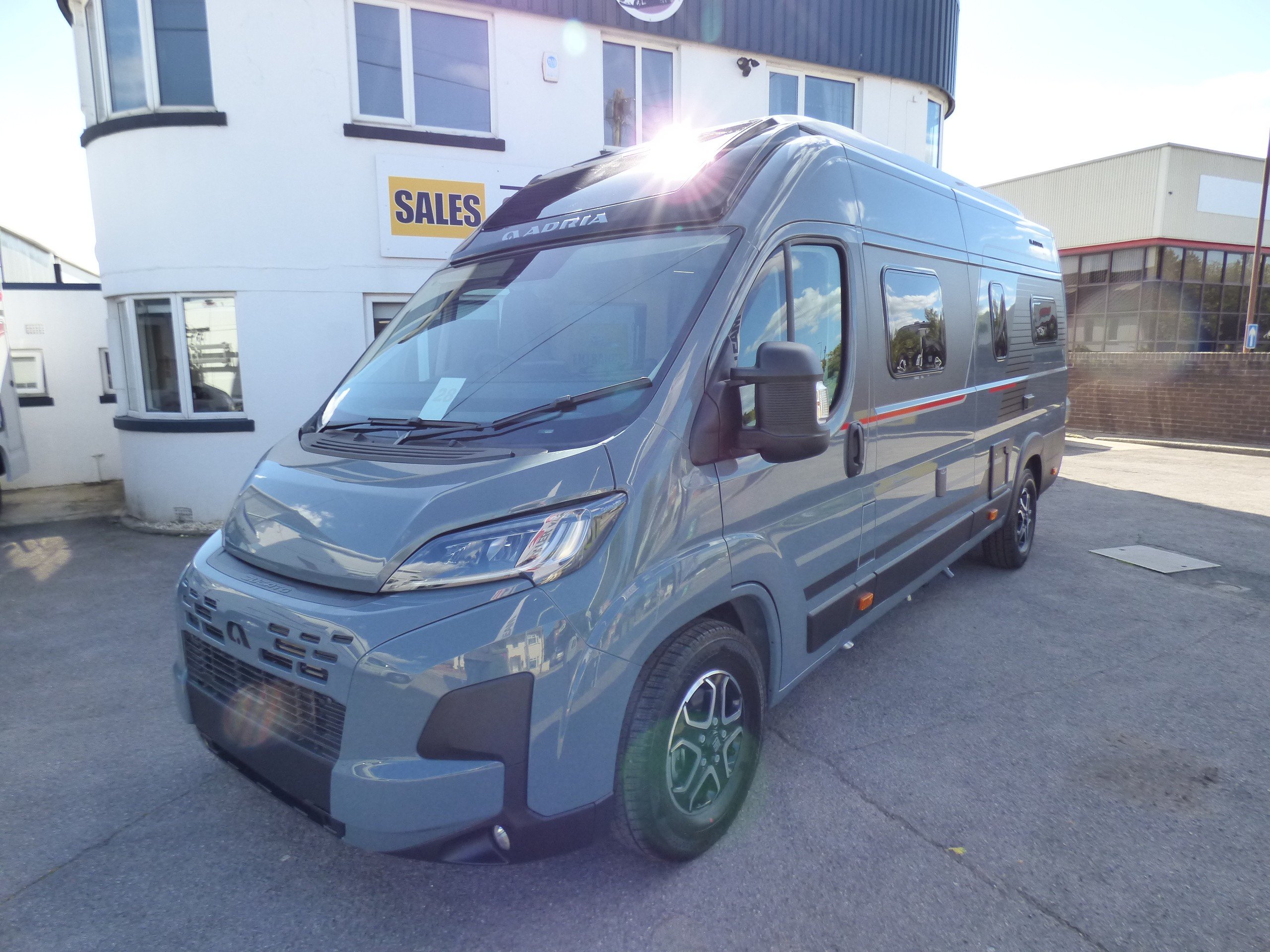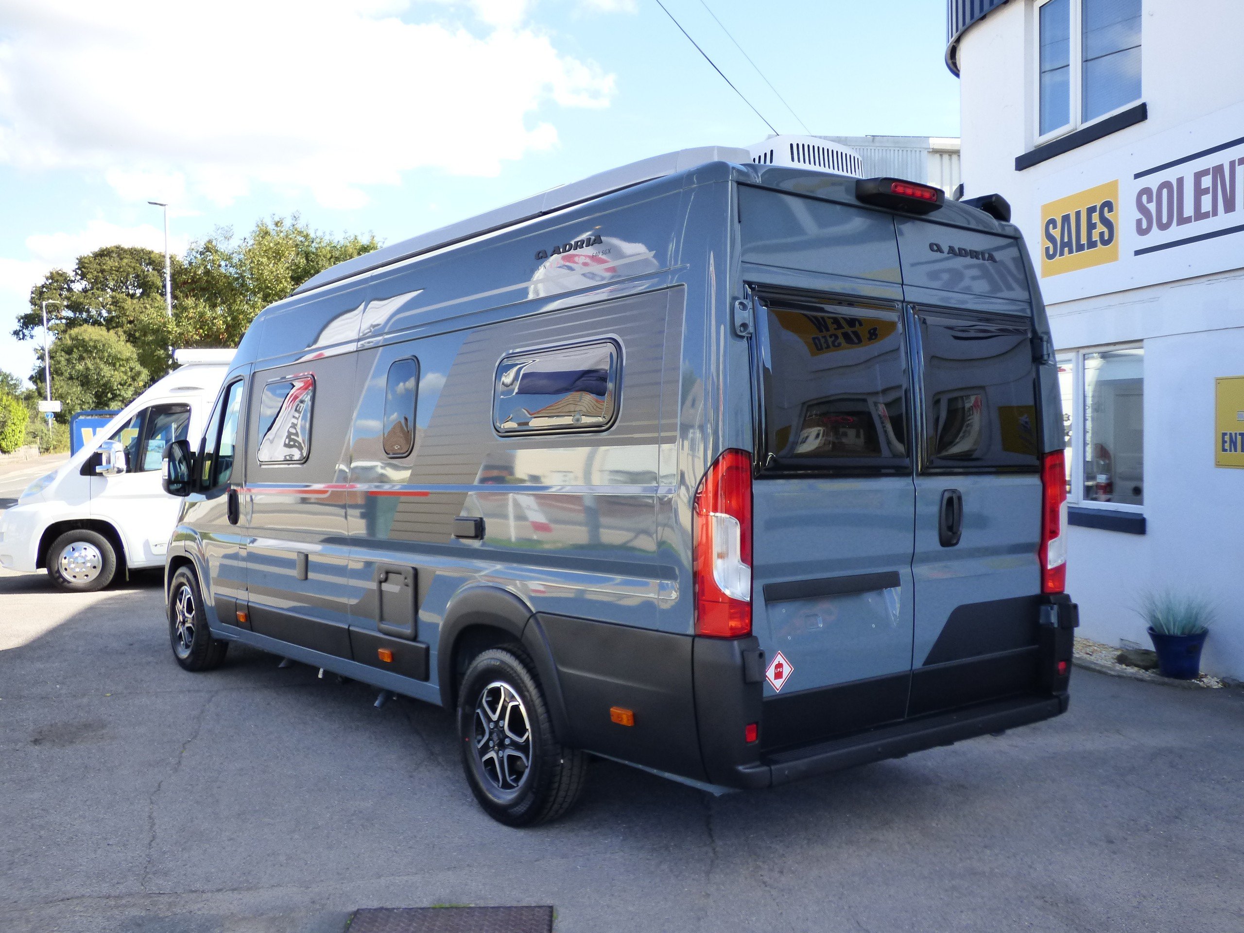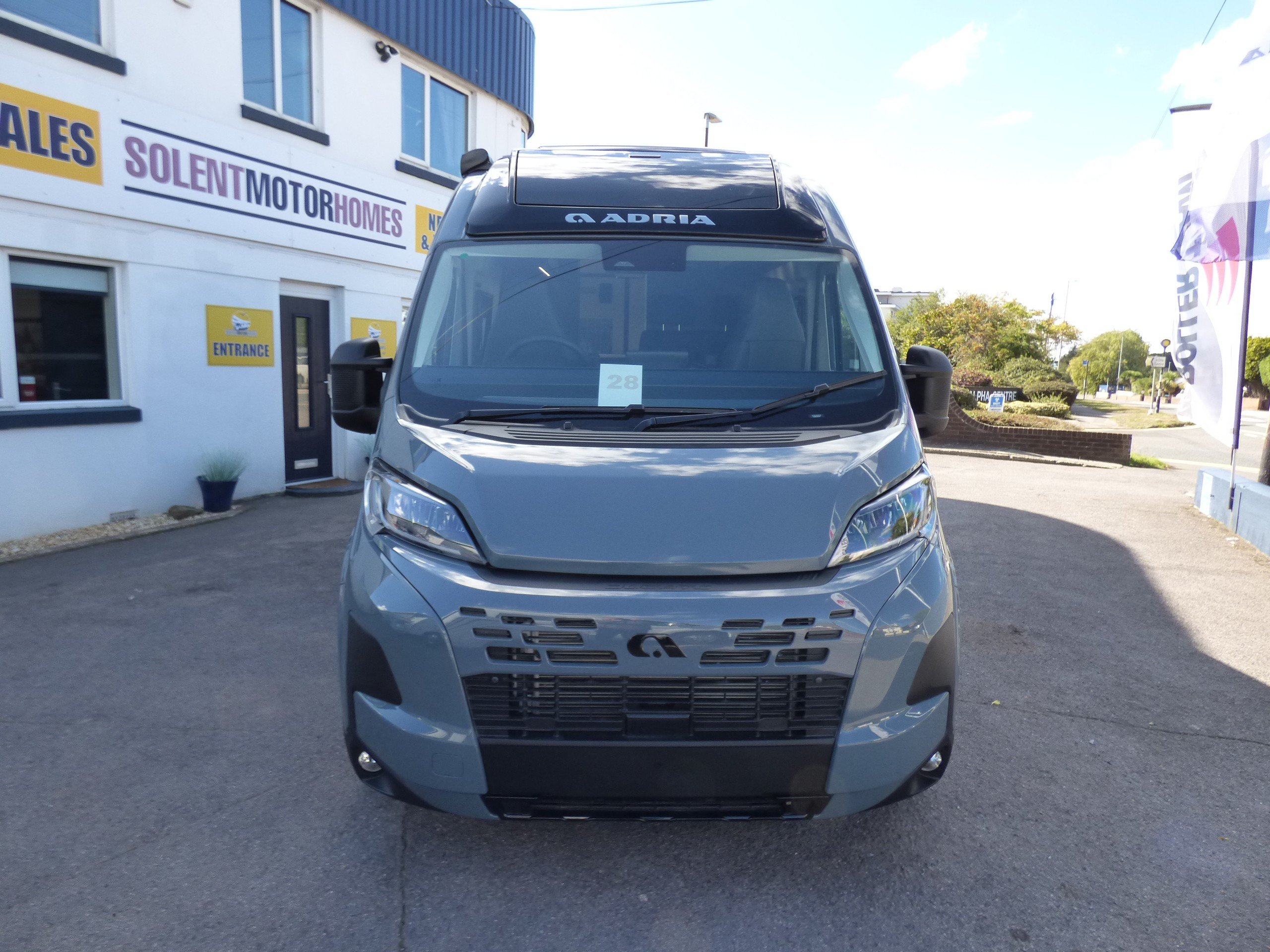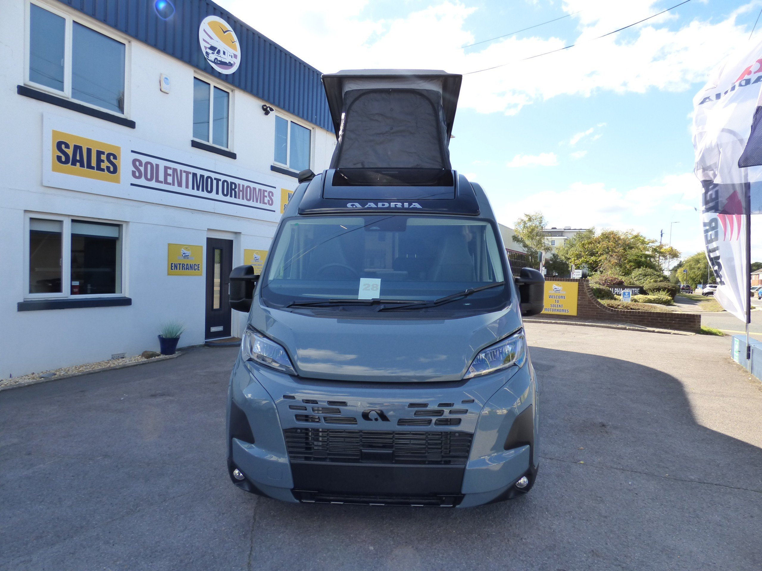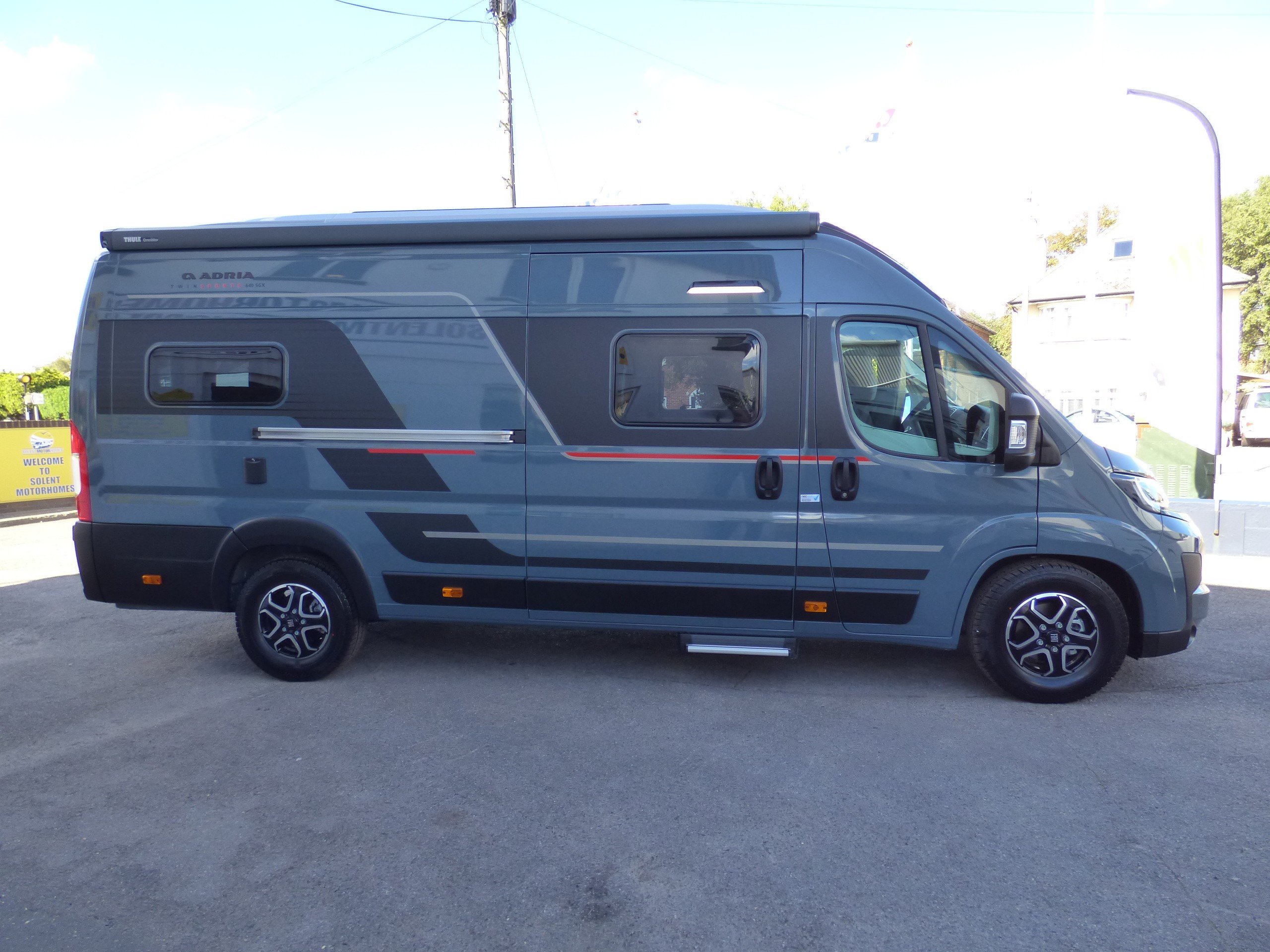 The stunning new 2026 model Adria Twin Sports 640 SGX is in stock now at Solent. One of the most sought after van conversions on the market, the Twin Sports is a superbly designed and built motorhome at home off the beaten track or travelling on adventures in foreign lands. The thoughtful design means there is a lot of storage space and every inch of the 6.36m is used well. The Twin is Fiat Ducato based featuring the new 2.2l 180bhp engine and 8 speed automatic transmission. Also fitted with the optional Lux pack, it boasts LED headlamps and a full LCD driving display. Behind the swivel seats is a dinette that seats 4 in comfort. A ladder accesses the pop-top roof with a comfortable, large double bed. To the side, the kitchen is fitted with a gas oven/grill, a 2 burner gas hob and a fridge/freezer. Opposite, behind a tambour door is the bathroom with cassette type toilet, wash hand basin and a clever partition for the shower. The bedroom has a large electric elevating double bed which can be moved out of the way to provide a huge storage area, ideal for transporting bikes. Heating is provided by a diesel heater with hot water by a Whale Gas boiler. Other features for this Adria Twin Sports 640 SGX include: Truma Habitation Air Conditioning, Pleated Cab Blinds, Navigation, Carpets, Thule Omnistor wind out awning, Pop-Top roof, Solar Panel, Flyscreen for sliding door, Larger 138l Fridge/freezer, Twin Leisure Batteries, Pull out platform, Heated Mattress and Insulation Canvas for Pop Top, Leather upholstery and Fiat Lux Pack. L. 6.36m, W. 2.05m, H. 2.60m, 3,500kg. 4 Berth, 4 Seatbelts, Delivery Mileage. Free Solent Pack worth £1655 comprising Scorpion S5 Alarm & Tracker, 22" Falcon Smart TV, Falcon Soundbar and Falcon 4G motorhome WiFi!
