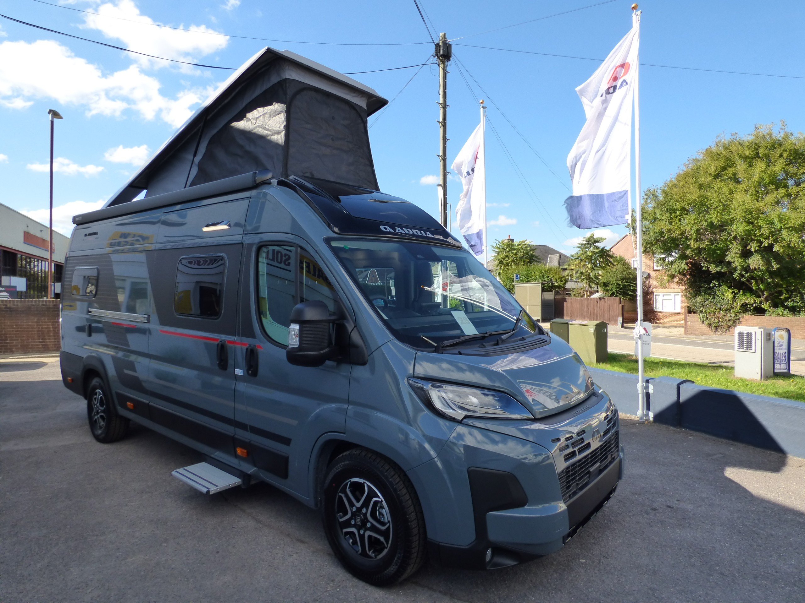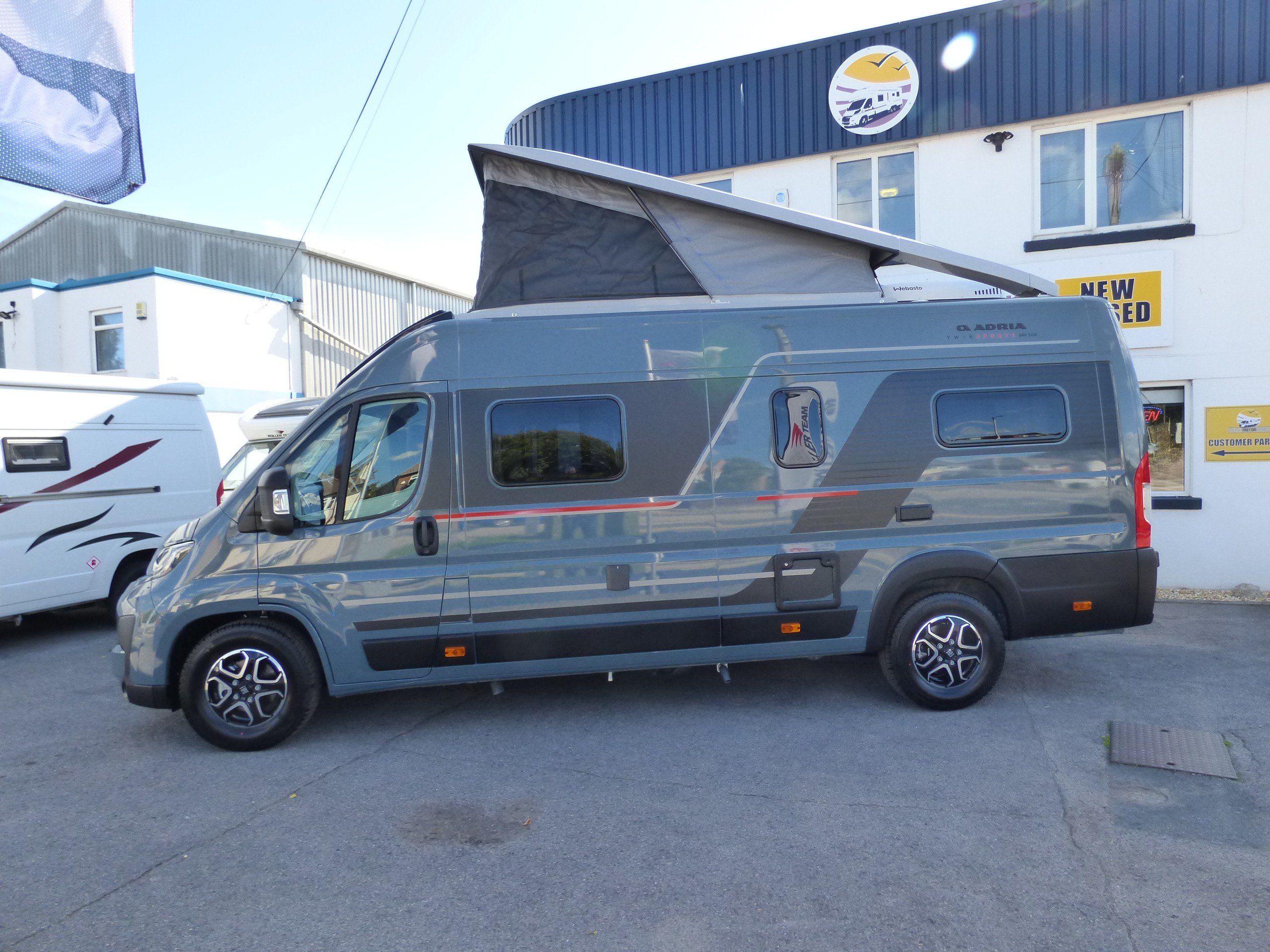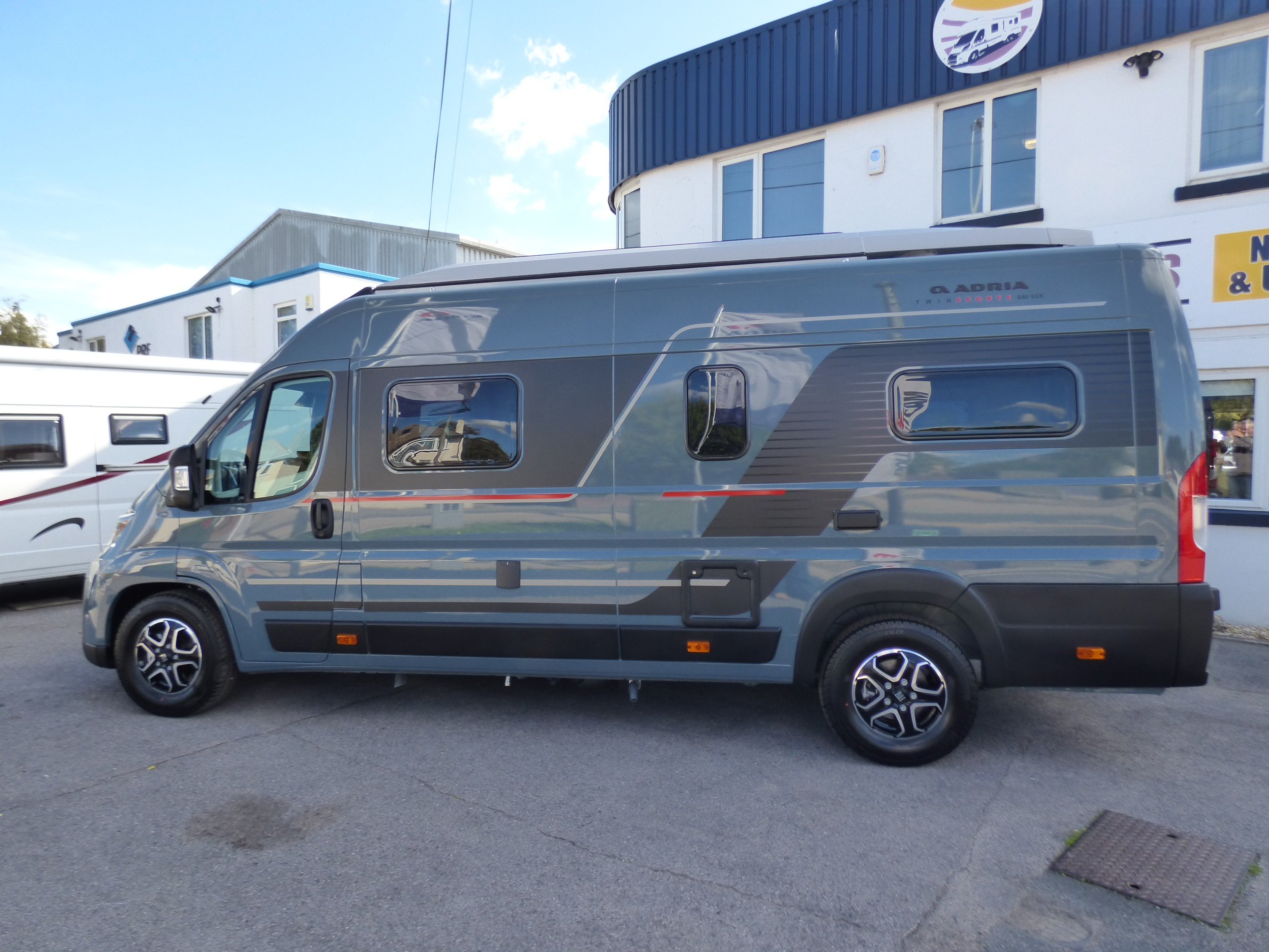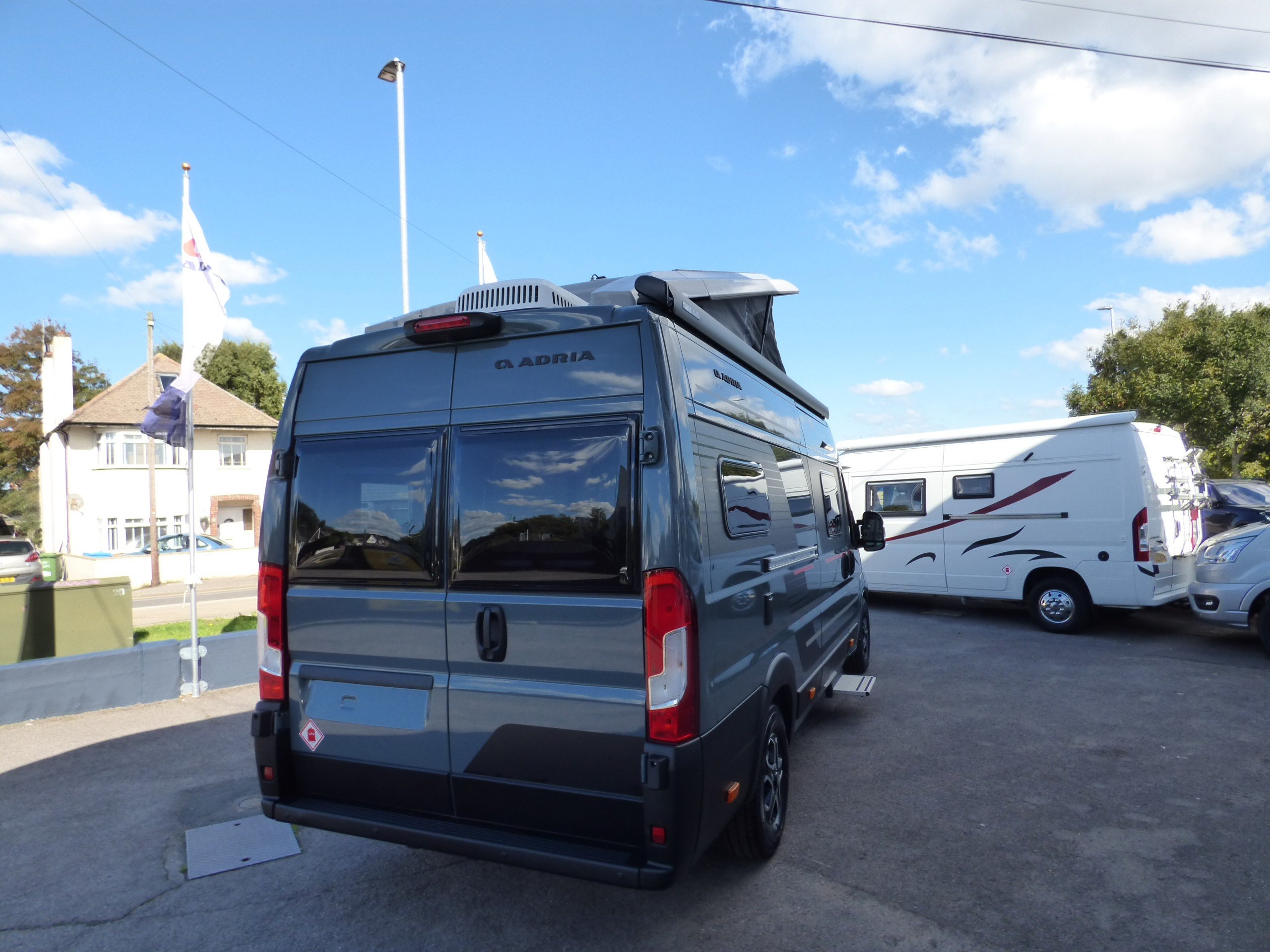 The stunning new 2026 model Adria Twin Sports 640 SGX is in stock now at Solent. One of the most sought after van conversions on the market, the Twin Sports is a superbly designed and built motorhome at home off the beaten track or travelling on adventures in foreign lands. The thoughtful design means there is a lot of storage space and every inch of the 6.36m is used well. The Twin is Fiat Ducato based featuring the new 2.2l 180bhp engine and 8 speed automatic transmission. Also fitted with the optional Lux pack, it boasts LED headlamps and a full LCD driving display. Behind the swivel seats is a dinette that seats 4 in comfort. A ladder accesses the pop-top roof with a comfortable, large double bed. To the side, the kitchen is fitted with a gas oven/grill, a 2 burner gas hob and a fridge/freezer. Opposite, behind a tambour door is the bathroom with cassette type toilet, wash hand basin and a clever partition for the shower. The bedroom has a large electric elevating double bed which can be moved out of the way to provide a huge storage area, ideal for transporting bikes. Heating is provided by a diesel heater with hot water by a Whale Gas boiler. Other features for this Adria Twin Sports 640 SGX include: Truma Habitation Air Conditioning, Pleated Cab Blinds, Navigation, Carpets, Thule Omnistor wind out awning, Pop-Top roof, Solar Panel, Flyscreen for sliding door, Larger 138l Fridge/freezer, Twin Leisure Batteries, Pull out platform, Heated Mattress and Insulation Canvas for Pop Top, Leather upholstery and Fiat Lux Pack. L. 6.36m, W. 2.05m, H. 2.60m, 3,500kg. 4 Berth, 4 Seatbelts, Delivery Mileage. Free Solent Pack worth £1655 comprising Scorpion S5 Alarm & Tracker, 22" Falcon Smart TV, Falcon Soundbar and Falcon 4G motorhome WiFi!