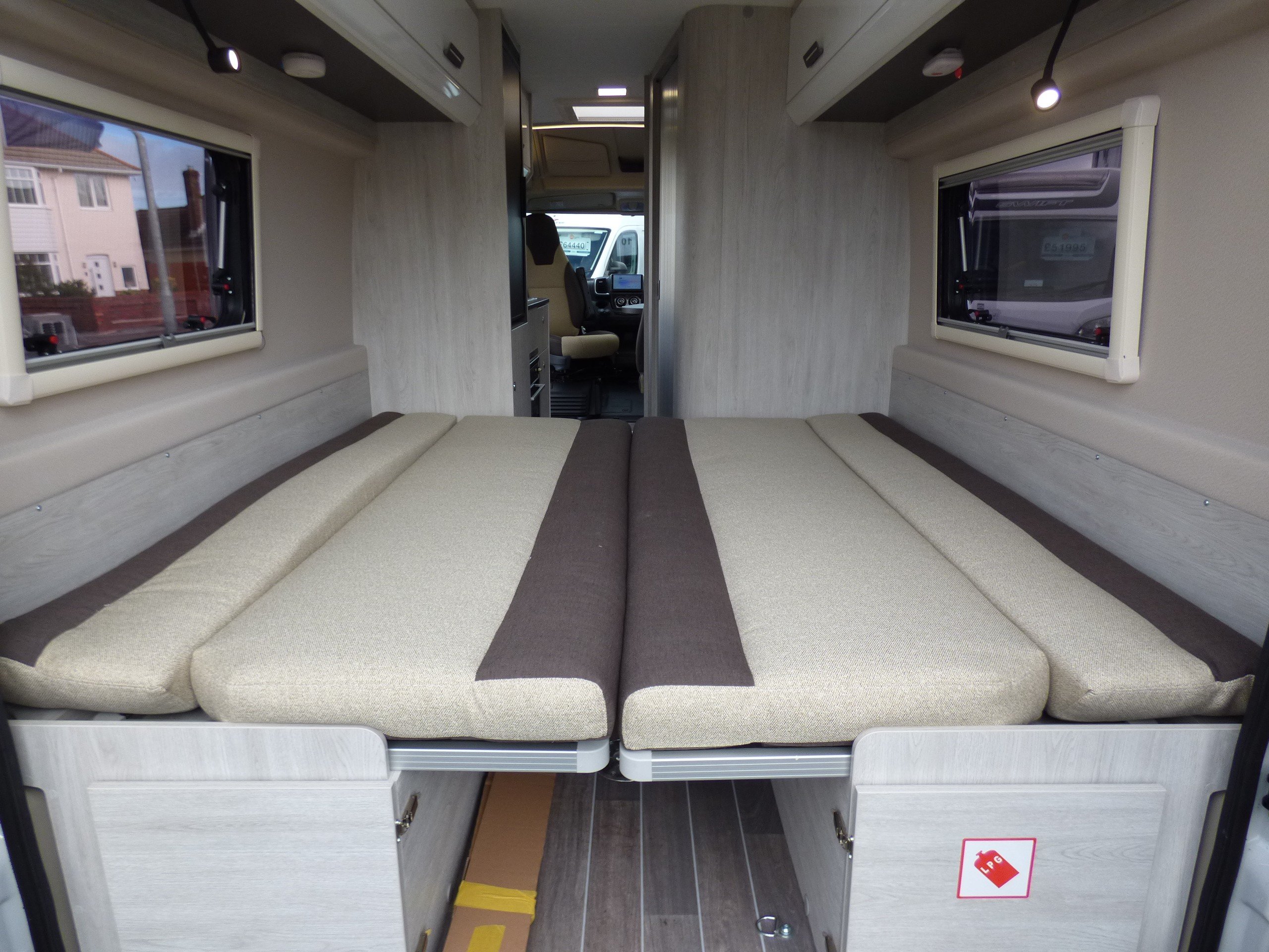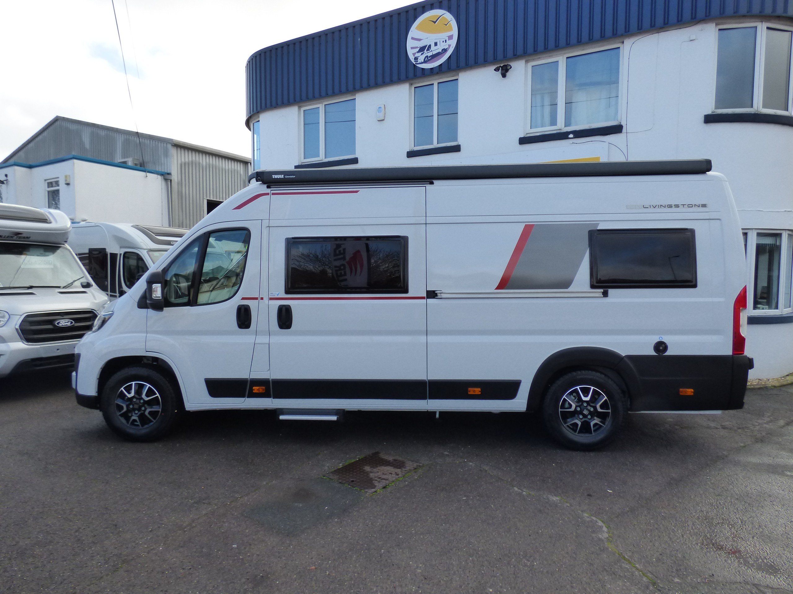 Step inside the all new for 2026 Livingstone Duo and enter a world of refined comfort and practicality. Whether you’re exploring rugged coastlines or serene countryside, this campervan transforms every trip into a chic, unforgettable adventure, inviting you to discover the joy of the journey with sophistication and ease. Based on the Fiat Ducato chassis with 140bhp engine and 8 speed automatic transmission, the Livingstone Duo is laid out for 4 to travel in comfort with the front seats swivelling to form a dinette and the side kitchen fitted with a 90l dual access fridge, single gas burner hob and a gas oven. Opposite the bathroom features a folding door and fold away sink above a cassette type toilet and a wet room style shower cubicle. The rear twin beds can be joined together or left as singles enabling larger items, bikes etc. to be carried. Ample cupboard space throughout and heating is via a Webasto diesel system with dual fuel water heating. Other features of this Livingstone Duo include: Alloy wheels, Pioneer infotainent/sat nav, wind out awning, solar panel, pleated cab blinds, electric step and the latest Fiat cab. L. 6.36m, W. 2.05m, H, 2.85m, 3,500kg. 3 berth, 4 seat belts. Delivery Miles.