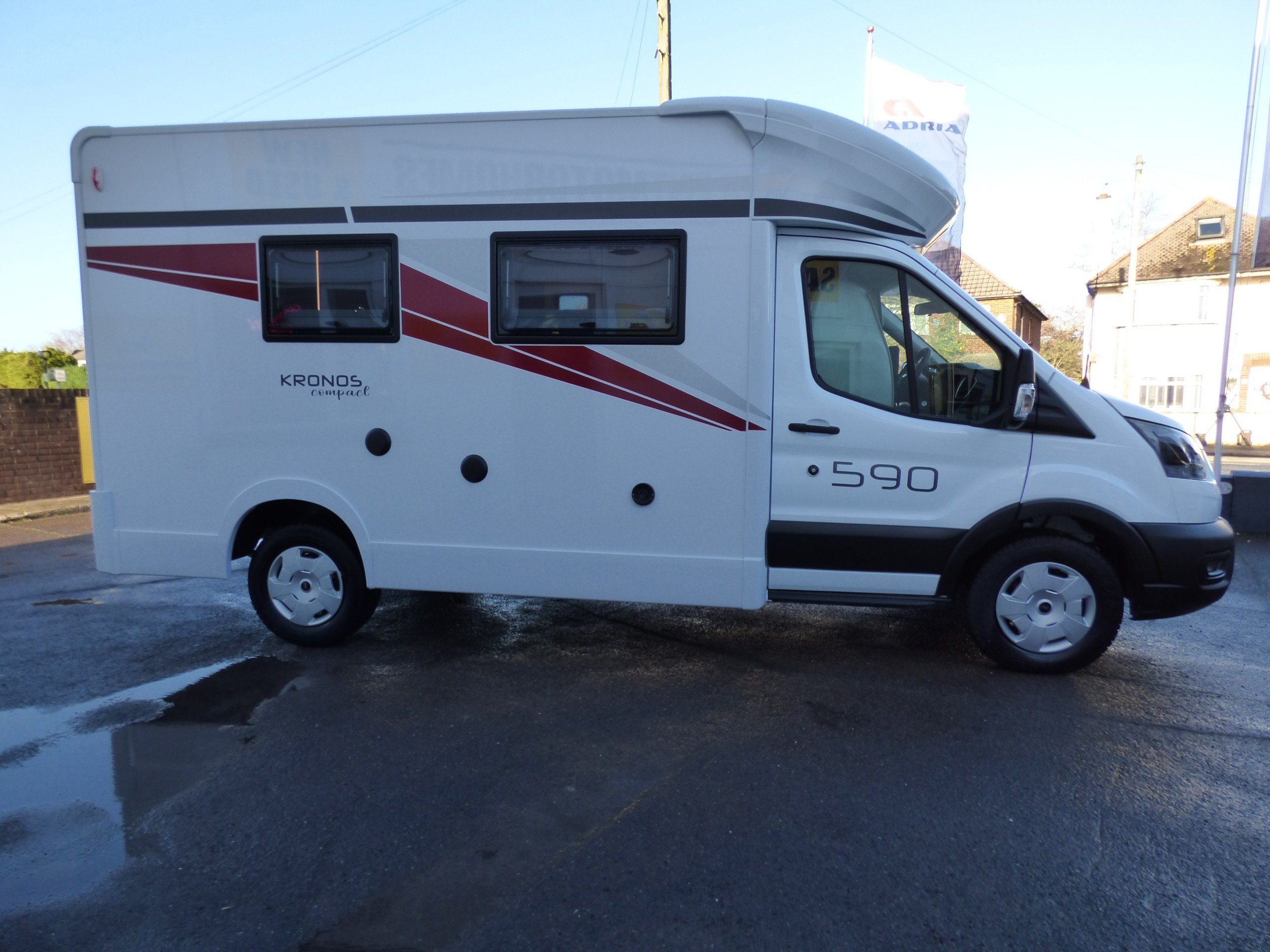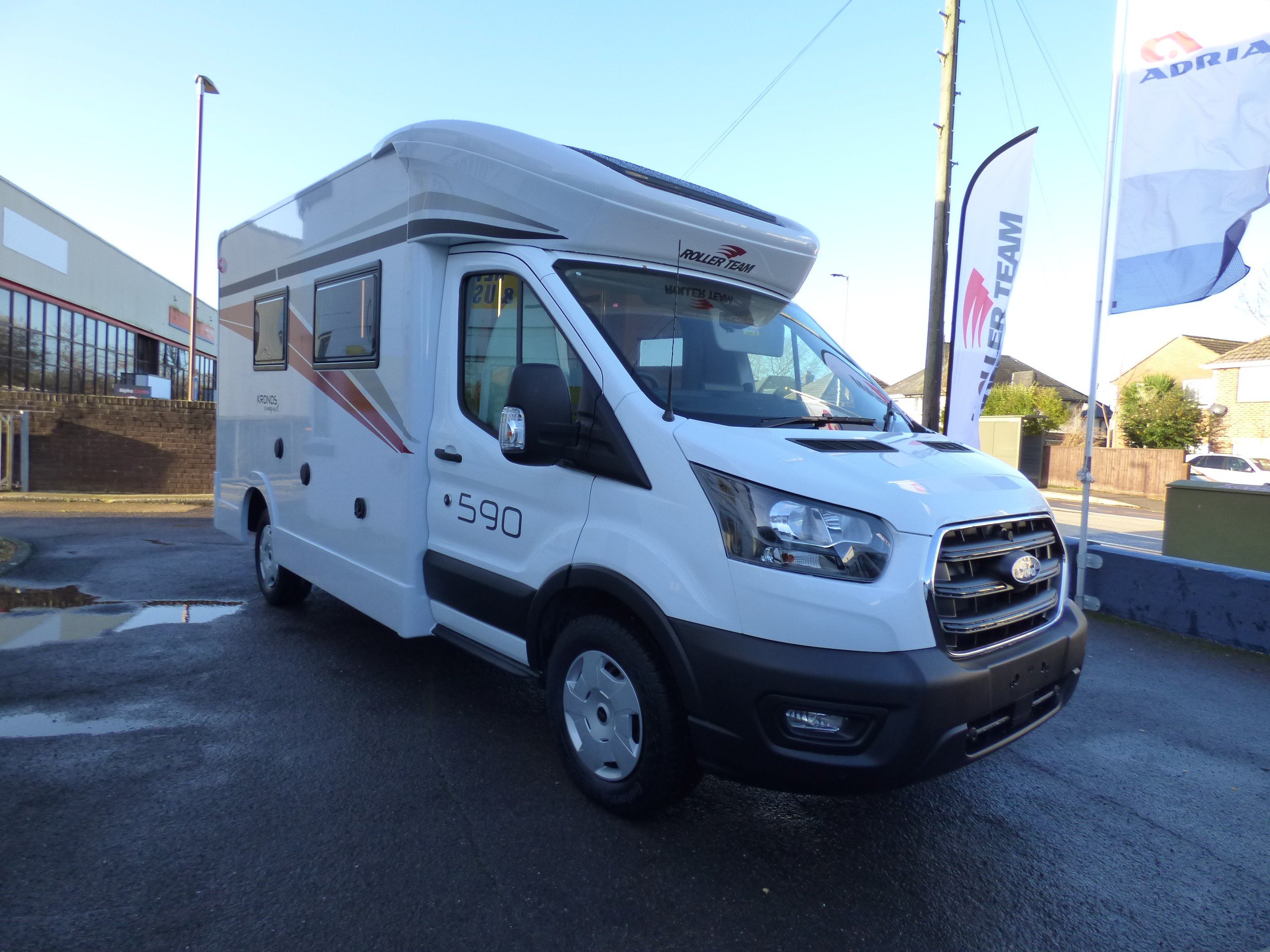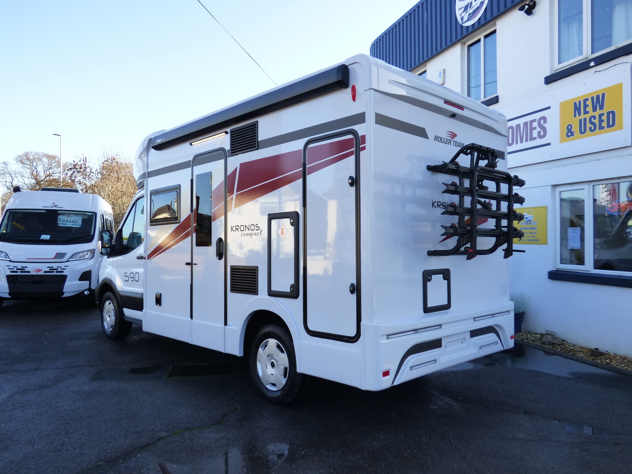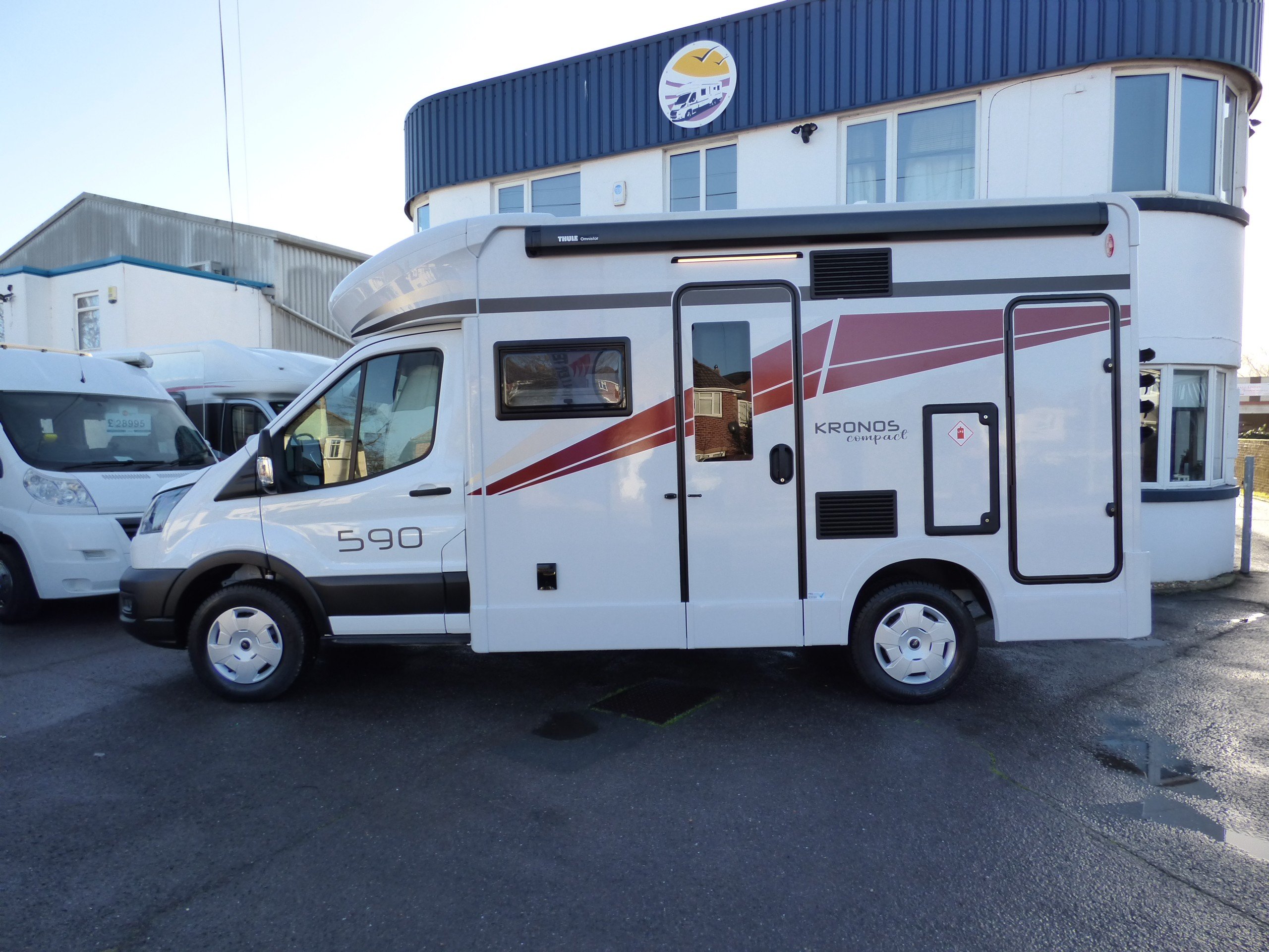 The all new Kronos 590 Compact from Roller Team - based latest Ford Transit chassis with 130bhp engine and 6 speed manual transmission and fitted with the new 12" Ford infotainment system providing Apple Car Play and Android Auto, the new model also has front parking sensors and a new digital dashboard. The two front seats swivel to face the lounge where two opposing sofas form a surprisingly large dining and lounge area and also convert to a double bed for evening use and contain two further travelling seats with an electric elevating double bed over. The kitchen behind has a 2 burner gas hob, stainless steel sink with cover, Thetford gas oven/grill and large fridge/freezer. To the rear the bathroom has a separate shower cubicle, cassette type toilet and wash hand basin with cupboard space and access to the rear garage. Heating and hot water is via a Truma dual fuel system and other features for this Kronos 590 include: 200w Solar panel with MPPT controller, Reversing Camera, WiFi, Carpets, electric adjustable lounge table and Sat Nav/Infotainment system, Thule 4 bike rack, TV bracket and Thule wind out awning. 4 Berth, 4 seat belts. L. 5.99m, W. 2.15m, H. 2.85m, 3,500kg, delivery miles.