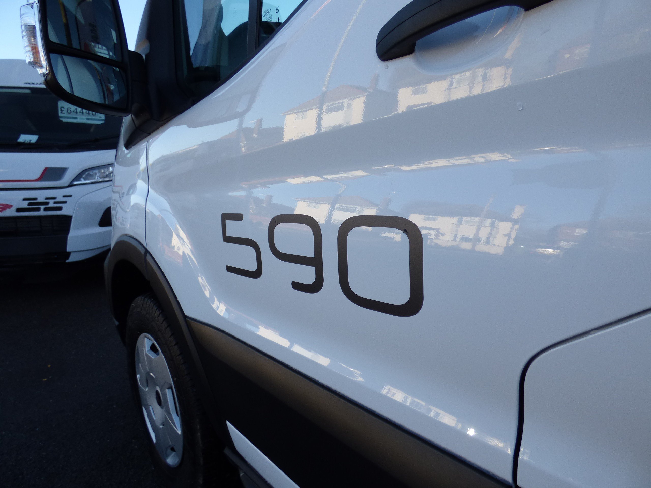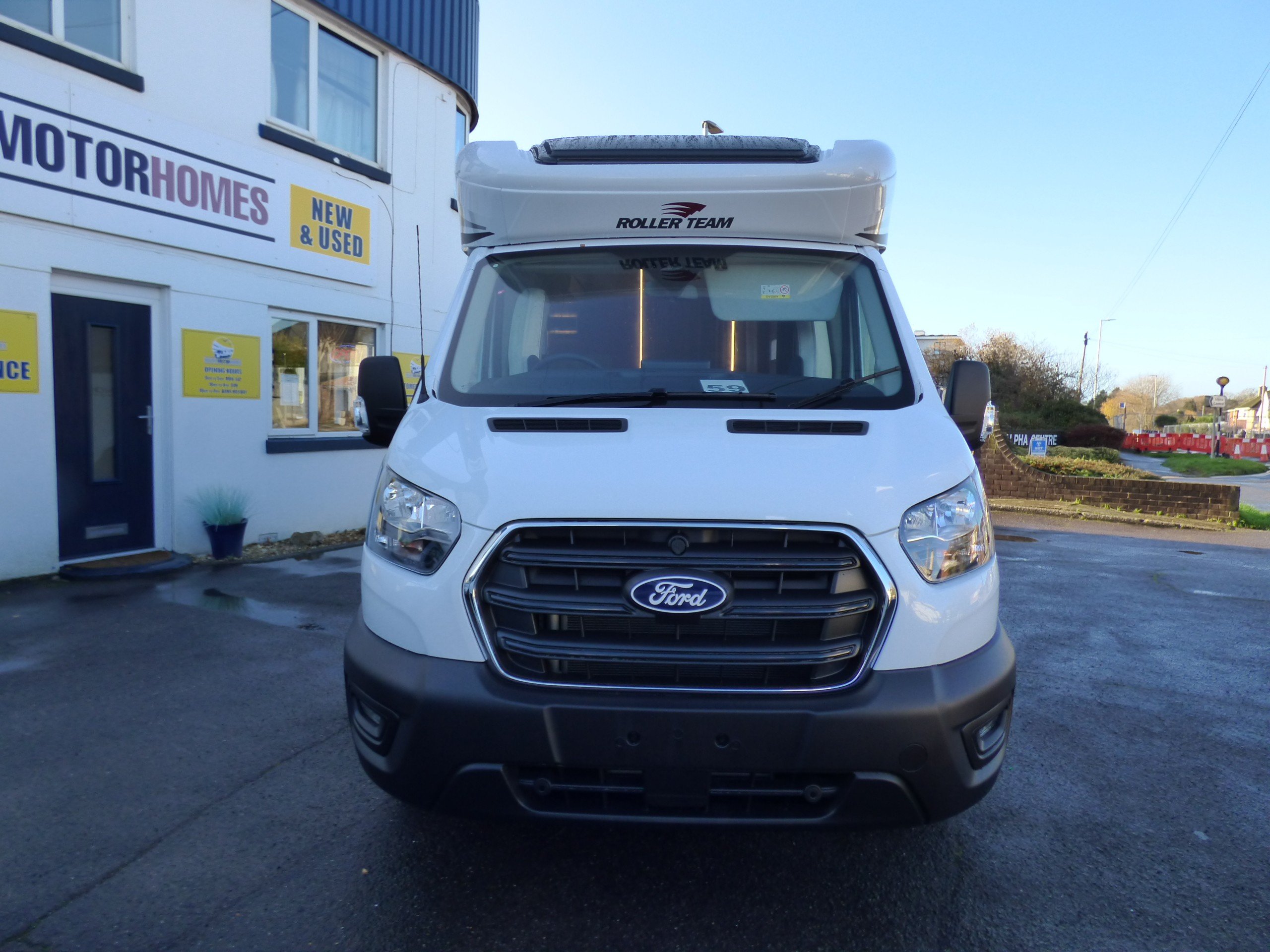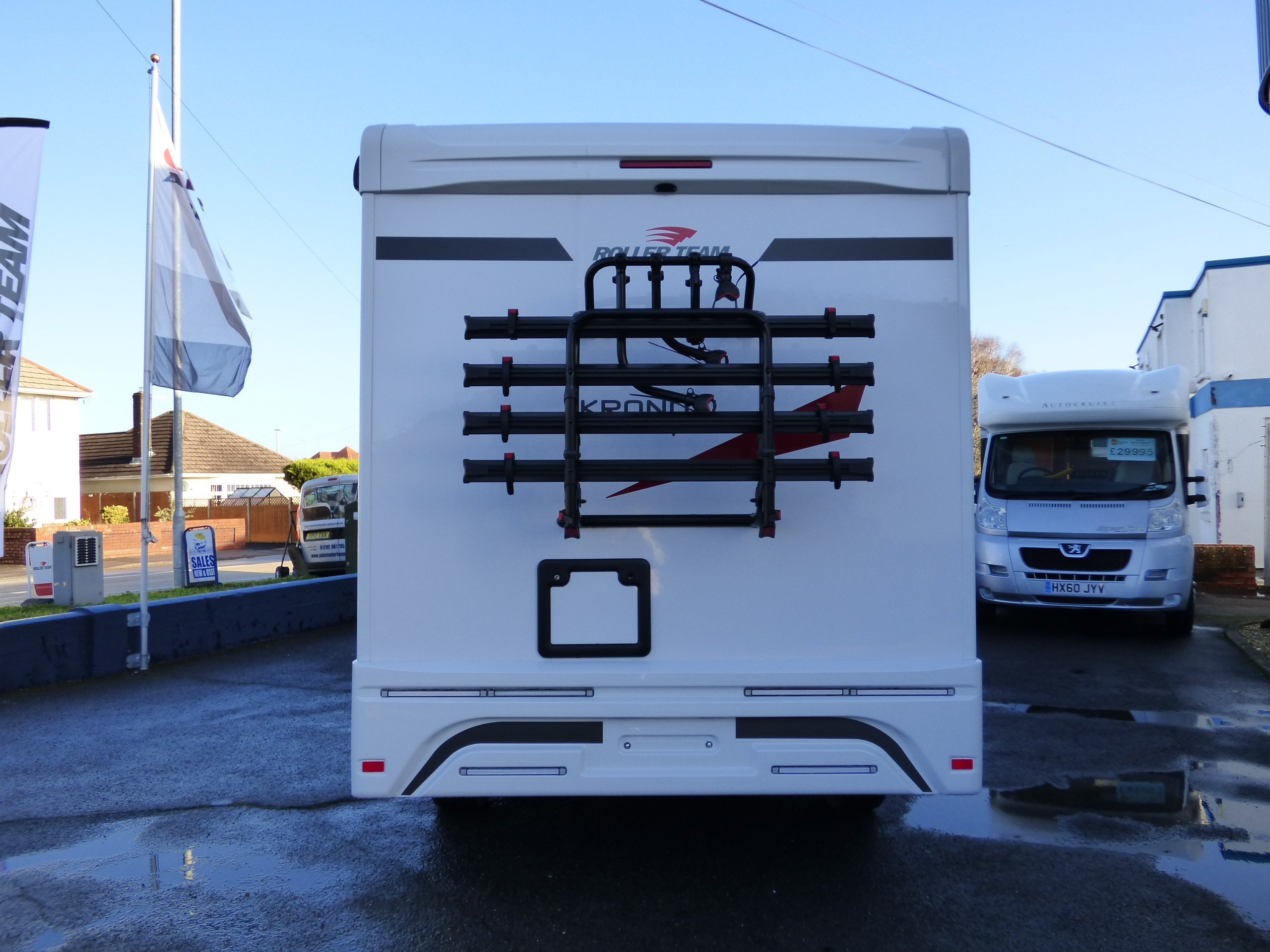 The all new Kronos 590 Compact from Roller Team - based latest Ford Transit chassis with 130bhp engine and 6 speed manual transmission and fitted with the new 12" Ford infotainment system providing Apple Car Play and Android Auto, the new model also has front parking sensors and a new digital dashboard. The two front seats swivel to face the lounge where two opposing sofas form a surprisingly large dining and lounge area and also convert to a double bed for evening use and contain two further travelling seats with an electric elevating double bed over. The kitchen behind has a 2 burner gas hob, stainless steel sink with cover, Thetford gas oven/grill and large fridge/freezer. To the rear the bathroom has a separate shower cubicle, cassette type toilet and wash hand basin with cupboard space and access to the rear garage. Heating and hot water is via a Truma dual fuel system and other features for this Kronos 590 include: 200w Solar panel with MPPT controller, Reversing Camera, WiFi, Carpets, electric adjustable lounge table and Sat Nav/Infotainment system, Thule 4 bike rack, TV bracket and Thule wind out awning. 4 Berth, 4 seat belts. L. 5.99m, W. 2.15m, H. 2.85m, 3,500kg, delivery miles.
