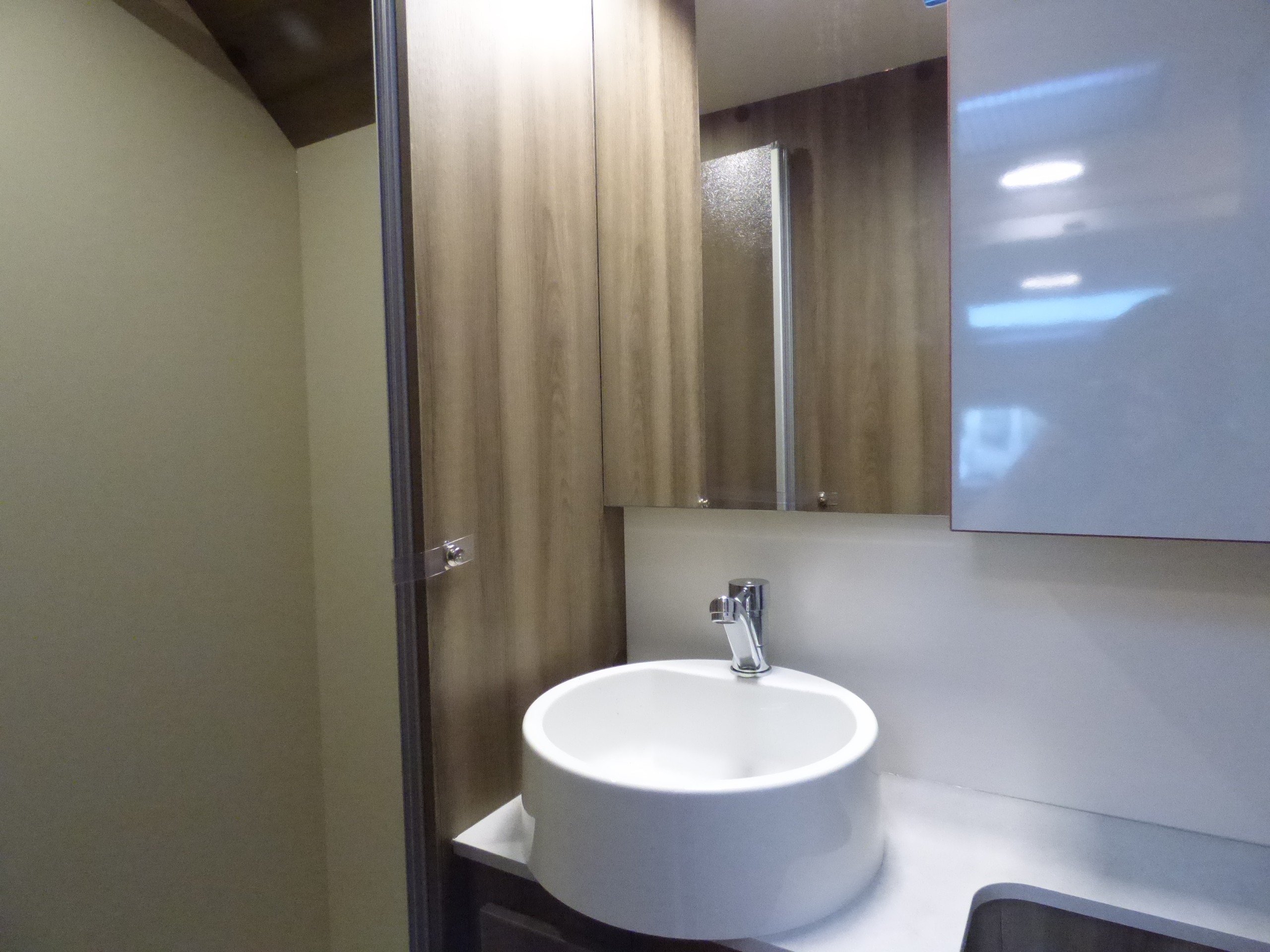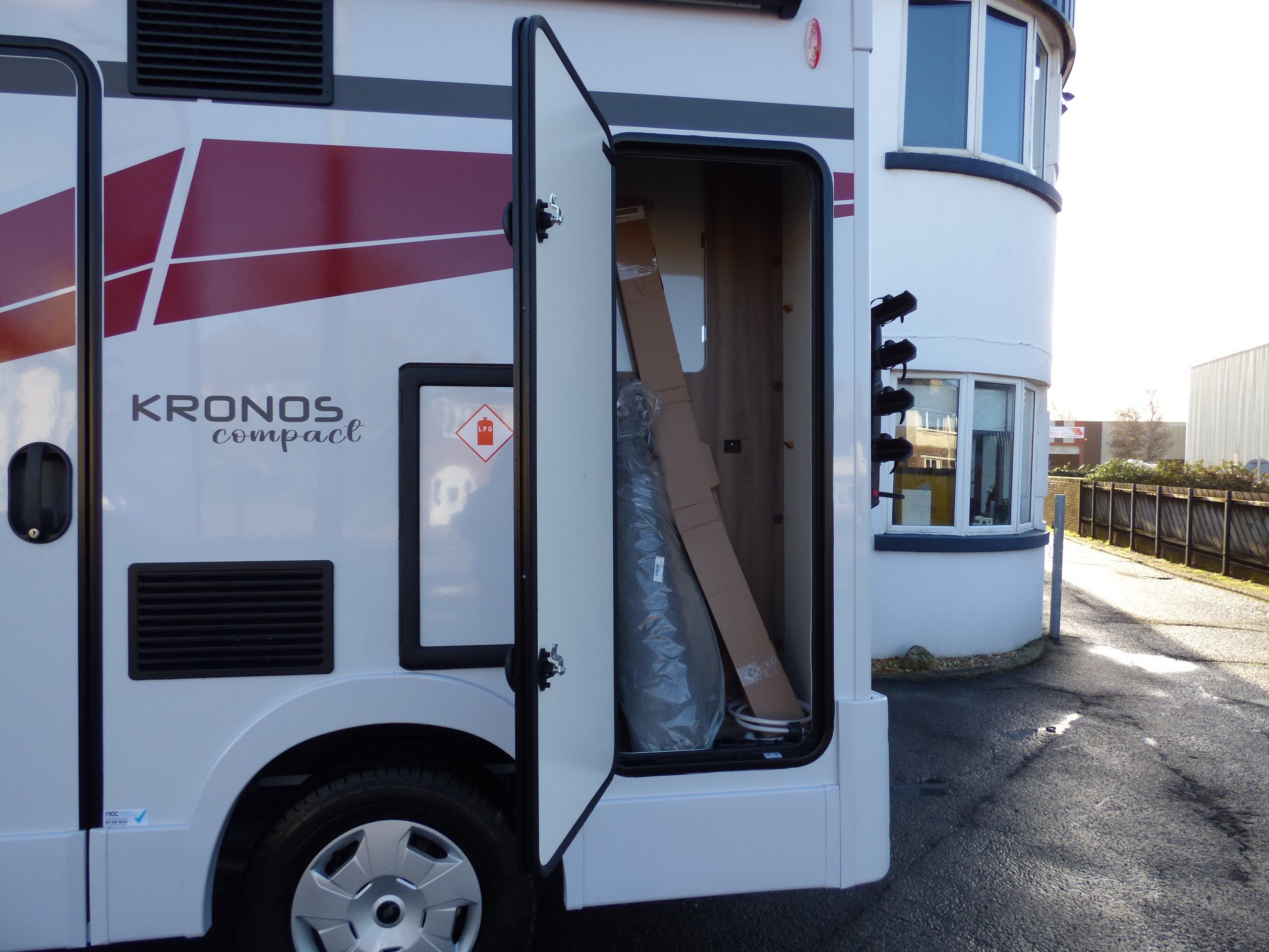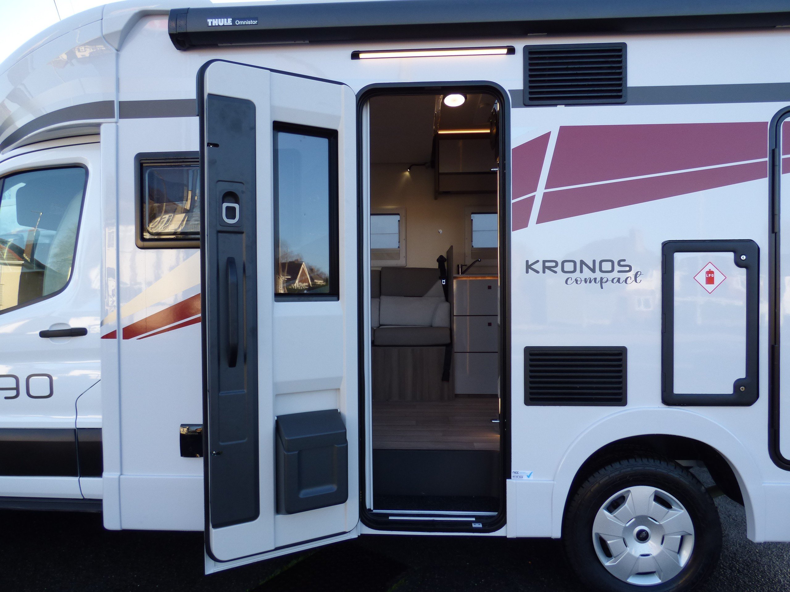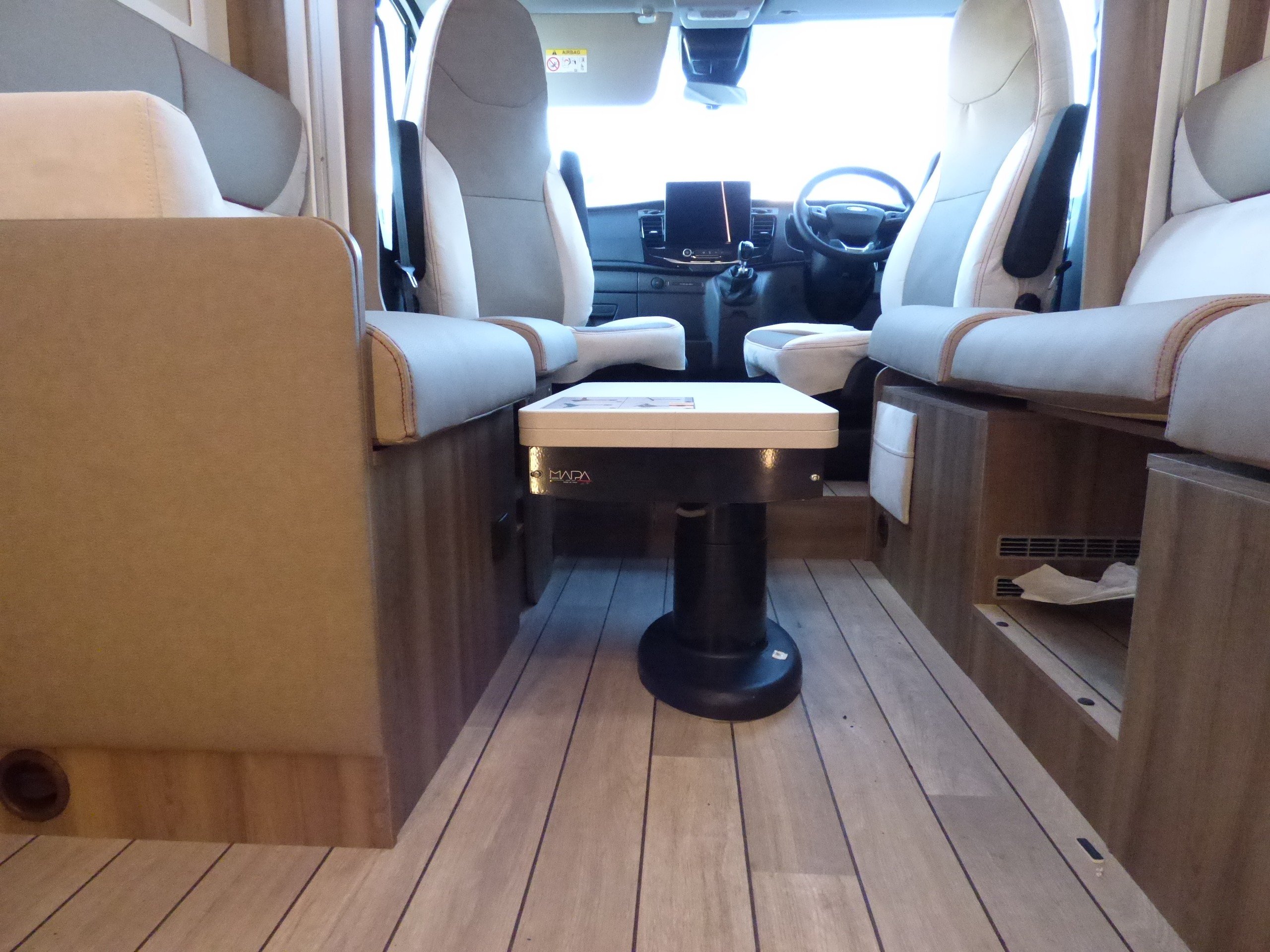 The all new Kronos 590 Compact from Roller Team - based latest Ford Transit chassis with 130bhp engine and 6 speed manual transmission and fitted with the new 12" Ford infotainment system providing Apple Car Play and Android Auto, the new model also has front parking sensors and a new digital dashboard. The two front seats swivel to face the lounge where two opposing sofas form a surprisingly large dining and lounge area and also convert to a double bed for evening use and contain two further travelling seats with an electric elevating double bed over. The kitchen behind has a 2 burner gas hob, stainless steel sink with cover, Thetford gas oven/grill and large fridge/freezer. To the rear the bathroom has a separate shower cubicle, cassette type toilet and wash hand basin with cupboard space and access to the rear garage. Heating and hot water is via a Truma dual fuel system and other features for this Kronos 590 include: 200w Solar panel with MPPT controller, Reversing Camera, WiFi, Carpets, electric adjustable lounge table and Sat Nav/Infotainment system, Thule 4 bike rack, TV bracket and Thule wind out awning. 4 Berth, 4 seat belts. L. 5.99m, W. 2.15m, H. 2.85m, 3,500kg, delivery miles.