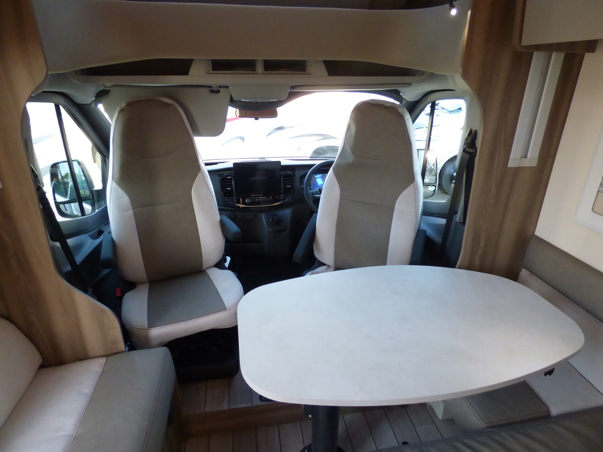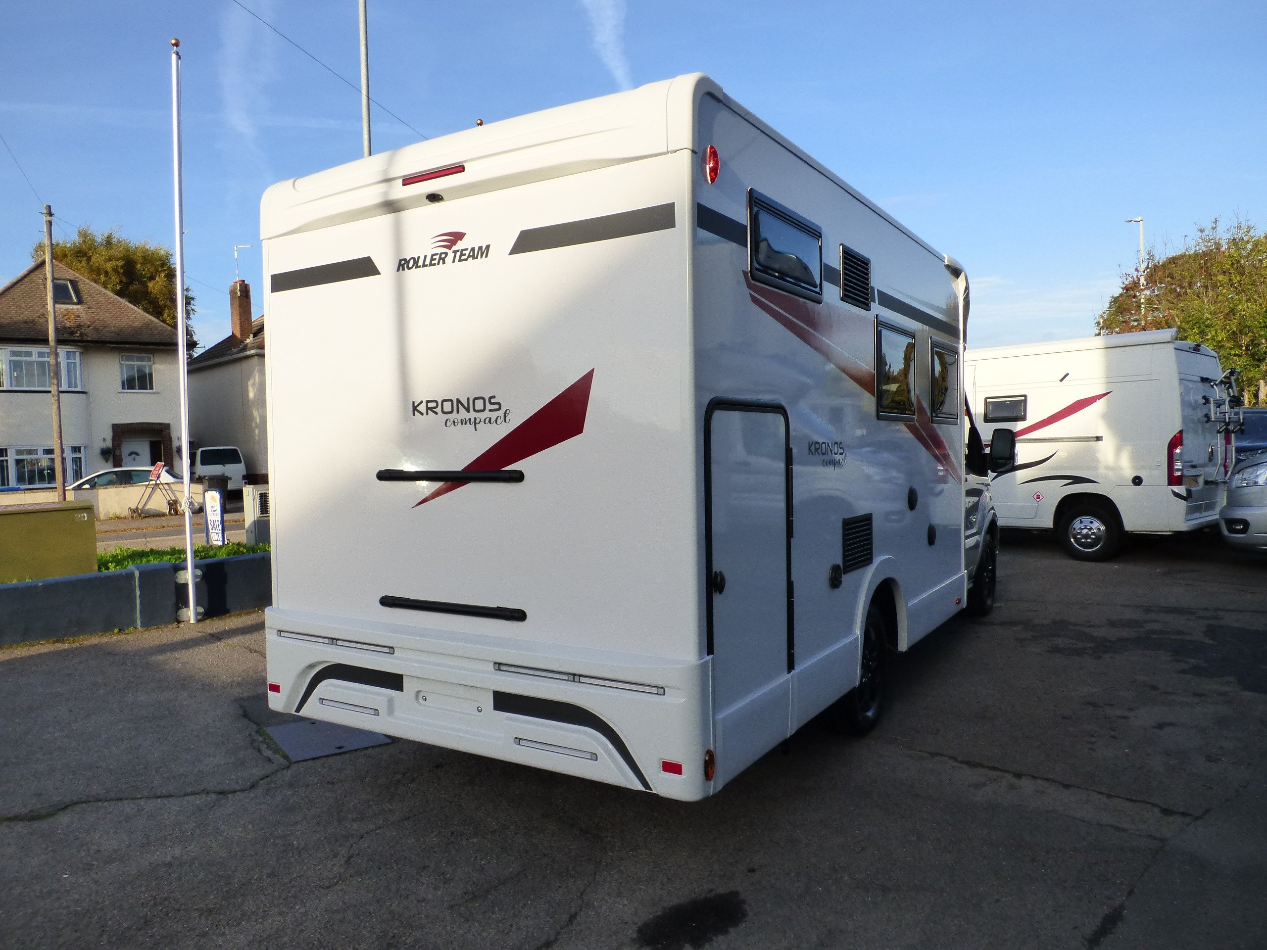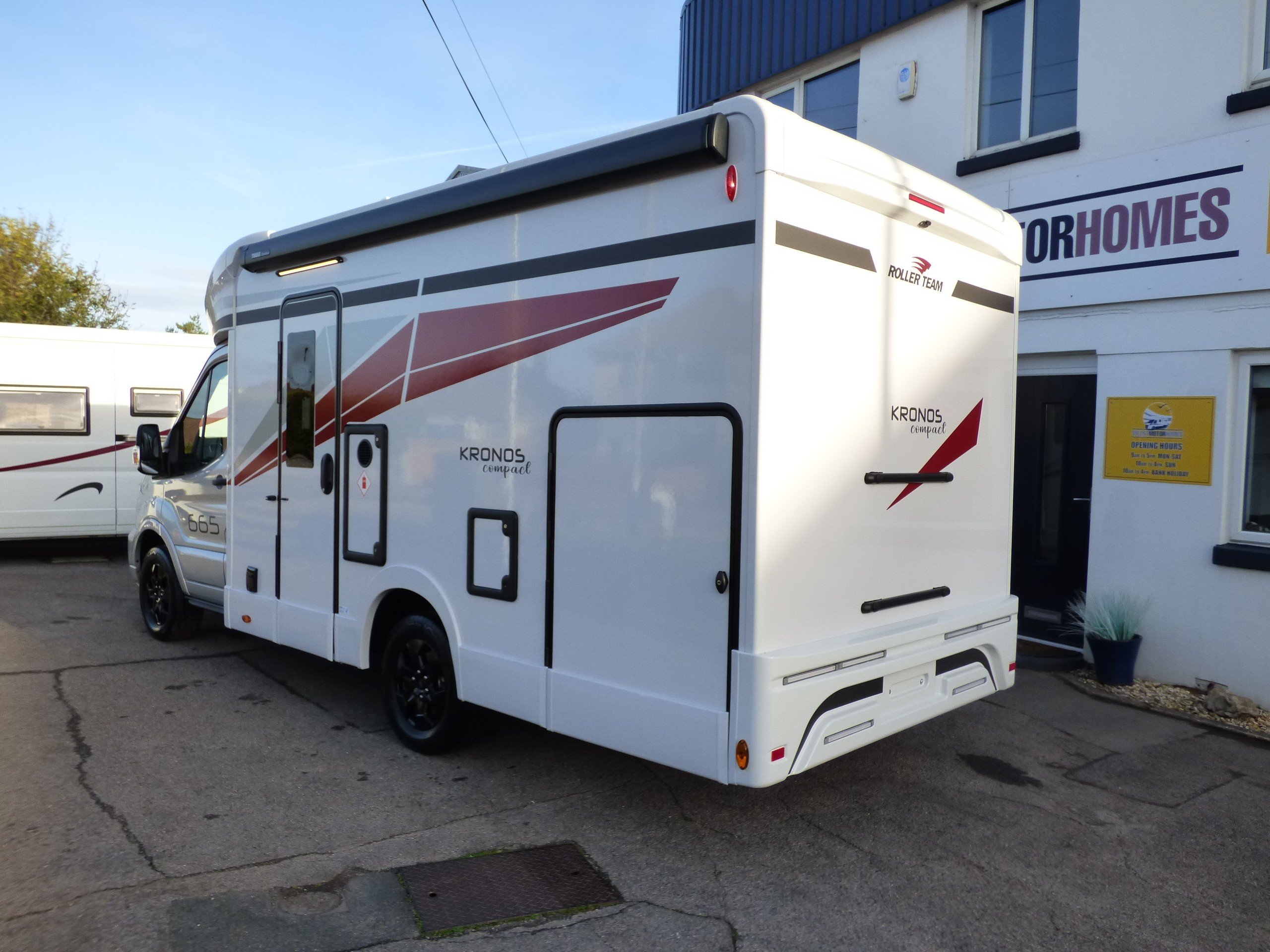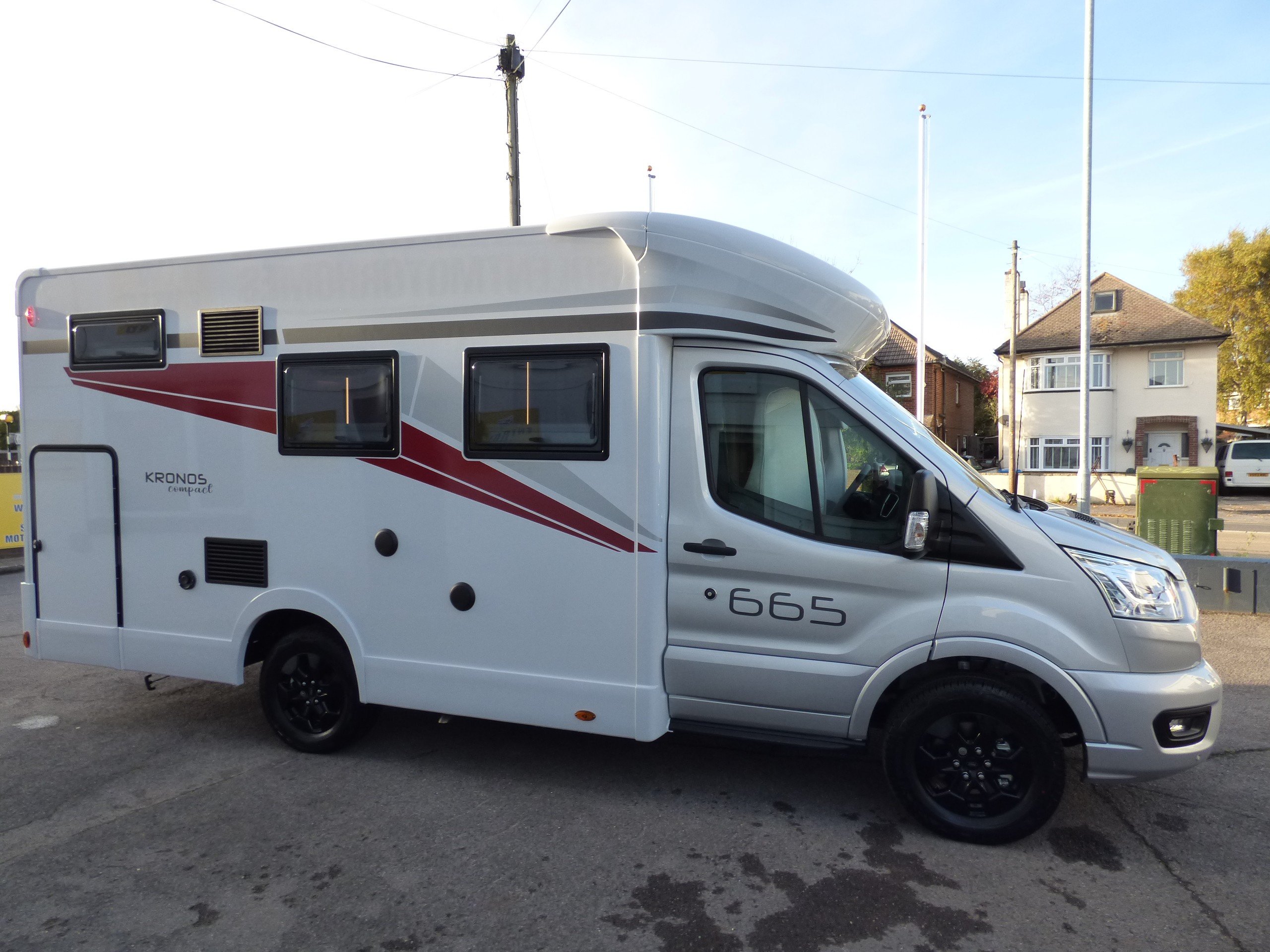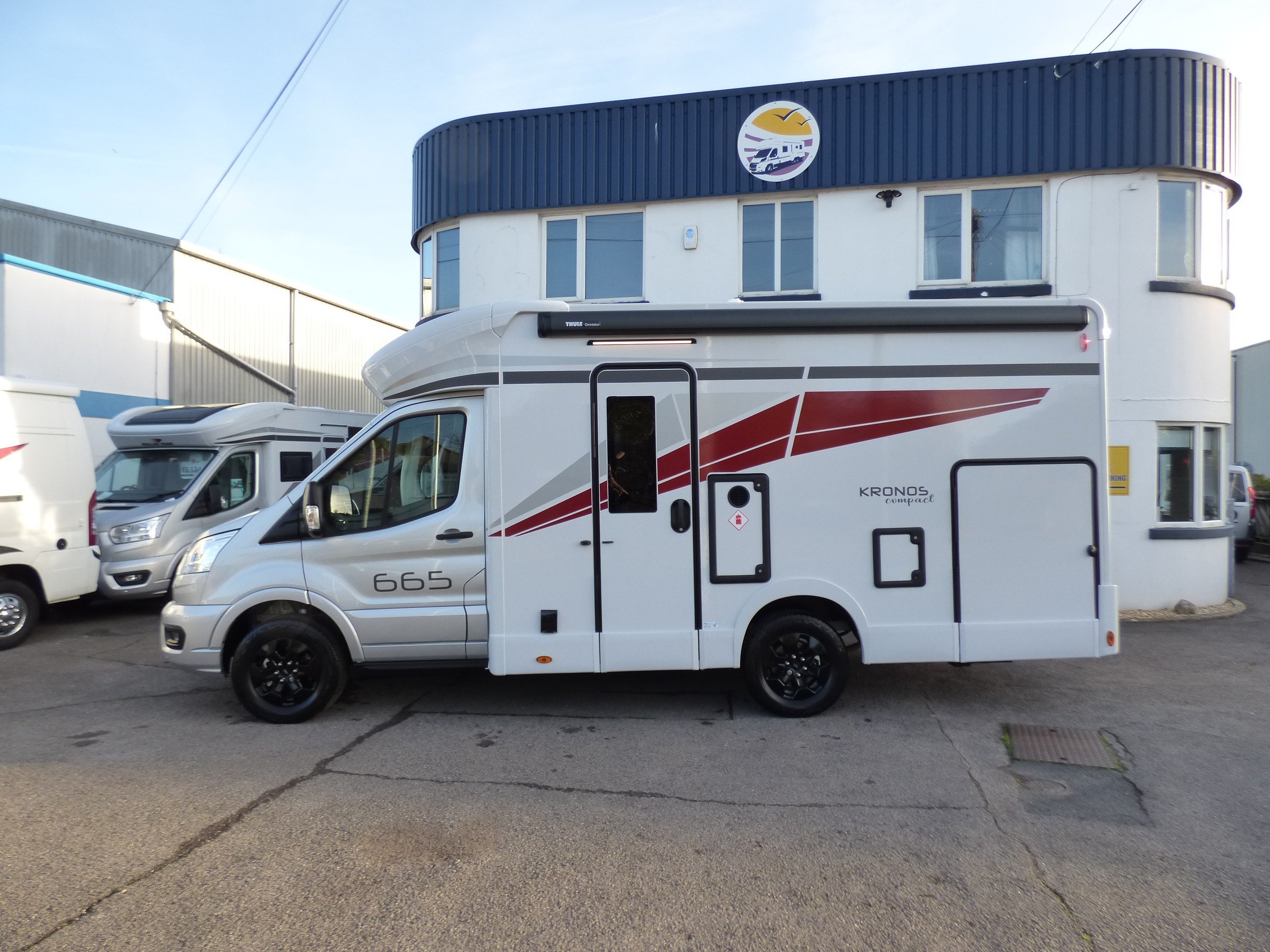New model for 2026, the Kronos 665 based on the Ford chassis with 170bhp engine and 8 speed automatic transmission. The new 665, is sure to be a real hit with both families looking for a compact motorhome and couples with the need for occasional extra beds. The dinette seats 4 in comfort with swivel front seats. A fully equipped kitchen sits behind with a 3 burner gas hob and Thetford gas oven & grill below along with a large fridge/freezer. The bathroom opposite has a shower cubicle, cassette type toilet and wash hand basin. The rear fixed bed sits above a garage which is an exceptional size for a sub 6.5m motorhome. Heating and hot water is by a Truma duel fuel system and other features for the Kronos 665 include: Metallic cab, alloy wheels, WiFi, external shower & BBQ points, reversing camera, factory Flex bed option, solar panel, Fiamma bike rack. L. 6.41m, W. 2.15m, H. 2.95m, 4 berth, 4 seatbelts, Delivery miles.