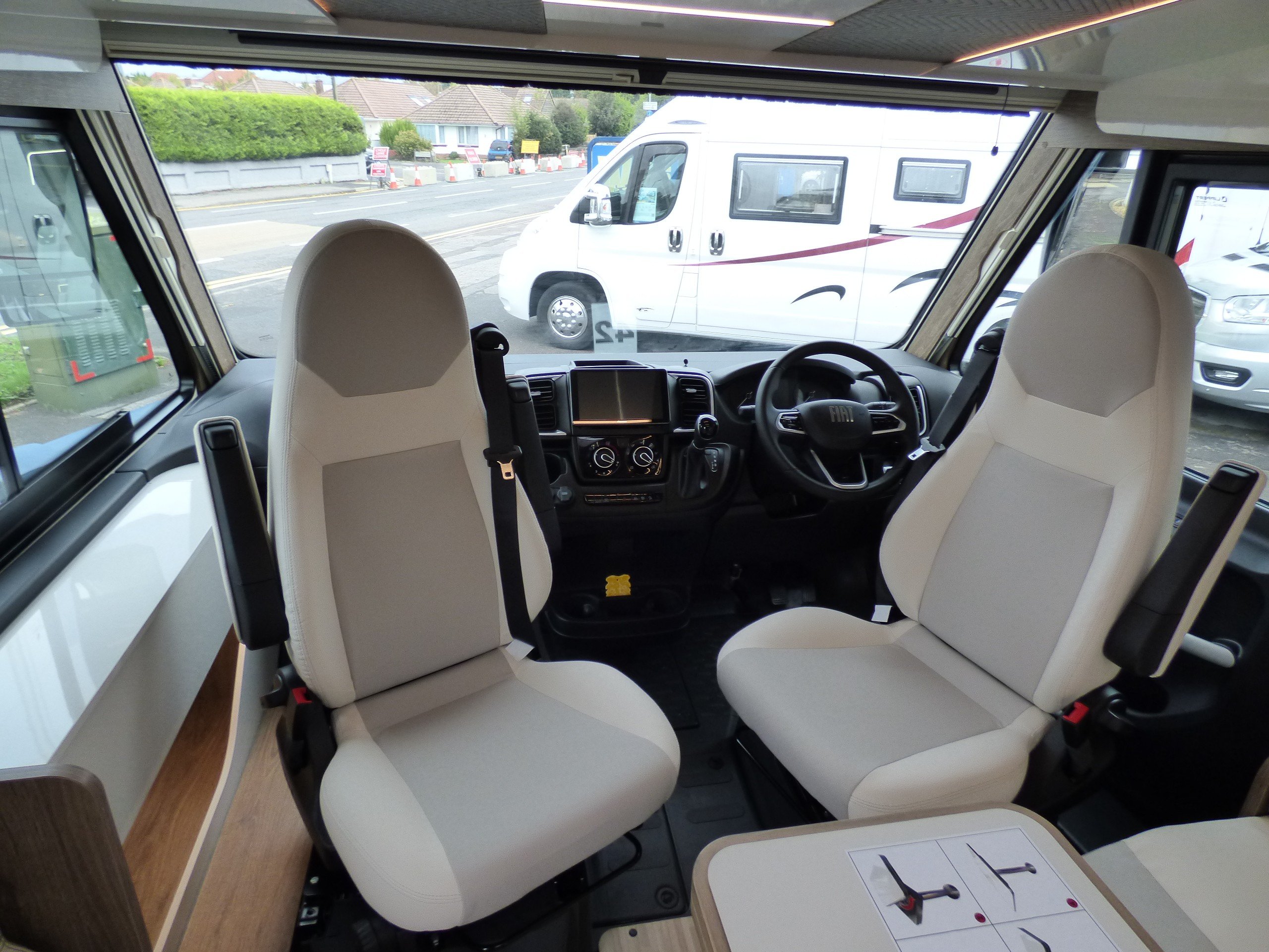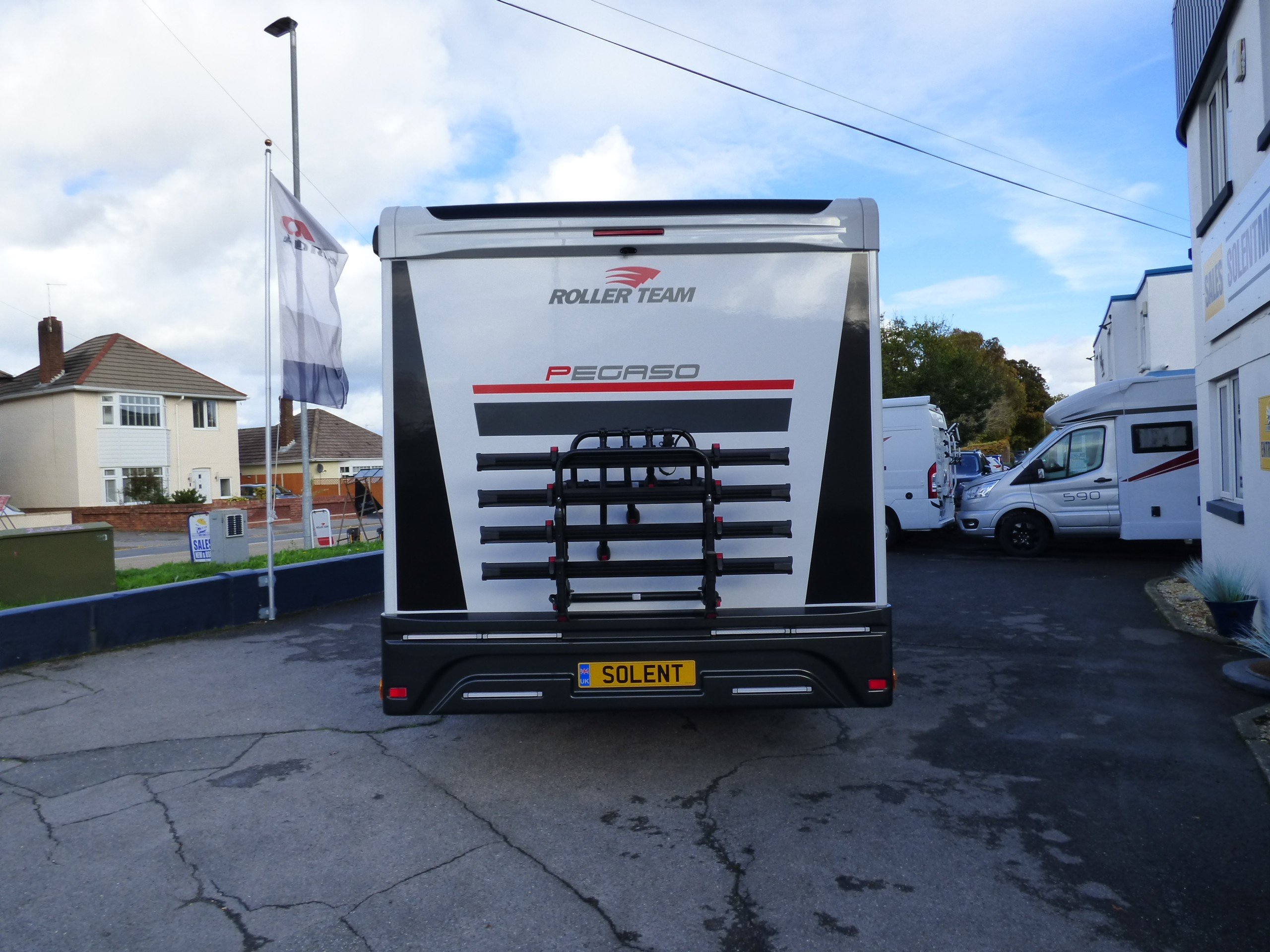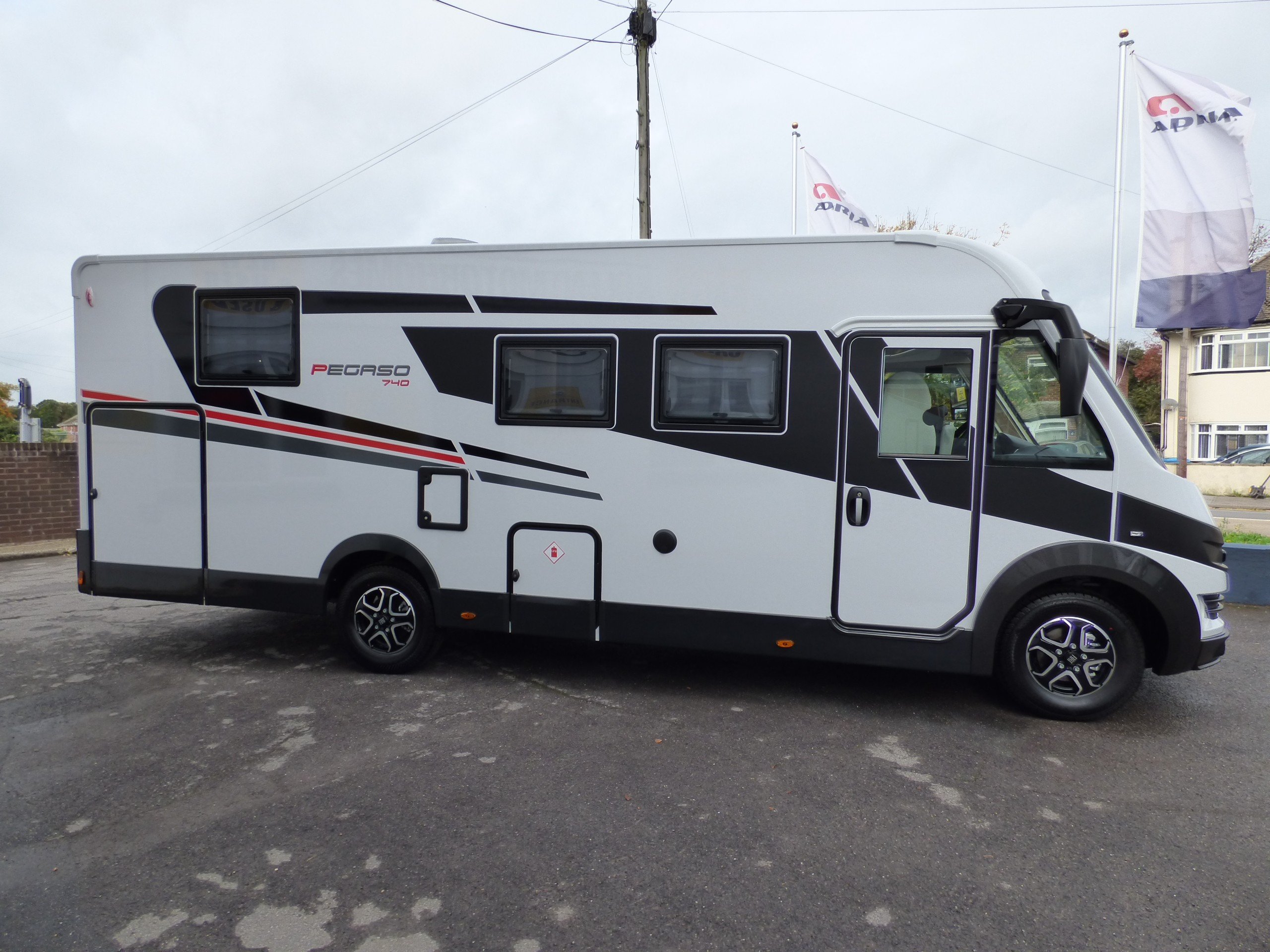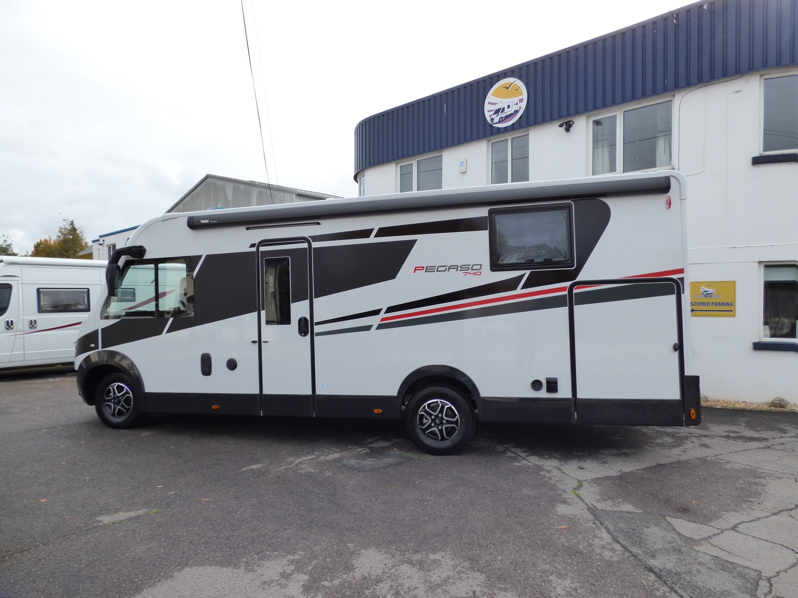 The new and improved 2026 model Pegaso 740 is in stock now. Based on the Fiat Ducato chassis with 140bhp engine and 8 speed automatic transmission, the latest version of the popular Pegaso 740 model has a host of new features including a larger front bed, revised lounge layout, larger bathroom and and all new solar arrangement for off grid compatibiltiy. The spacious lounge area has swivel front seats that turn to face opposing sofas with a folding table. The drop down bed above is able to be used at the same time as the lounge and a new kitchen sits behind the lounge. Now fitted with a compressor fridge/freezer and microwave, the traditional gas hob and oven remain. The bathroom has a separate shower cubicle, central wash basin and cassette toilet along with clever cupboard space and can be shut off from both the lounge and rear bedroom. The rear bedroom has an electrically adjustable island bed with wardobes either side and wall space for a TV. Other features of this Pegaso 740 include: Thule wind out awning, Twin 200w Solar panels with twin leisure batteries, carpets, Pioneer infotainment system, Truma heating/hot water, Fiamma bike rack and reversing camera. 4 berth, 4 seatbelts, L. 7.41m, W. 2.35m, H 2.95m, 3,500kg, Delivery Miles.