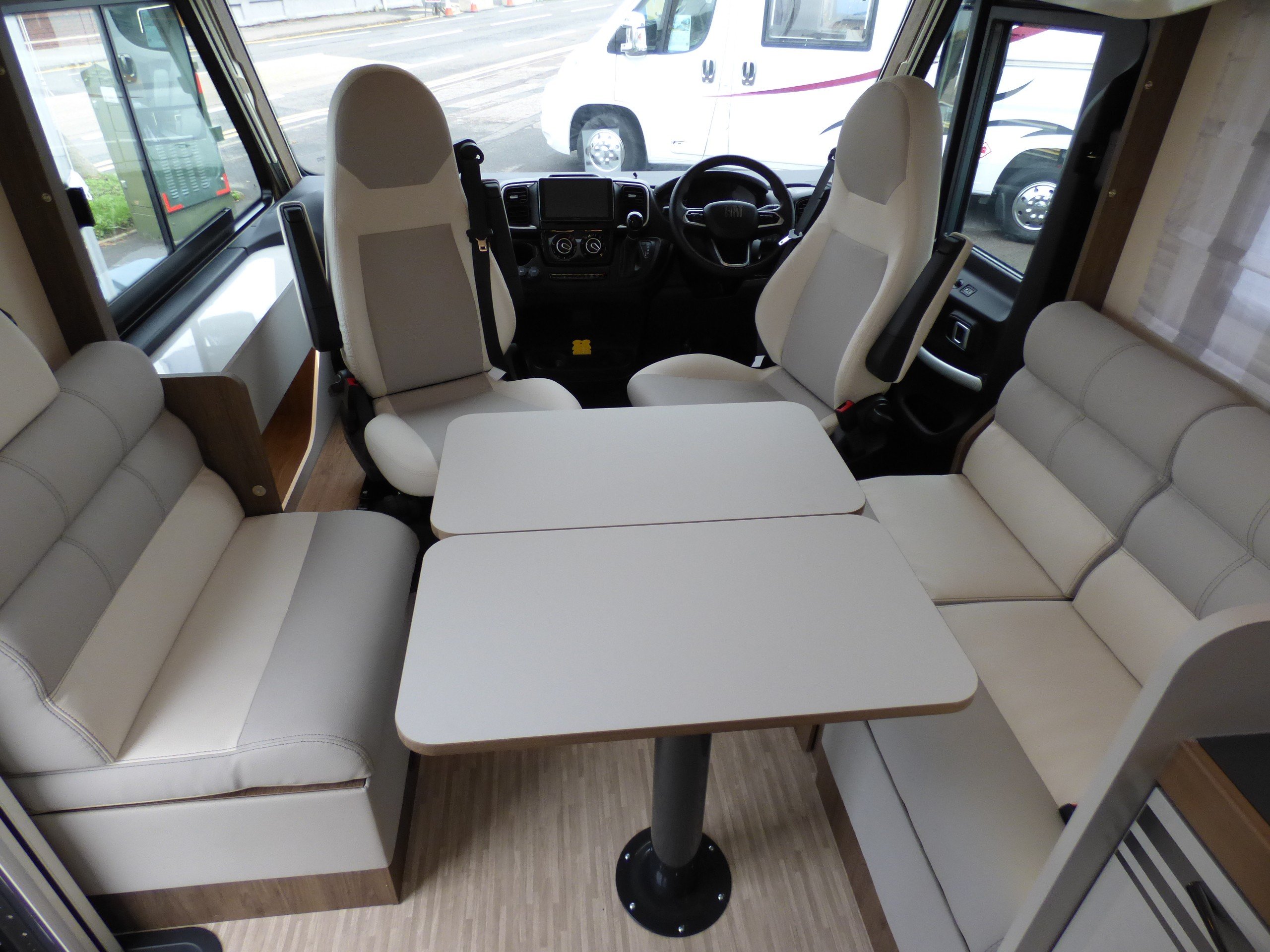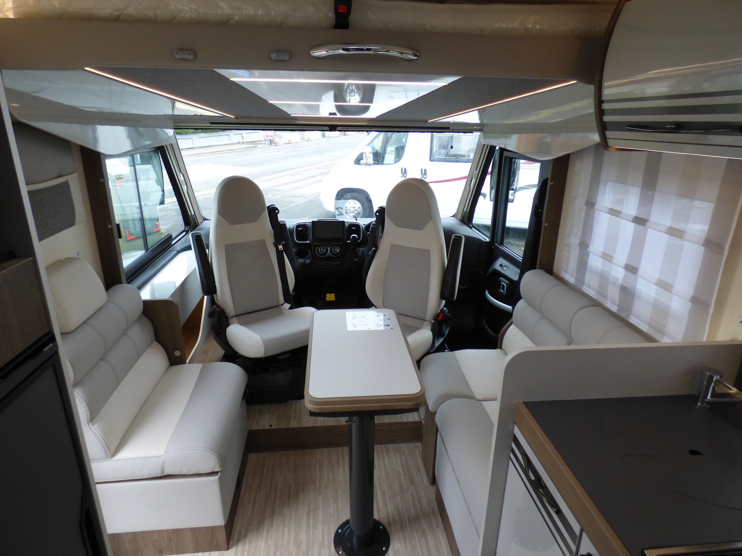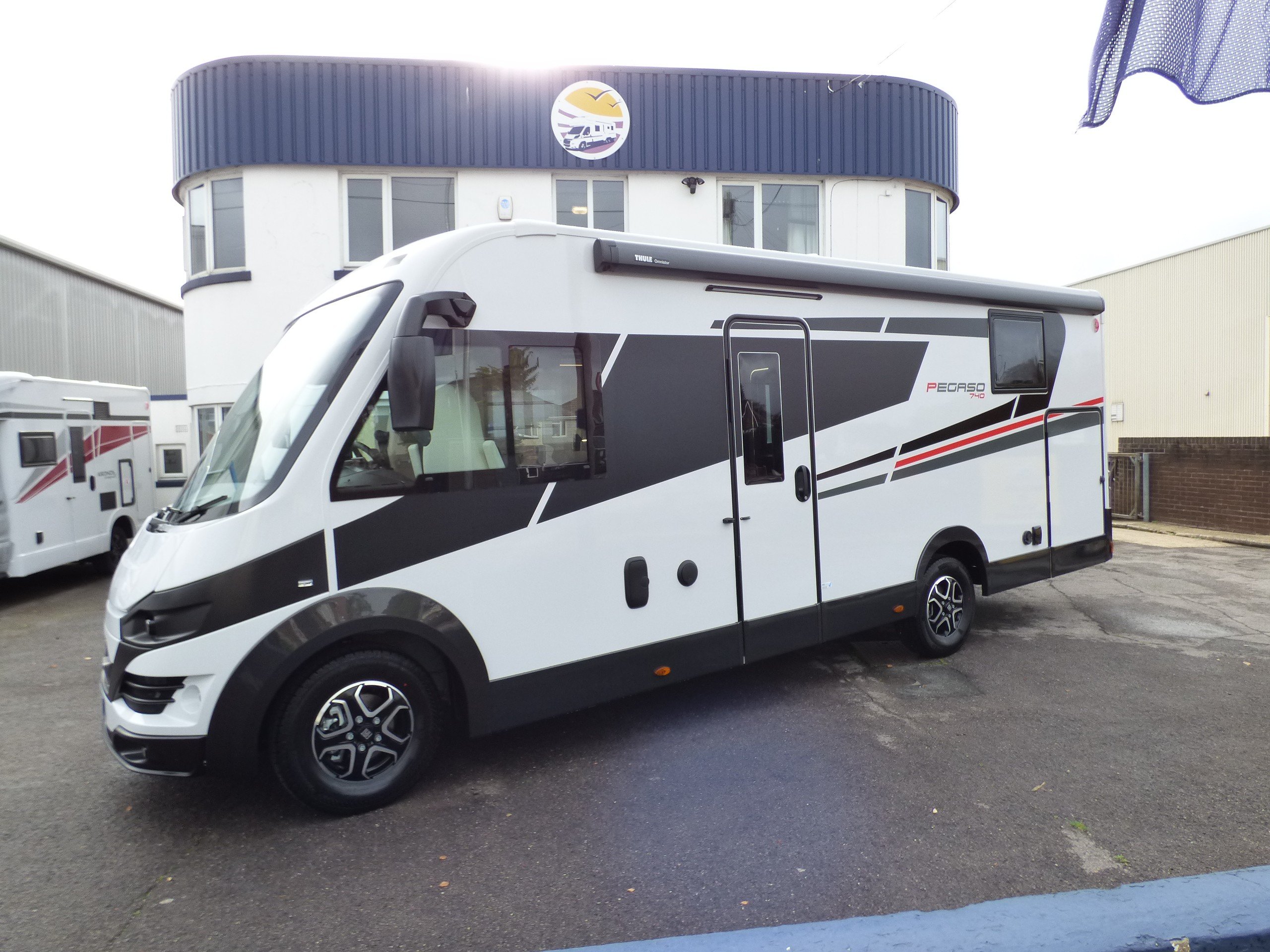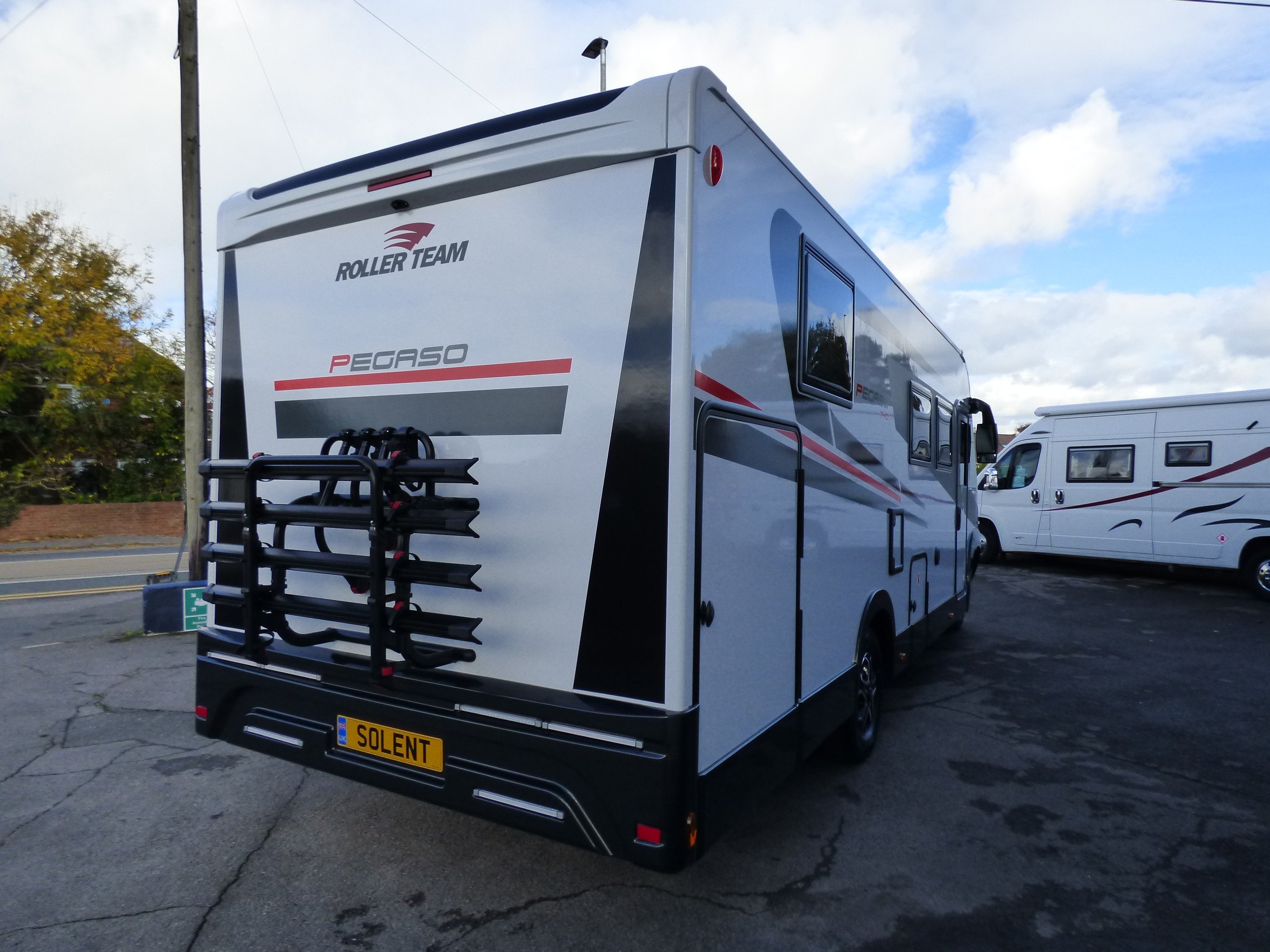 The new and improved 2026 model Pegaso 740 is in stock now. Based on the Fiat Ducato chassis with 140bhp engine and 8 speed automatic transmission, the latest version of the popular Pegaso 740 model has a host of new features including a larger front bed, revised lounge layout, larger bathroom and and all new solar arrangement for off grid compatibiltiy. The spacious lounge area has swivel front seats that turn to face opposing sofas with a folding table. The drop down bed above is able to be used at the same time as the lounge and a new kitchen sits behind the lounge. Now fitted with a compressor fridge/freezer and microwave, the traditional gas hob and oven remain. The bathroom has a separate shower cubicle, central wash basin and cassette toilet along with clever cupboard space and can be shut off from both the lounge and rear bedroom. The rear bedroom has an electrically adjustable island bed with wardobes either side and wall space for a TV. Other features of this Pegaso 740 include: Thule wind out awning, Twin 200w Solar panels with twin leisure batteries, carpets, Pioneer infotainment system, Truma heating/hot water, Fiamma bike rack and reversing camera. 4 berth, 4 seatbelts, L. 7.41m, W. 2.35m, H 2.95m, 3,500kg, Delivery Miles.