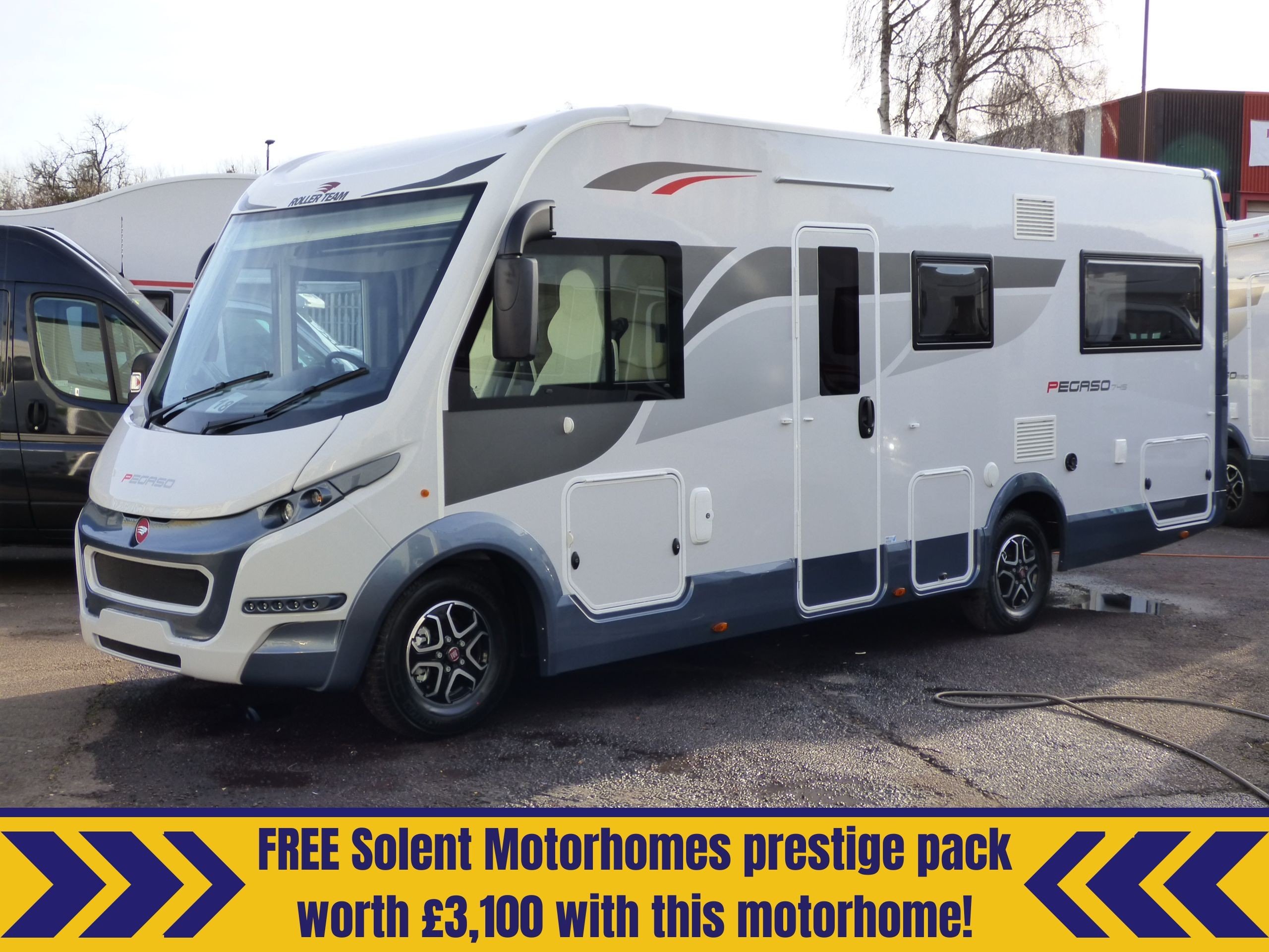 Special Offer - Free Prestige Pack - Includes Fiamma F45S Awning, Scorpion Defender S7 Alarm & Tracker, 22" Falcon Smart TV, 11kg Gaslow refillable LPG system and starter pack, together worth up to £3,100! + Save £8,685 off list price! New 2024 Pegaso 745 automatic in stock now. The Pegaso 745 has been a popular addition to the range since it was introduced in 2019. Based on the Fiat Ducato chassis with 140bhp engine and 9 speed automatic transmission, the end lounge layout is a hit with families and couples as it provides a light and airy living area whilst keeping the dining area free. A double bed swings down above the cab area and the rear lounge turns into a further double bed quickly with a pull out bed system. The kitchen is located centrally to one side and features a 3 burner gas hob, gas oven/grill and a good size fridge/freezer. The bathroom opposite has a shower cubicle, cassette type toilet and wash basin. Heating and hot water is provided by a Truma dual fuel system and other features on this Pegaso 745 include: New Pioneer Sat Nav/Infotainment centre, Solar panel, Twin reversing cameras, WiFi, External gas BBQ and shower points, Colour Sat Nav, cab A/C, 4 bike rack and carpets. L. 7.41m, W. 2.35M, H. 2.95M, 3,500kg, 4 berth, 4 seat belts. Delivery Mileage.