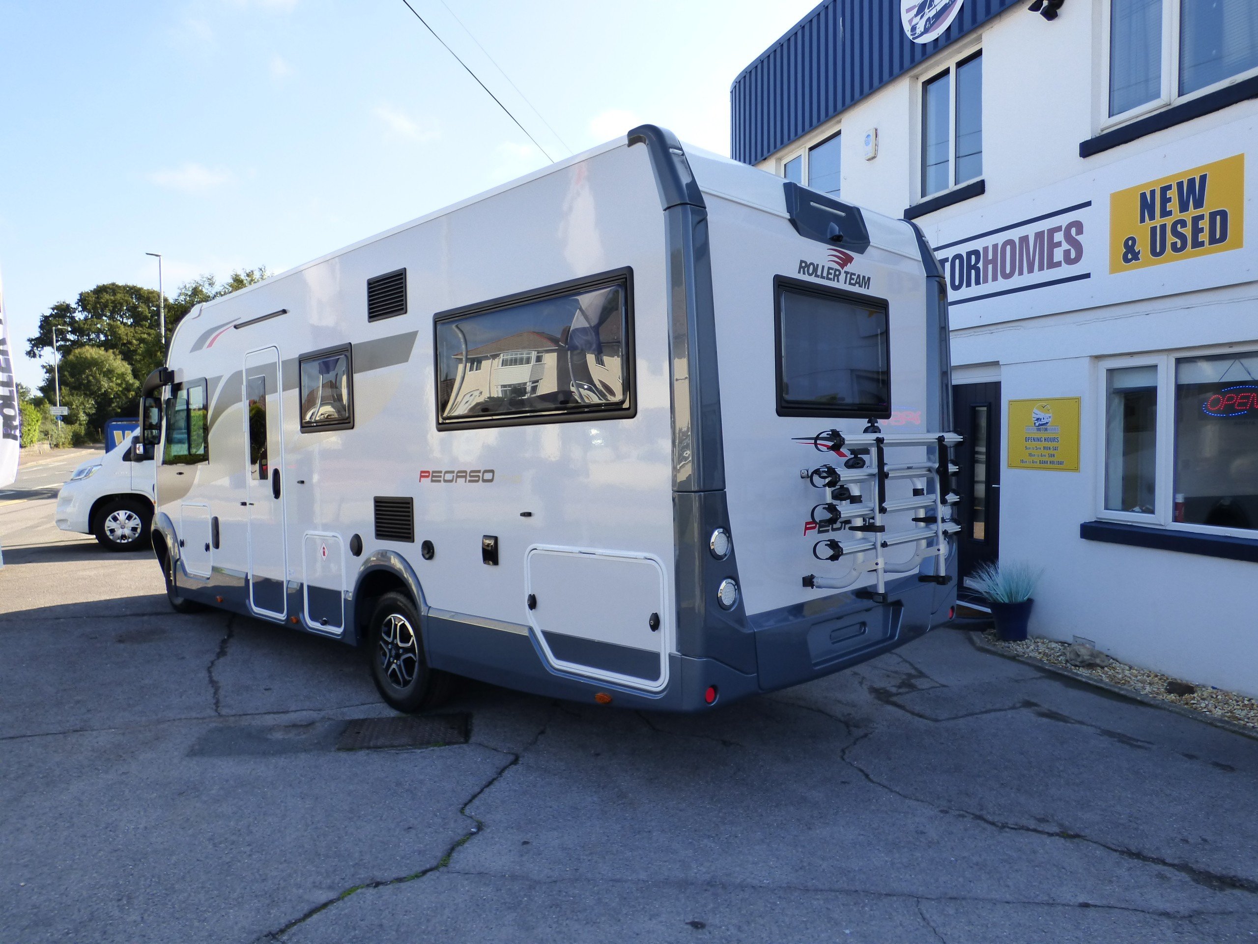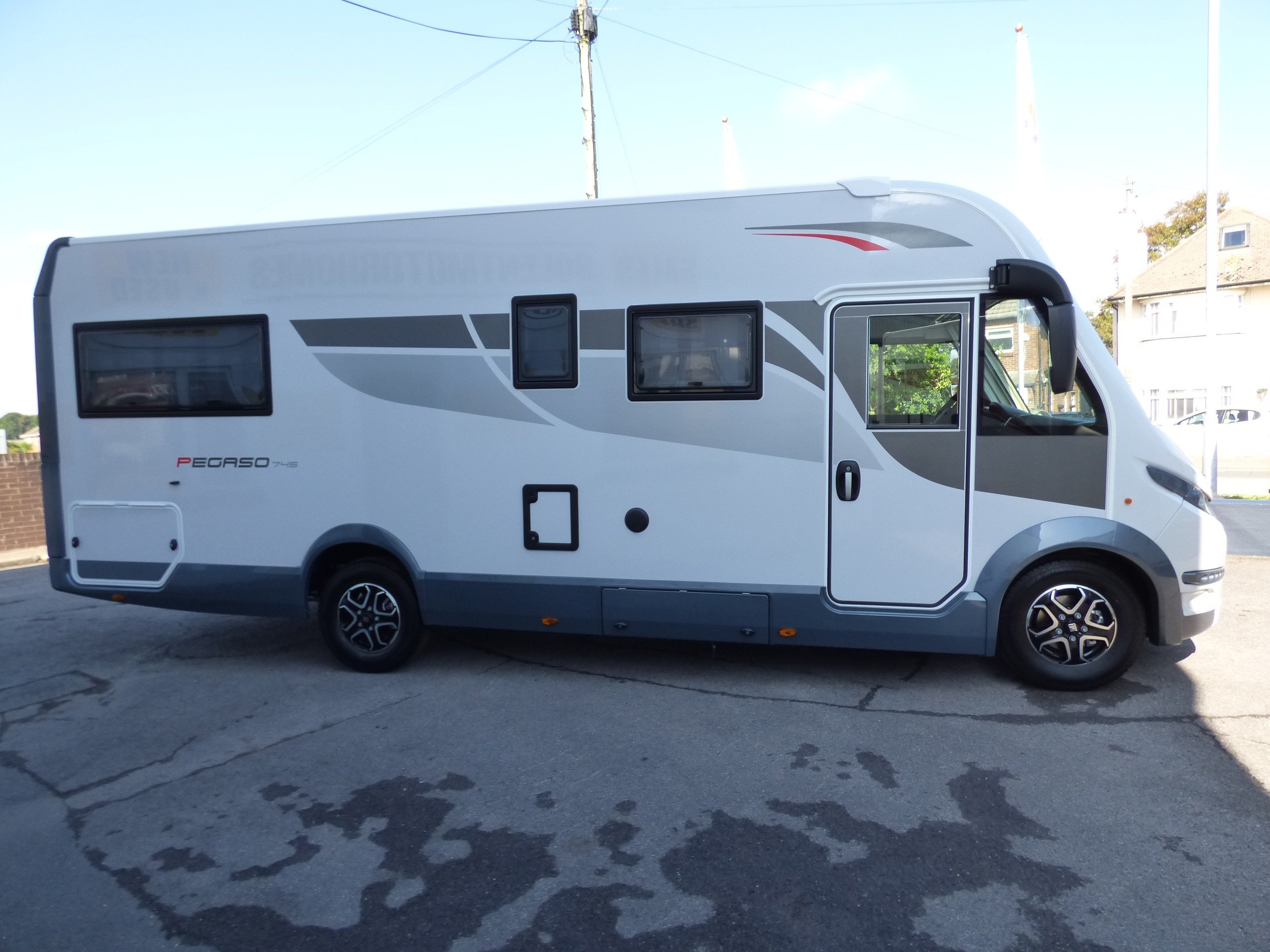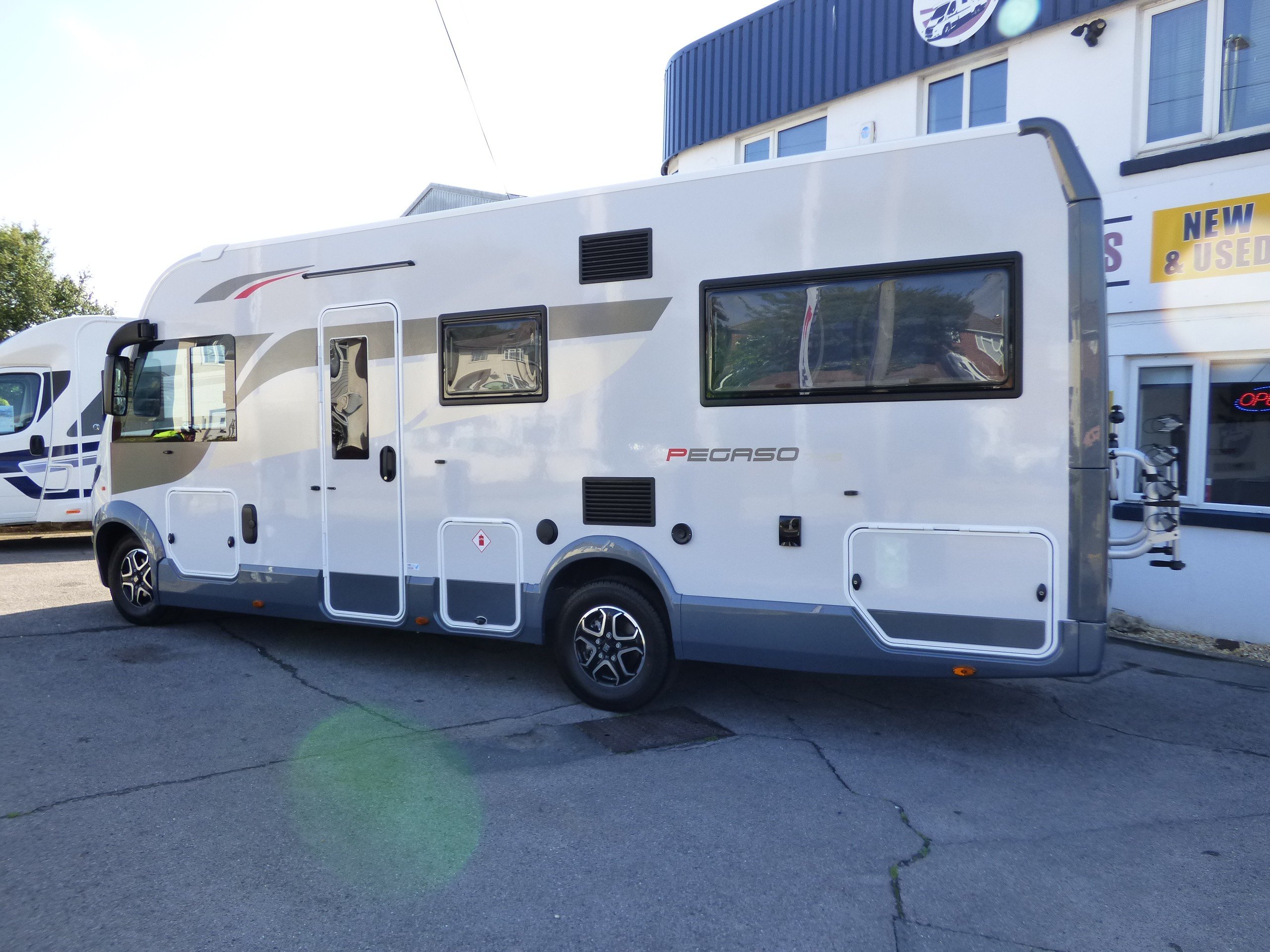 Brand new 2025 model Pegaso 745 automatic in stock now. The Pegaso 745 has been a popular addition to the range since it was introduced in 2019. Based on the Fiat Ducato chassis with 140bhp engine and 8 speed automatic transmission, the end lounge layout is a hit with families and couples as it provides a light and airy living area whilst keeping the dining area free. A double bed swings down above the cab area and the rear lounge turns into a further double bed quickly with a pull out bed system. The kitchen is located centrally to one side and features a 3 burner gas hob, gas oven/grill and a good size fridge/freezer. The bathroom opposite has a shower cubicle, cassette type toilet and wash basin. Heating and hot water is provided by a Truma dual fuel system and other features on this Pegaso 745 include: New Pioneer Sat Nav/Infotainment centre, Solar panel, Twin reversing cameras, WiFi, External gas BBQ and shower points, Colour Sat Nav, cab A/C, 4 bike rack and carpets. L. 7.41m, W. 2.35M, H. 2.95M, 3,500kg, 4 berth, 4 seat belts. Delivery Mileage.