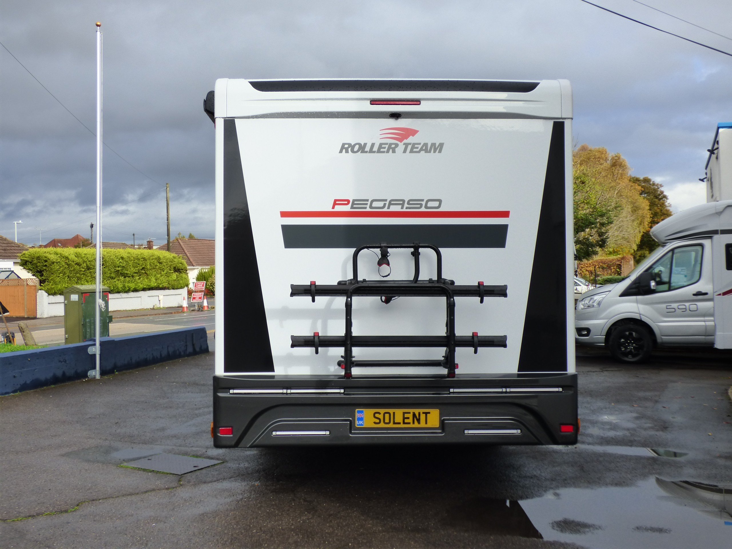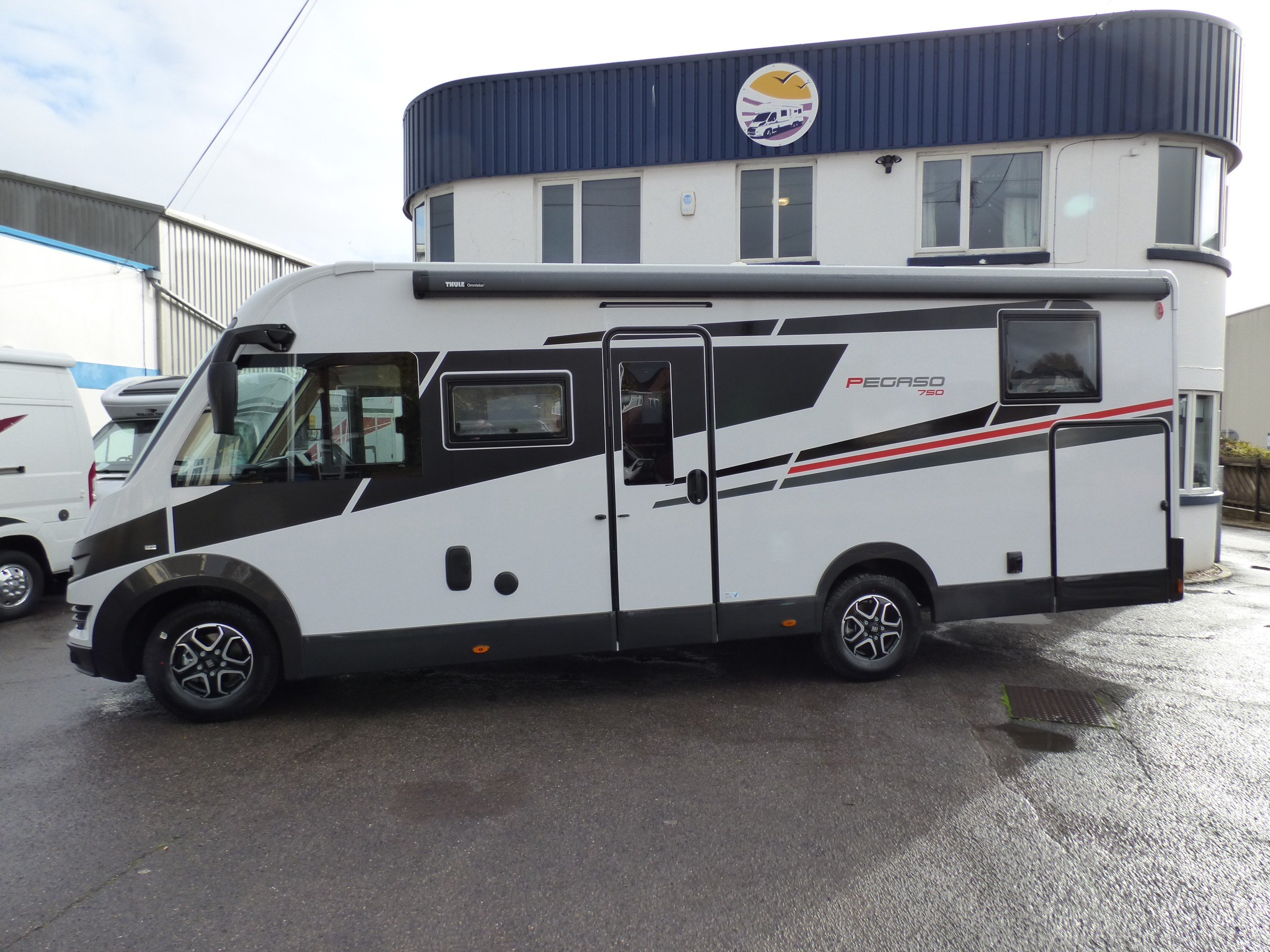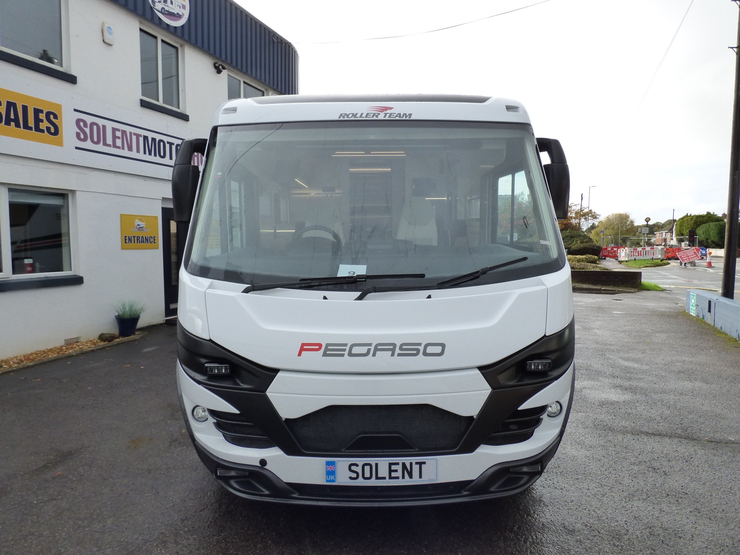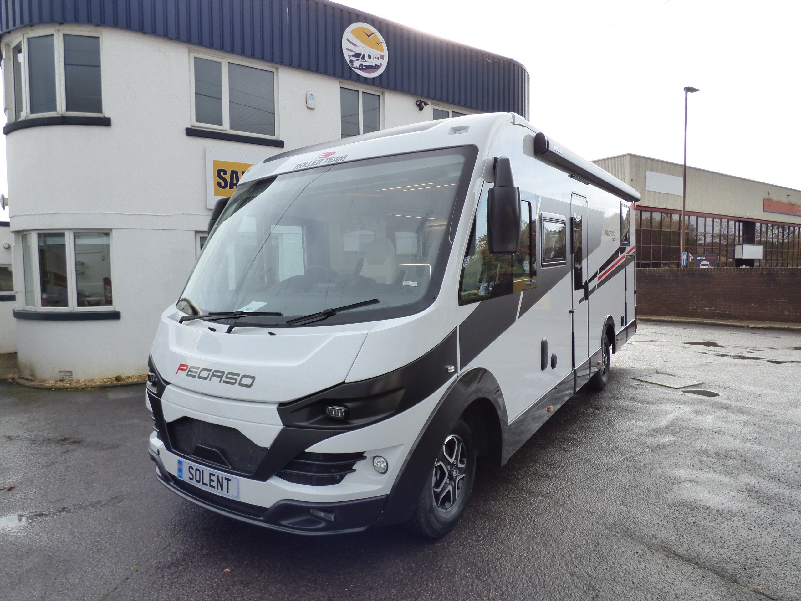 Brand New 2026 Model Pegaso 750 140bhp Automatic in stock now. A Fantastic addition to the Pegaso A Class range, the new 750 model provides a fresh layout with twin rear single beds and a central bathroom arrangement. The lounge area is laid out as two opposing sofas with the front seats swivelling to accommodate 6 with ease. The front seats fold down to allow the front drop down double bed to pull out for evening use, still allowing the lounge to remain in use. The central kitchen is fitted with a gas hob, gas oven/grill and a new compressor fridge/freezer. The bathroom has a separate shower cubicle, cassette type toilet and a wash hand basin. the twin rear beds also have a large storage area under, so this is ideal for families. Heating and hot water is via a Truma dual fuel system and other features for this Pegaso 750 include: Alloy Wheels, Pioneer infotainment system, Twin 200w solar panels with MPPT controllers, Twin leisure batteries, Fiamma bike rack, Thule wind out awning, External BBQ and Shower points, WiFi, pleated cab blinds, carpets and ISOfix child seat fixings. 4 berth, 4 seat belts, L. 7.41m, W. 2.35m, H. 2.95m, 3,500kg, delivery miles.