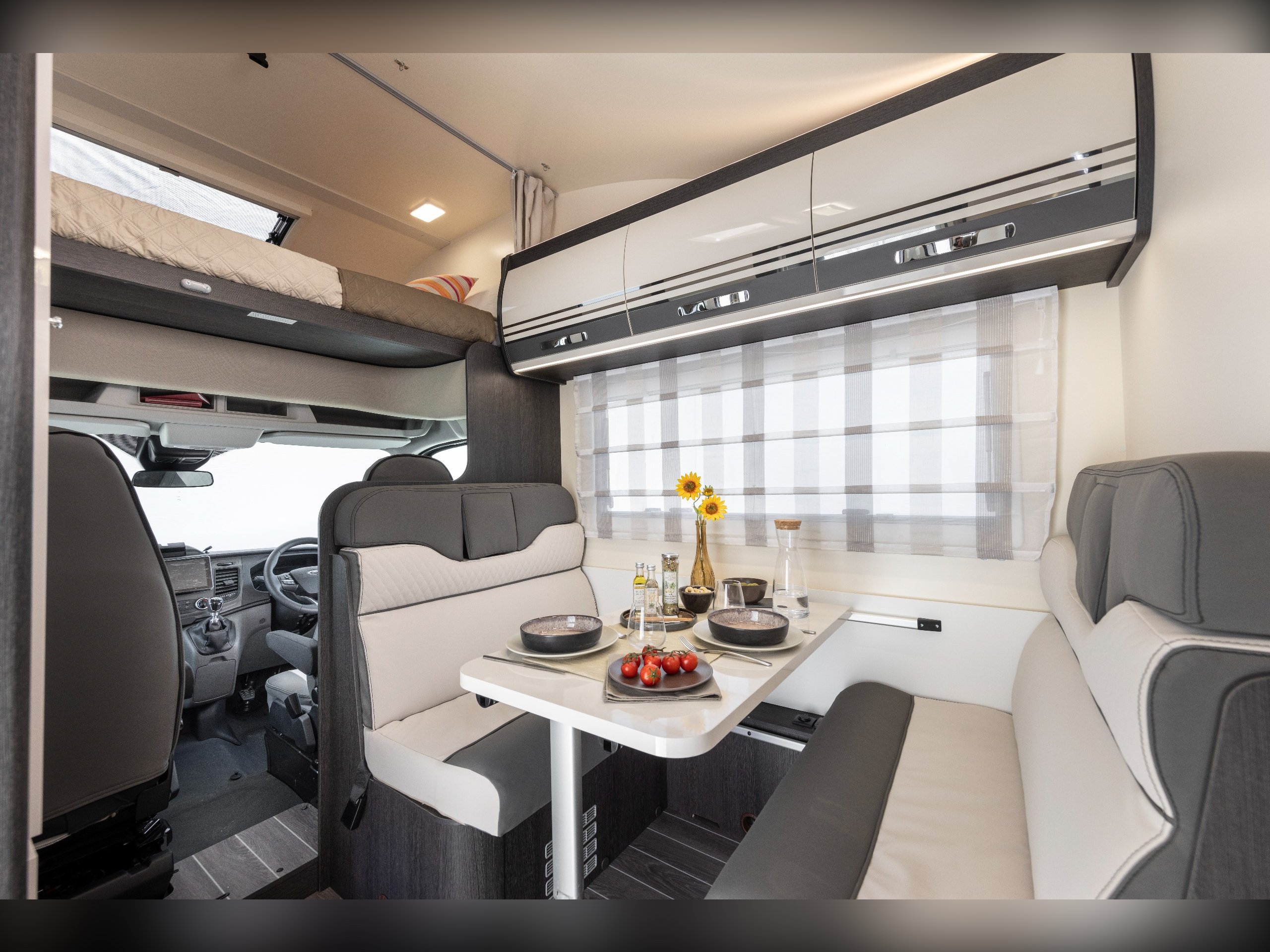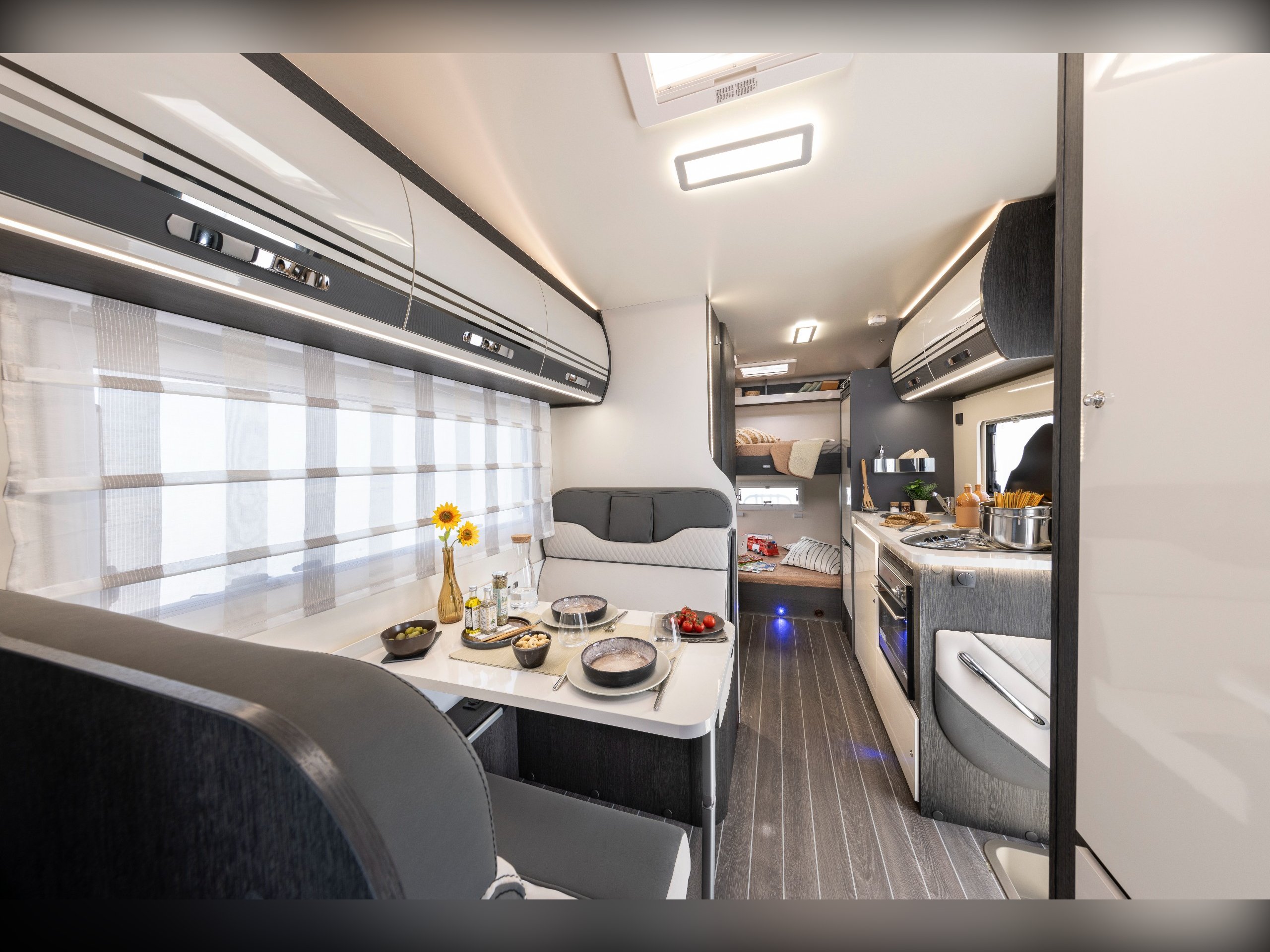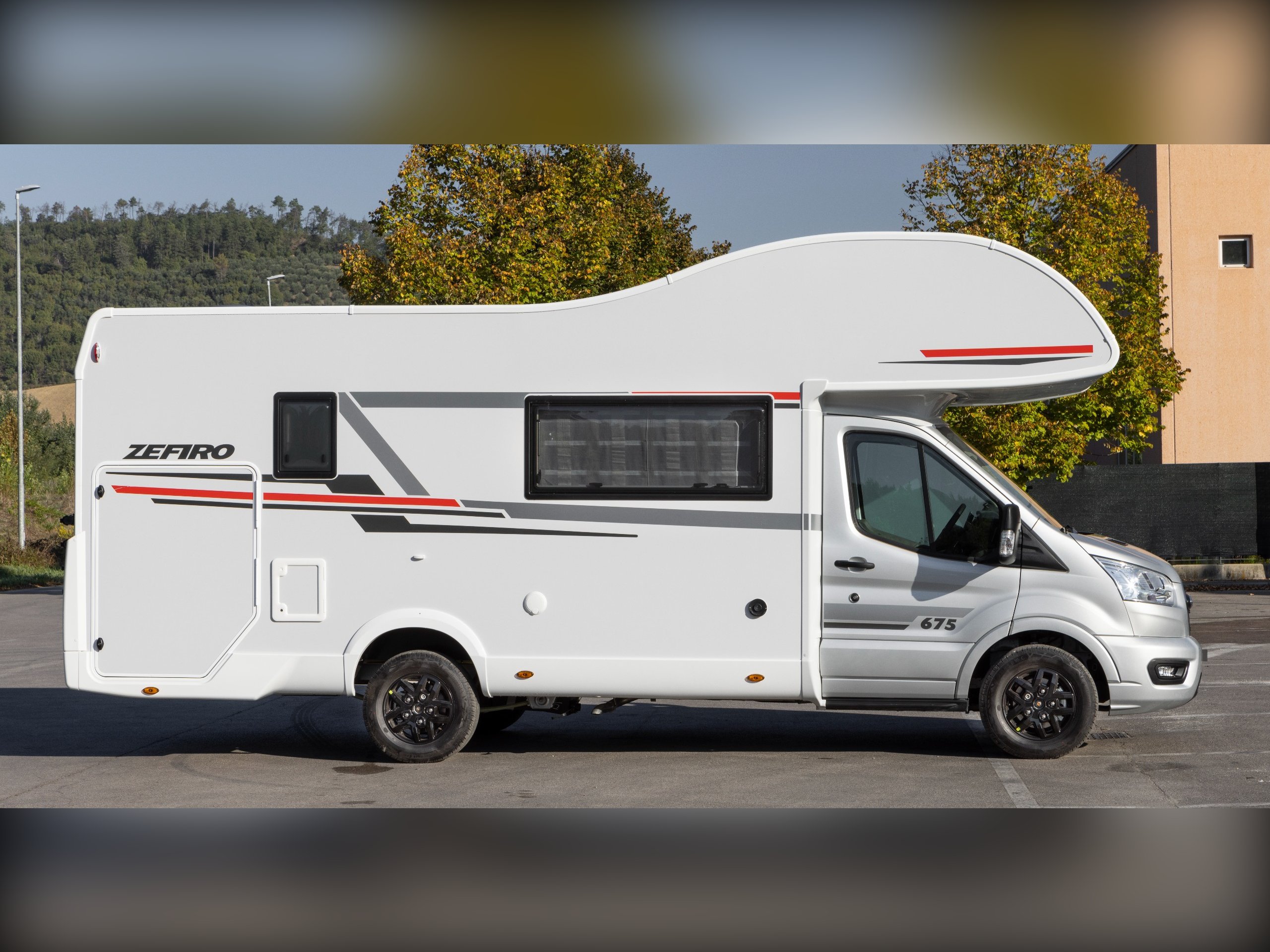 New 2026 Model Zefiro 675 Automatic with 165bhp engine is based on the new Ford Transit chassis with 8 speed automatic transmission and the latest Ford 12" Infotainent system with Apple Car Play and Android Auto. The 675 has always been popular with families sleeping six with ease and providing a lot of storage thanks to the rear garage and bunk bed system. The dinette area converts to a double bed for evening use. The overcab bed is a very large double and at the rear, the very generous bunk beds provide sleeping for two more. The well equipped kitchen features a 3 gas burner hob, gas oven and grill and a large fridge/freezer. The bathroom opposite has a shower cubicle, cassette type toilet and wash hand basin. Heating and hot water is via a Truma dual fuel system and other features for the Zefiro 675 include: Zefiro Driver's Pack, 200w Solar panel, Thule 4 bike rack, WiFi, External Gas BBQ and Shower points, Front Parking Sensors, Reverse Camera, ISOfix Child Seat Fixings, Pleated Cab Blinds and carpets. L. 6.99, W. 2.3m, H, 3.1m, 3,500kg, 6 berth/5 seat belts, delivery mileage.