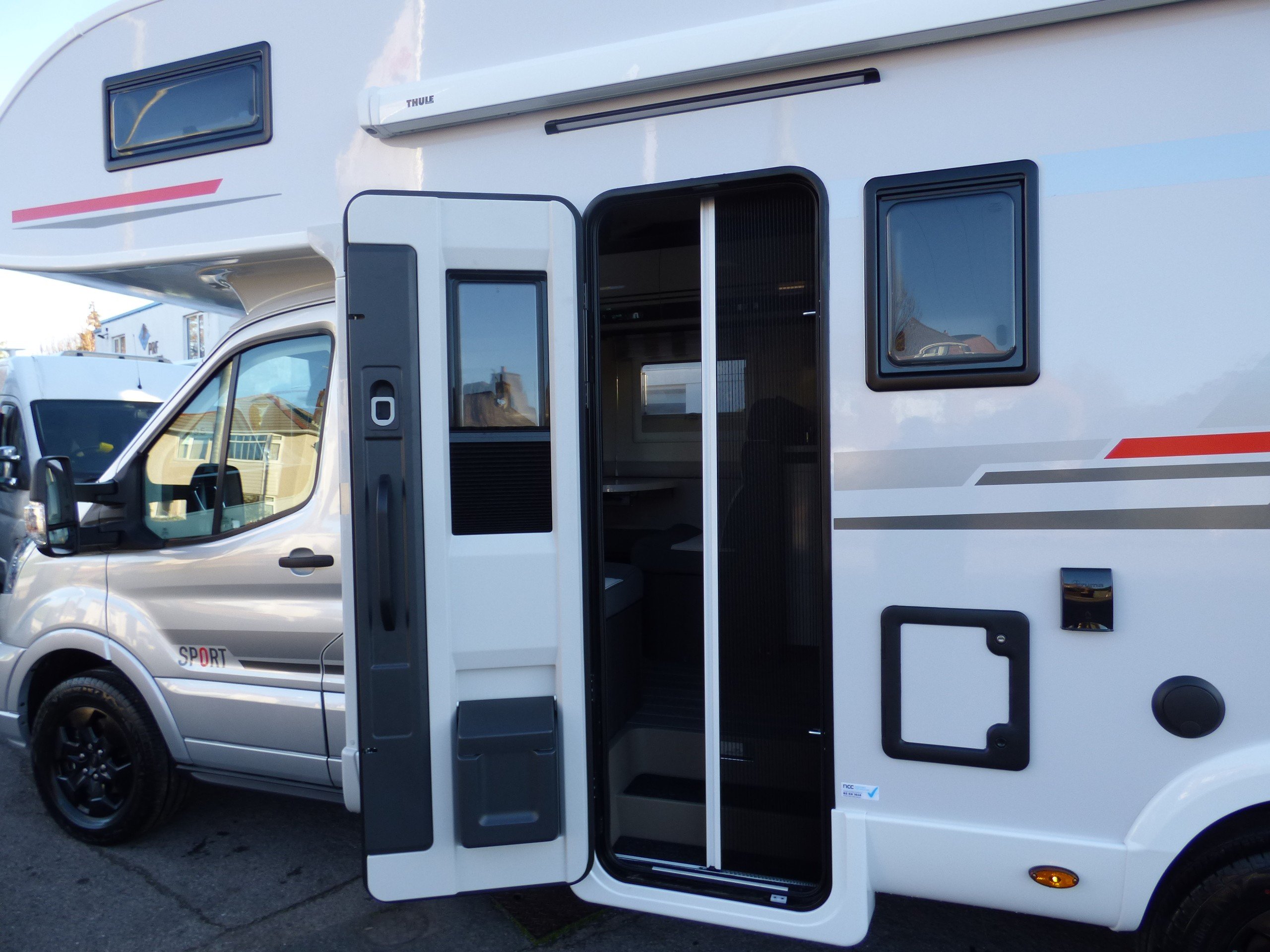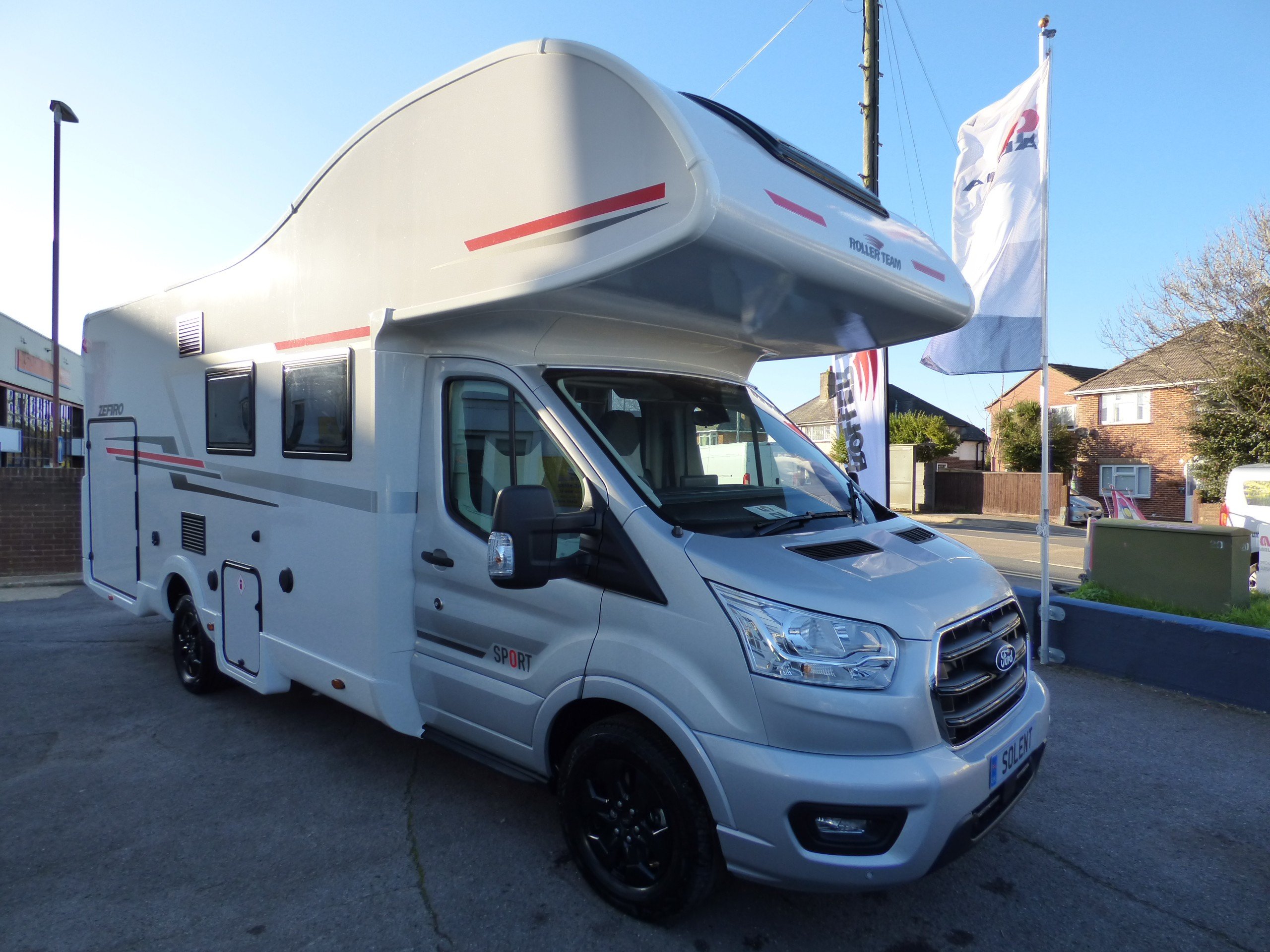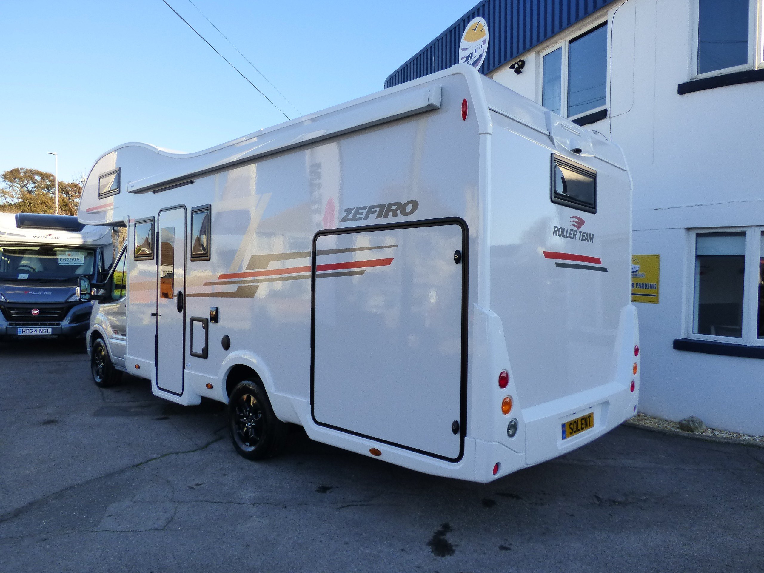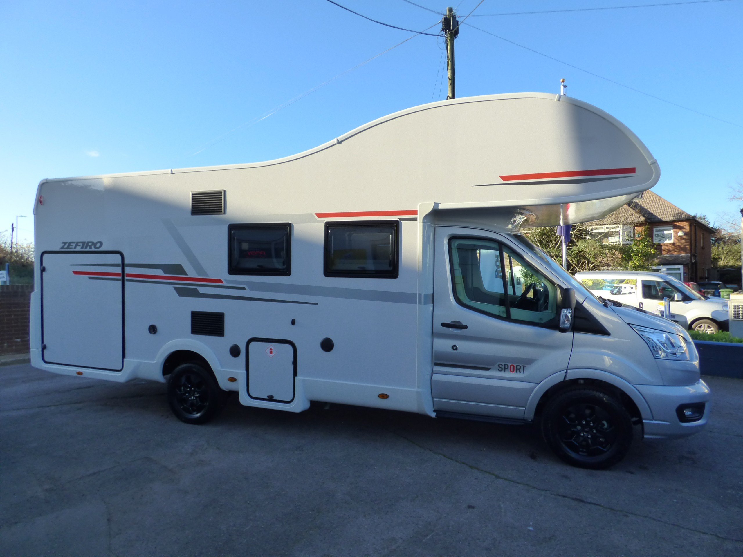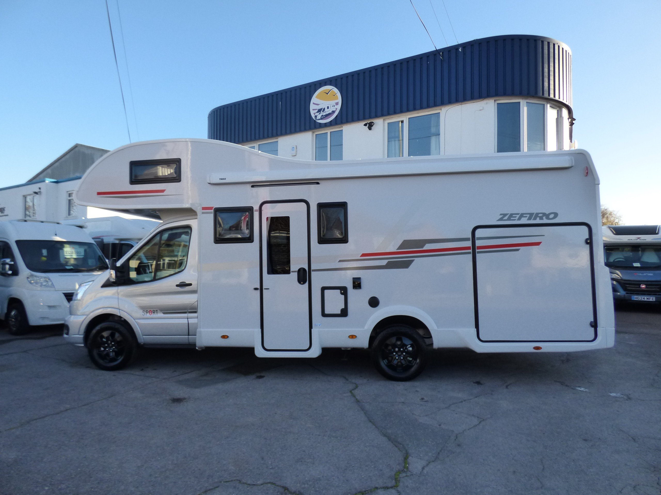 Just Arrived! New 2026 Model Zefiro Sport based on the Ford Transit chassis with 165bhp engine and 8 speed automatic transmission with the Ford 12" screen infotainment system, front parking sensors and Zefiro Driver's Pack. The huge rear garage with electric elevating bed over makes this particularly popular for sports orientated users such as Motocross and Karting. The large double bed over the cab and the rear bed mean that four can sleep in comfort and the dinette area has swivelling front seats, so 4 can dine with ease. The well equipped kitchen features a 3 burner gas hob, gas oven/grill and large fridge/freezer with lower bottle compartment. The Zefiro Sport bathroom has a separate shower cubicle and basin with cassette type toilet. The habitation area benefits from a Truma hot water/heating system with the latest Truma iNetX control system, 200w solar panel, LED lighting, TV Bracket, Thule wind out awning, Pleated Cab Blinds, Reversing camera, External BBQ & shower points, 4G WiFi,, ISOfix and carpets. L. 7.43m, W. 2.35m, H 3.2m, 3,500kg, 4 berth/4 seatbelts, Delivery Miles.