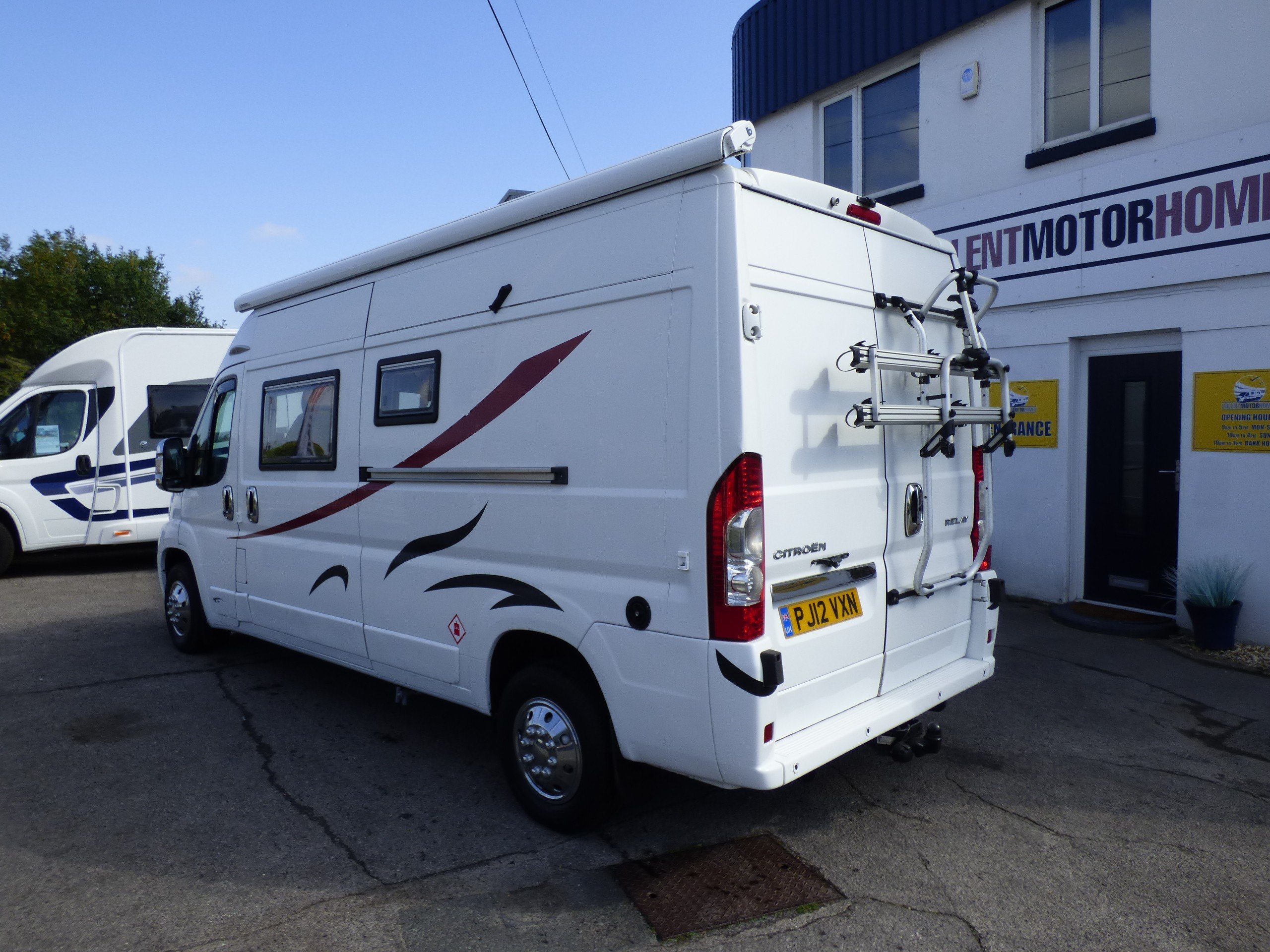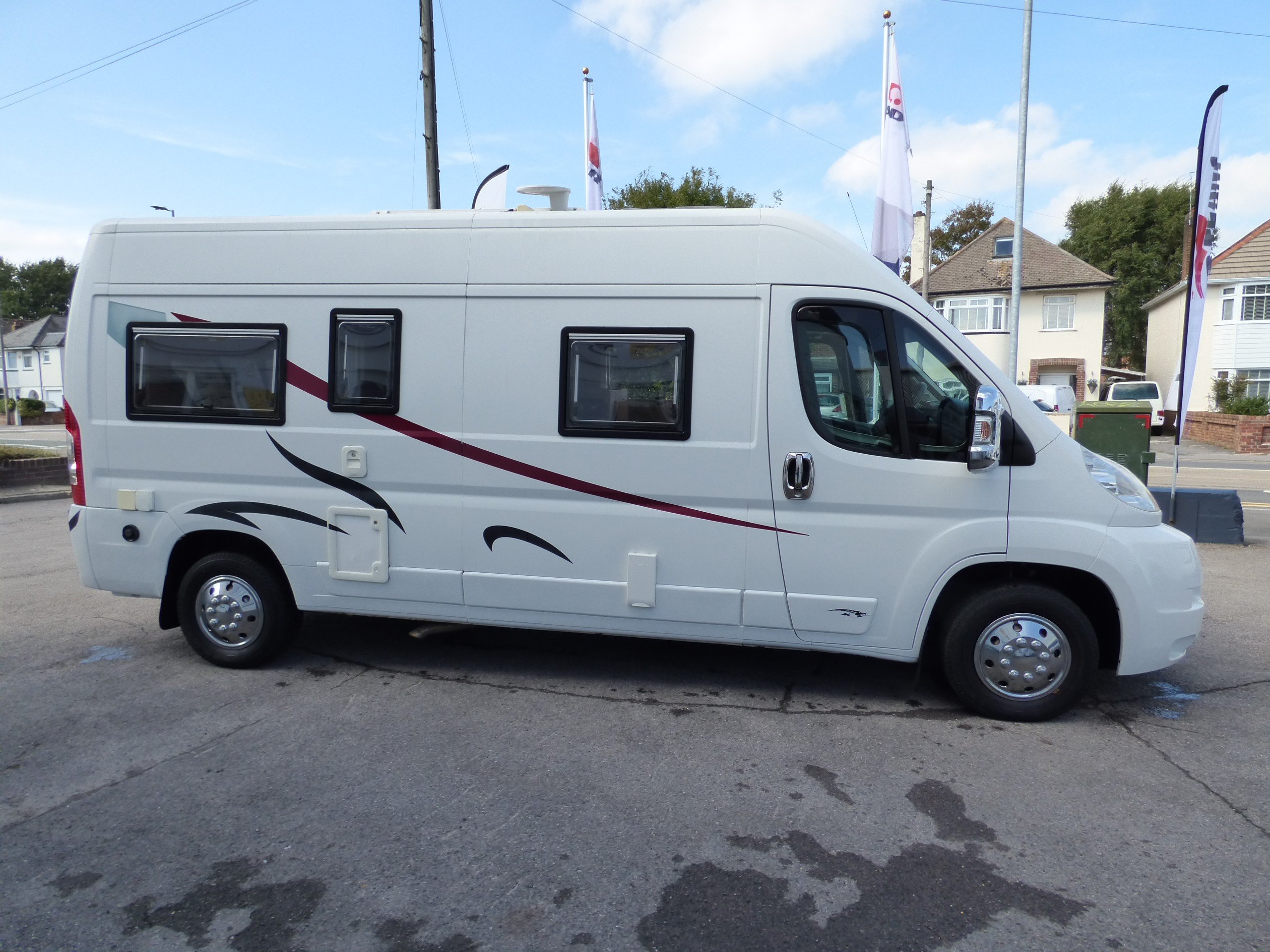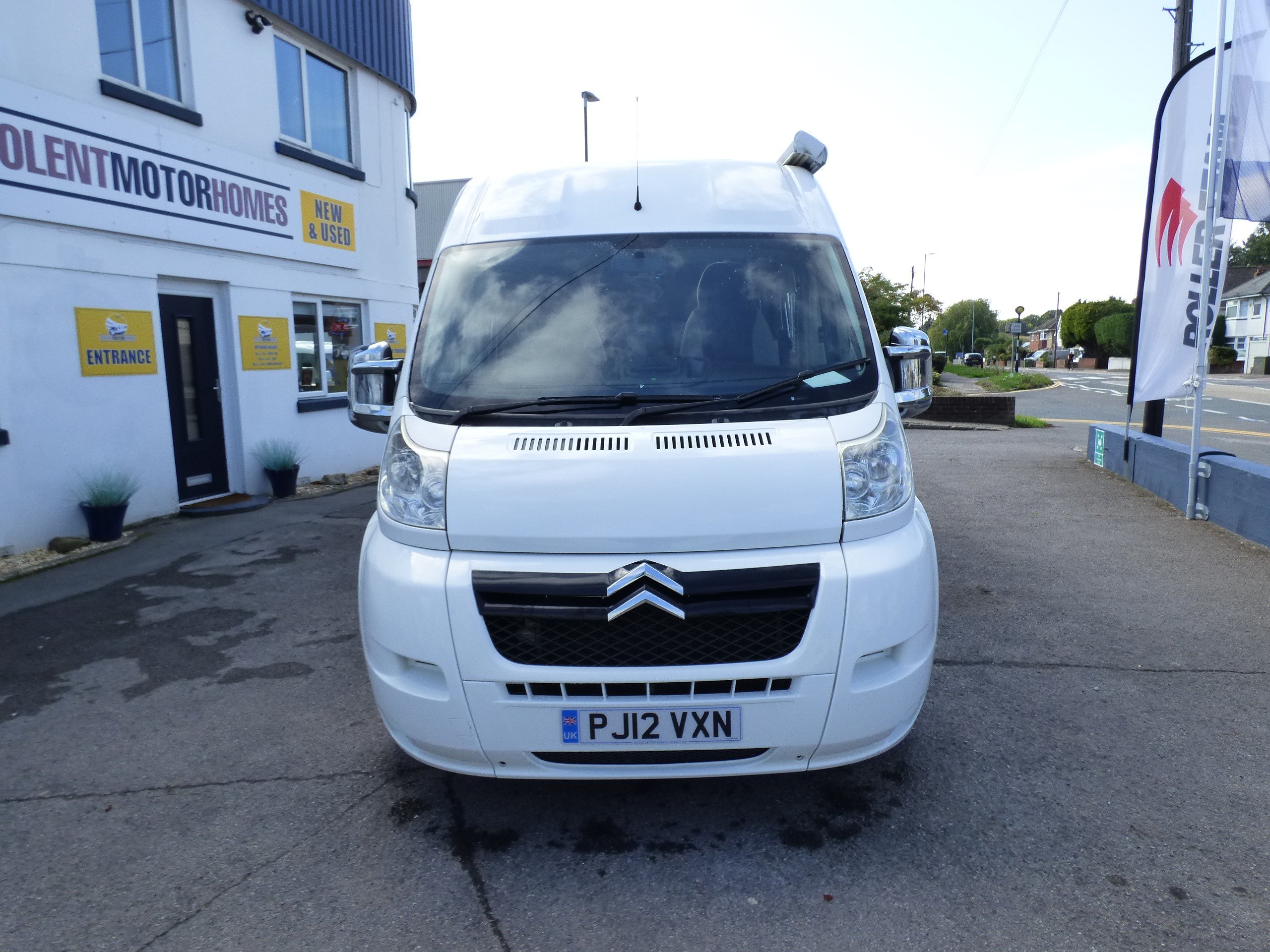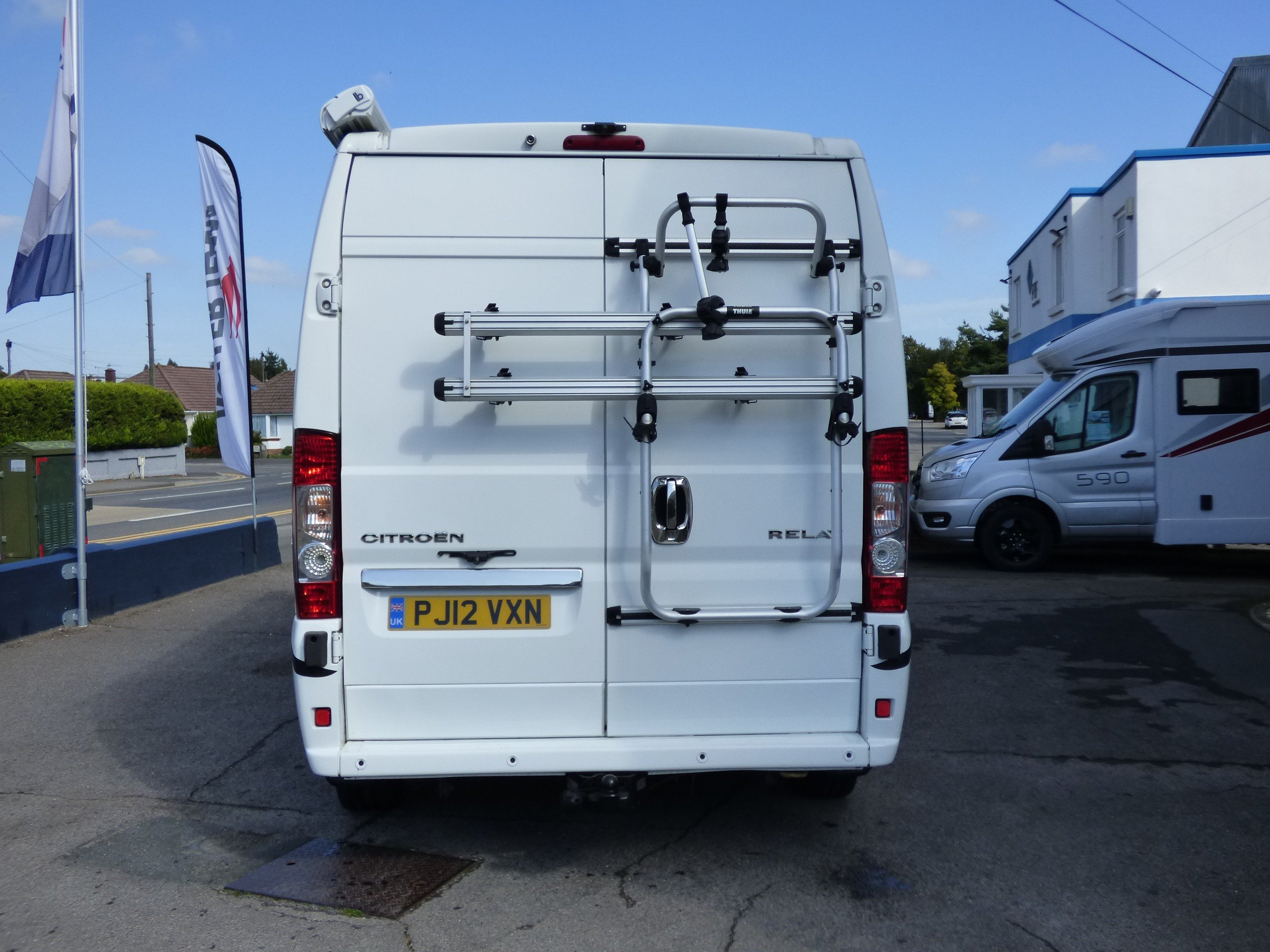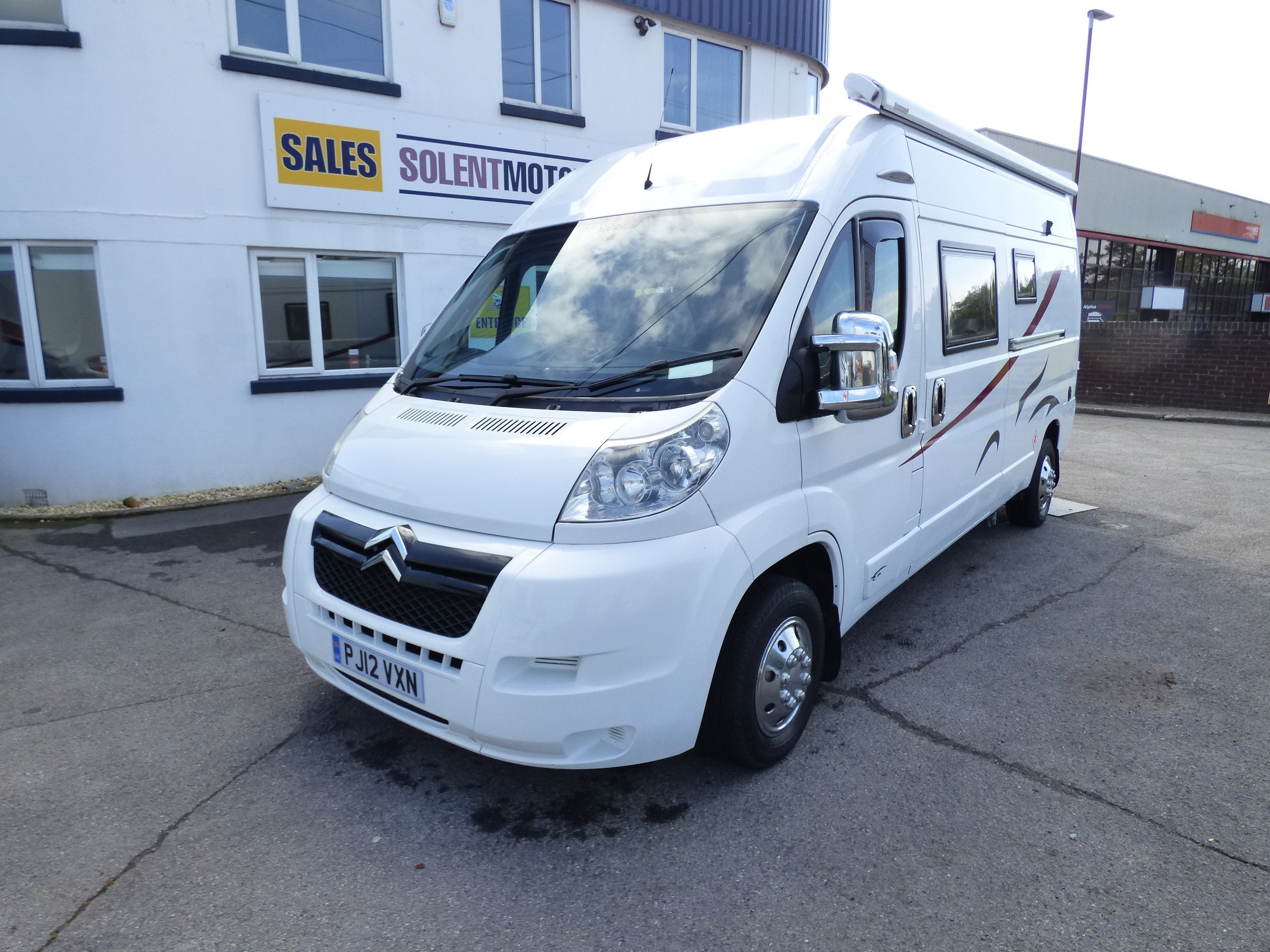 Solent are pleased to offer this well thought-out van conversion based on the popular Citroen Relay van with 130bhp engine and 6 speed manual transmission. The front seats swivel to face a side sofa dinette with removable table. The side kitchen is fitted with a Thetford Caprice cooker with 3 gas and 1 electric burners along with a separate oven and grill, compressor fridge/freezer and microwave. Opposite, the wetroom style bathroom has a shower cubicle, cassette type toilet and a folding wash hand basin. The rear bedroom has a fixed transverse double bed with ample cupboard storage. The underbed storage is reached via the back doors and has Thule storage hangers and an external shower point. Heating is via a Diesel heater and hot water via a Truma system. Other features of this Citroen Relay Camper include: Prostor awning, External BBQ point, Towbar, Reversing camera, 2 bike rack, rear park distance control, TV Antenna and TV bracket. 2 berth, 2 seatbelts. L. 5.99m, W. 2.15m, H. 2.7m, 3,500kg, 66892 miles.