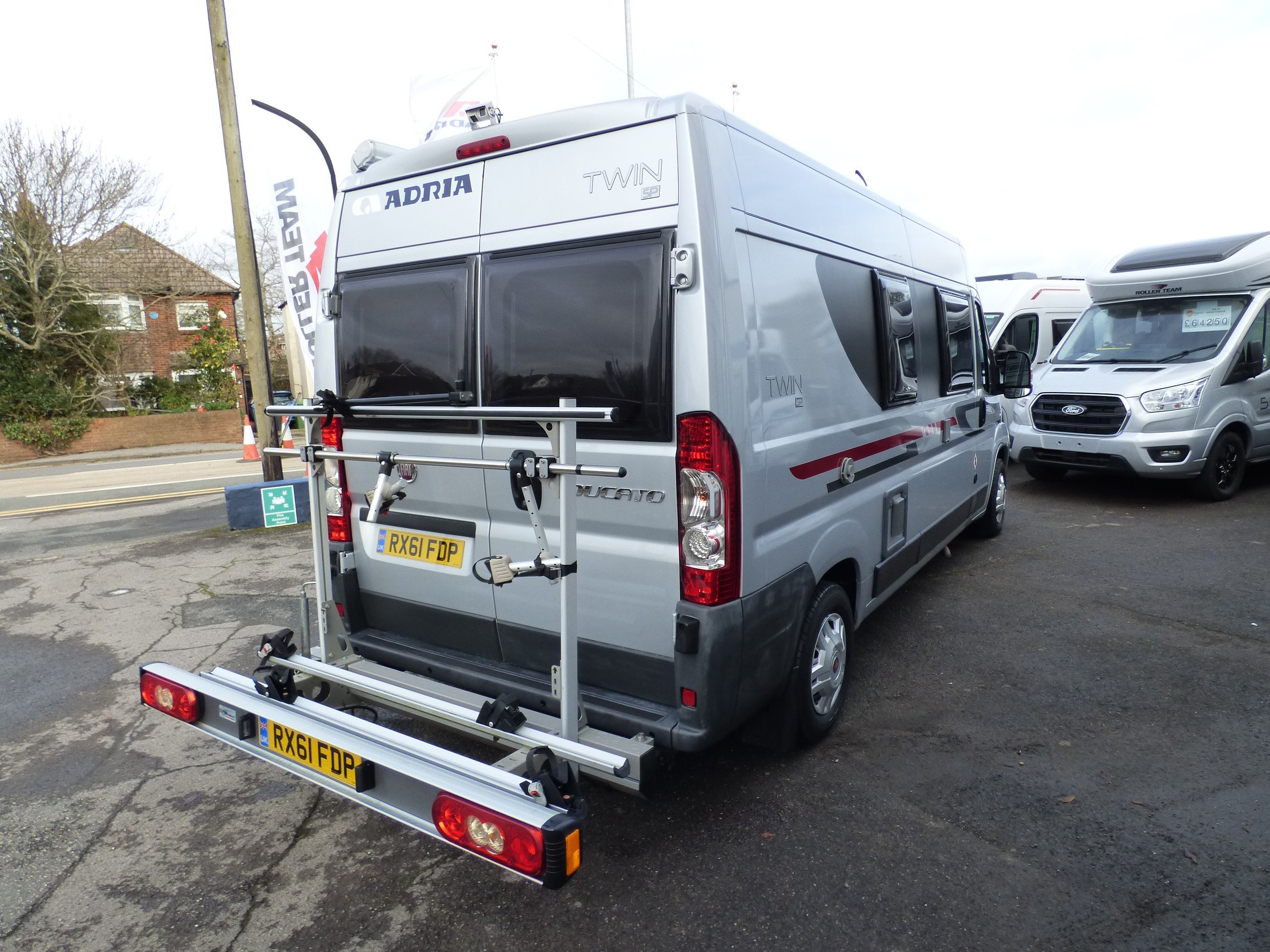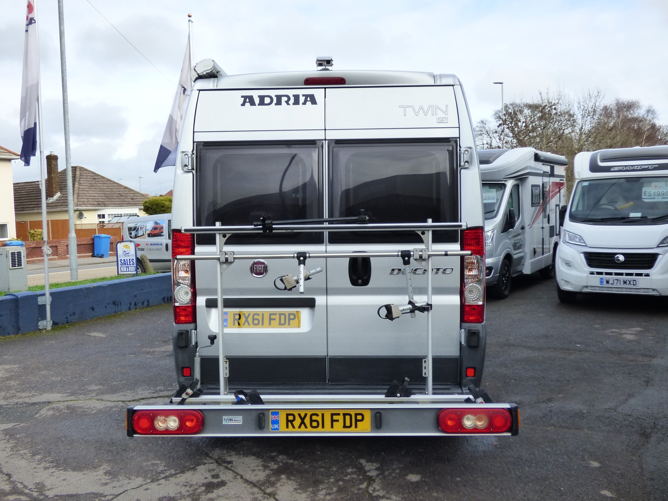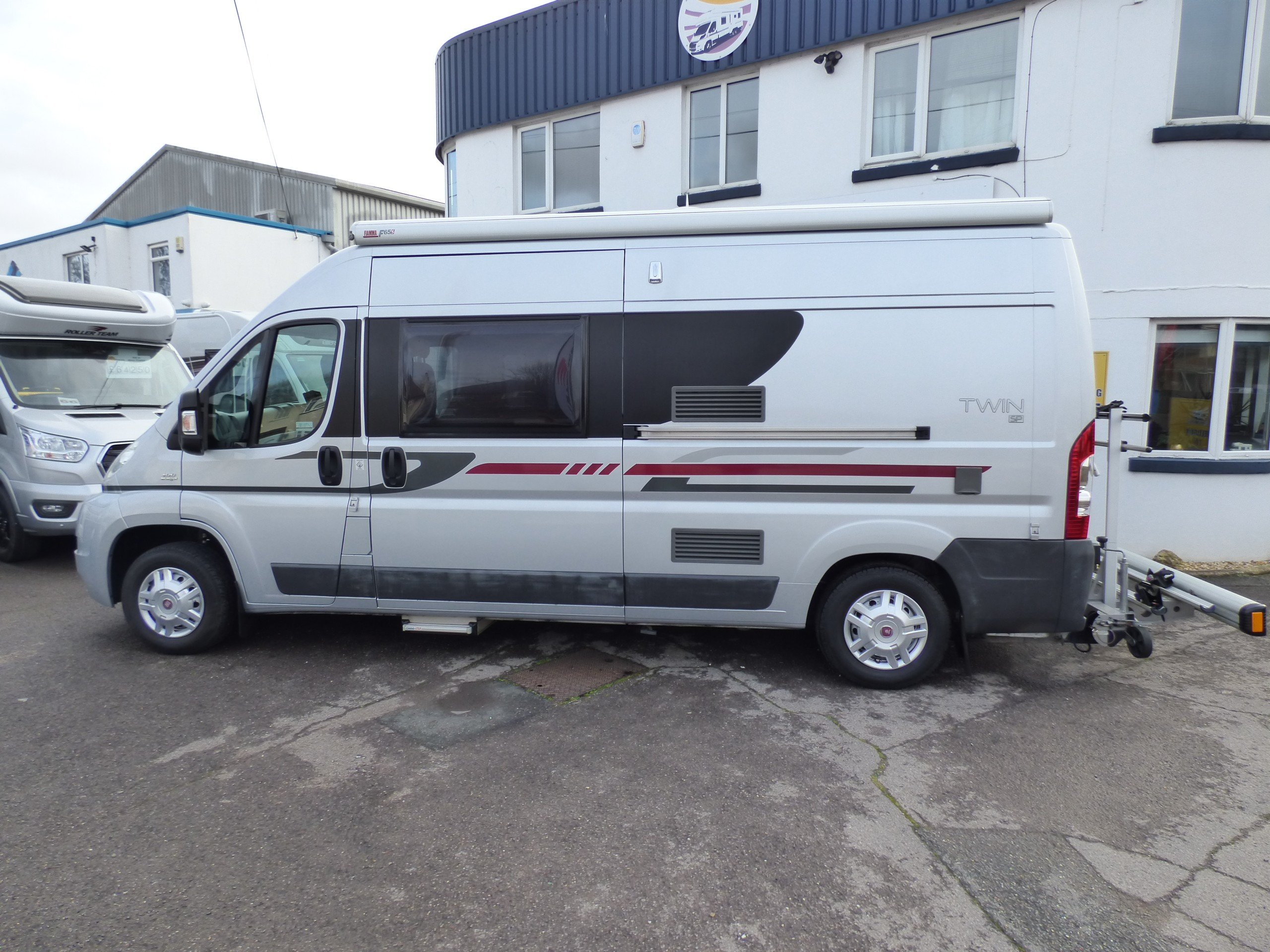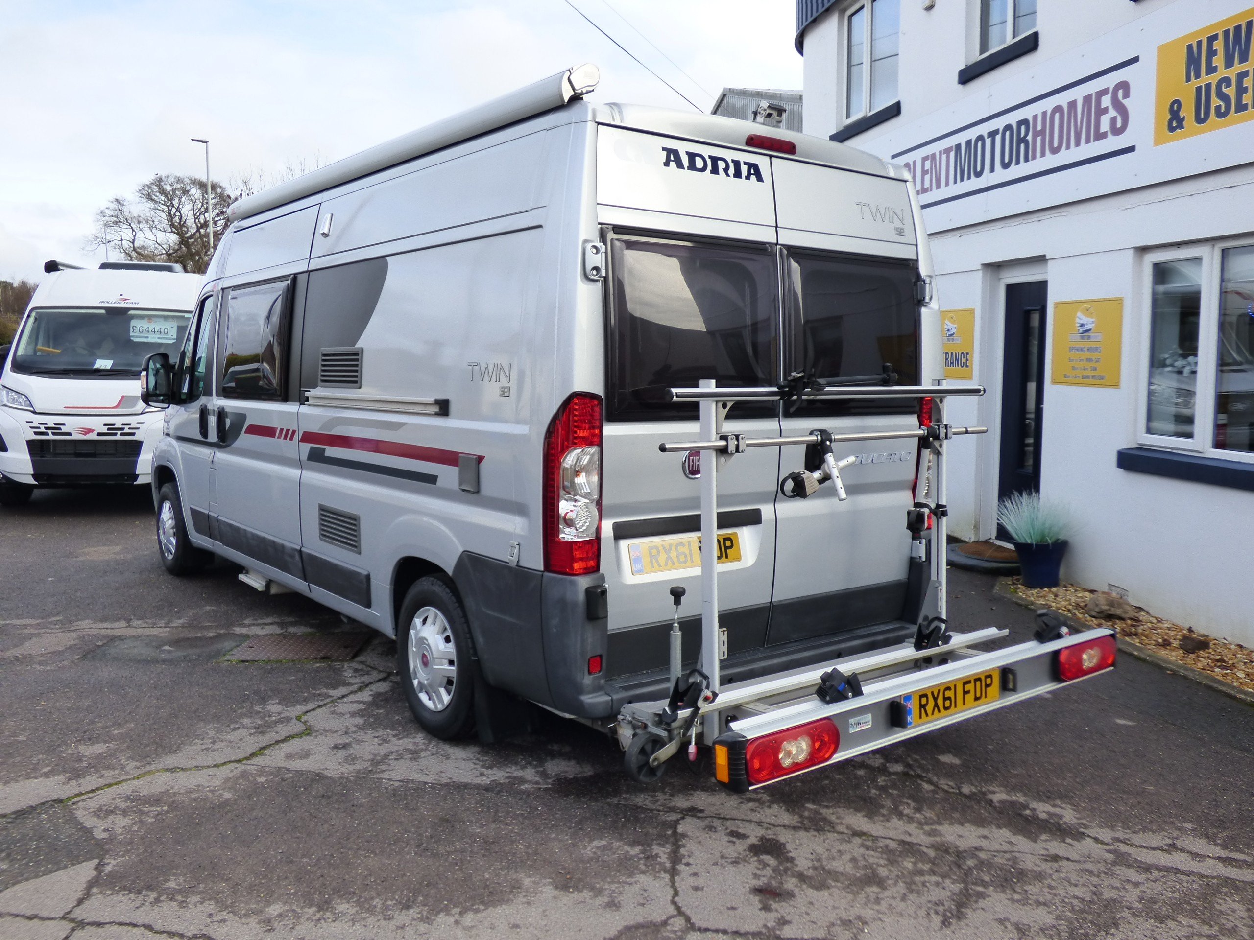 A really lovely one owner Adria Twin, clearly very well cared for throughout it's life. Based on the Fiat Ducato chassis with 2.2l engine and 5 speed manual transmission, the accommodation is laid out with a ,front dinette where the front seats swivel to face the rear two travelling seats, a side kitchen with 2 burner gas hob, gas oven/grill and a Thetford 3 way fridge/freezer. Opposite the kitchen via a tambour door is the wet room style bathroom with shower, wash hand basin and cassette type toilet with SOG extractor. The large double bed at the rear can be folded away to provide a huge storage area. Lots of cupboard and wardrobe space throughout and it is fitted with a Truma combi hot water and heating system. Other features for this Adria Twin SP include: Electric step, Pleated front screen blind, Avtex TV, Vision Plus antenna, solar panel, rear parking sensors and two way reversing camera, Fiamma F65S wind out awning and a substantial Sawico bike carrier for 2 bikes. 2 Berth, 4 seatbelts. L. 5.98m, W. 2.05m, H 2.58m, 3,500kg, 39,679 miles.