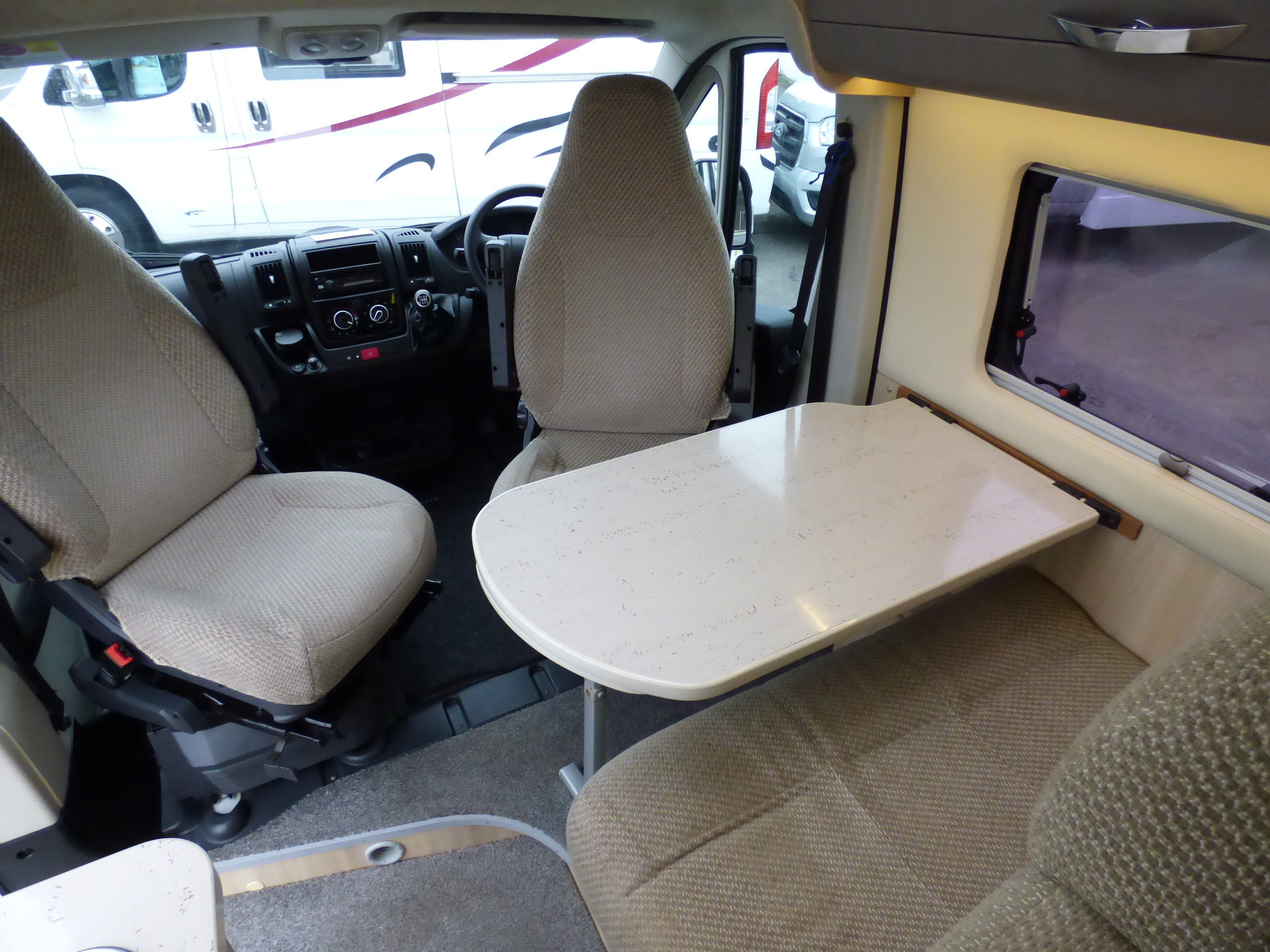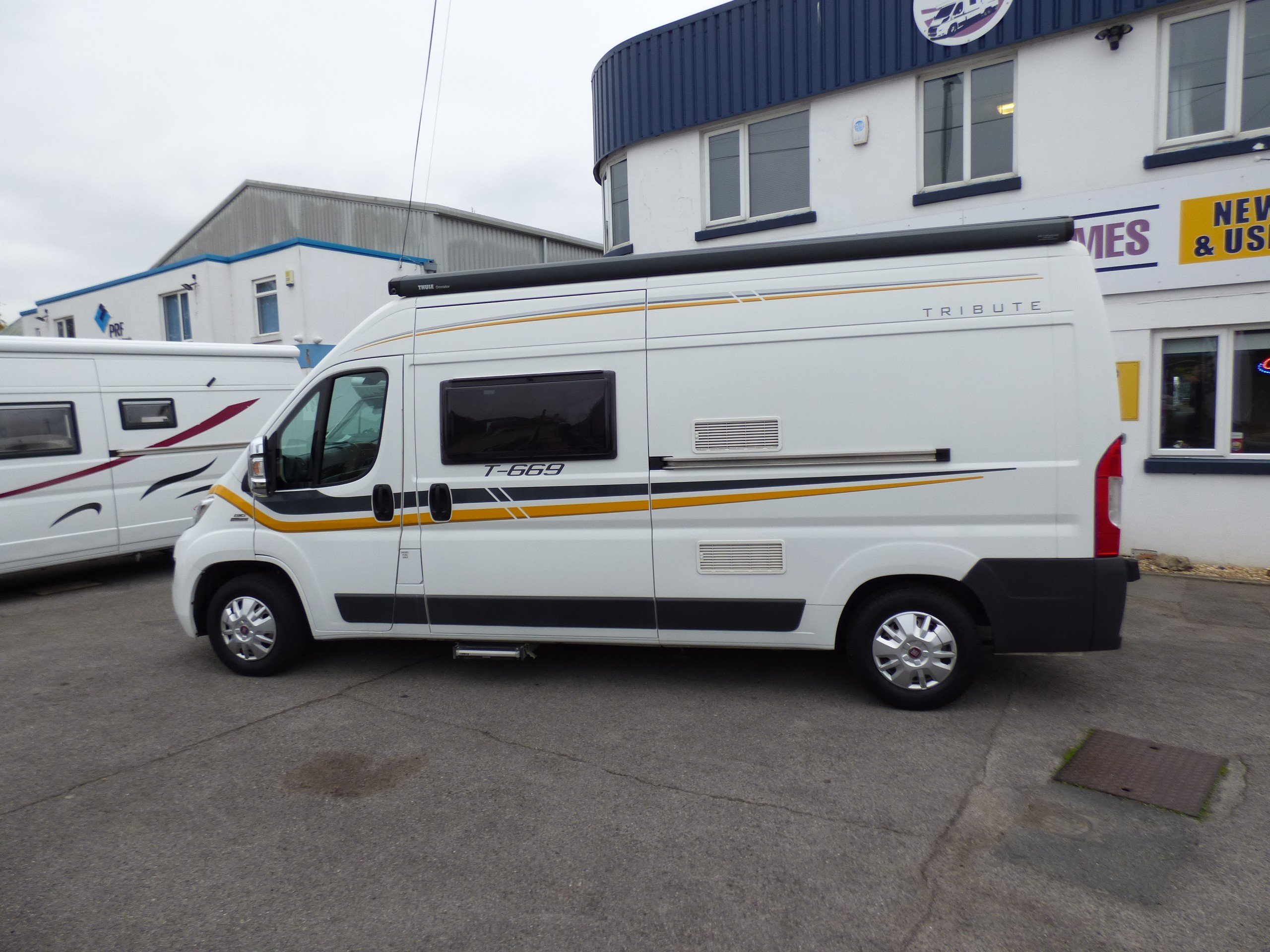 Solent are pleased to offer this well looked after Auto-Trail Tribute T669 Campervan. Supplied by us from new, based on the Fiat Ducato chassis with uprated 130bhp engine and 6 speed manual transmission, this camper offers seating and beds for 4 all in a sub 6 metre package. The front seats swivel to face a dinette with 2 further travelling seats. The side kitchen is fitted with a Thetford Gas oven and grill, 2 burner gas hob and Dometic 3 way fridge/freezer. Opposite, the wet-room style bathroom has a shower, cassette type toilet and wash hand basin. The rear of the camper is the bedroom with two double bunks. The upper bunks can be removed if travelling for two is required and there is ample cupboard space throughout. Heating and hot water is by a Truma combi system and other features for this Tribute T-669 include: Fiamma 2 bike rack, Cello TV with Teleco TV antenna, Solar panel, Carpets, reversing camera and a Thule wind out awning. L. 5.99m, W. 2.05m, H. 2.68m, 3,300 kg. 4 berth, 4 seat belts, 59,640 miles.