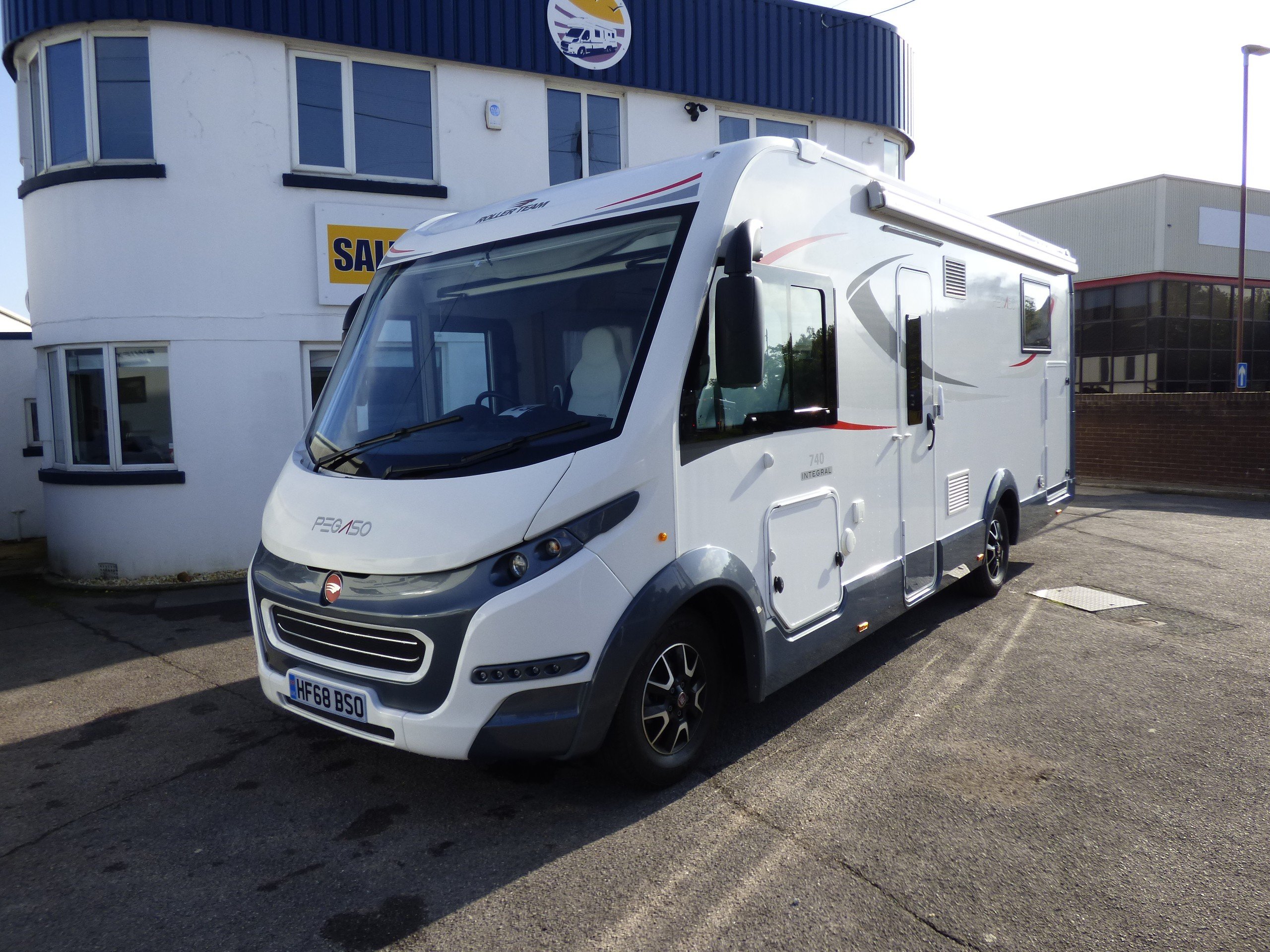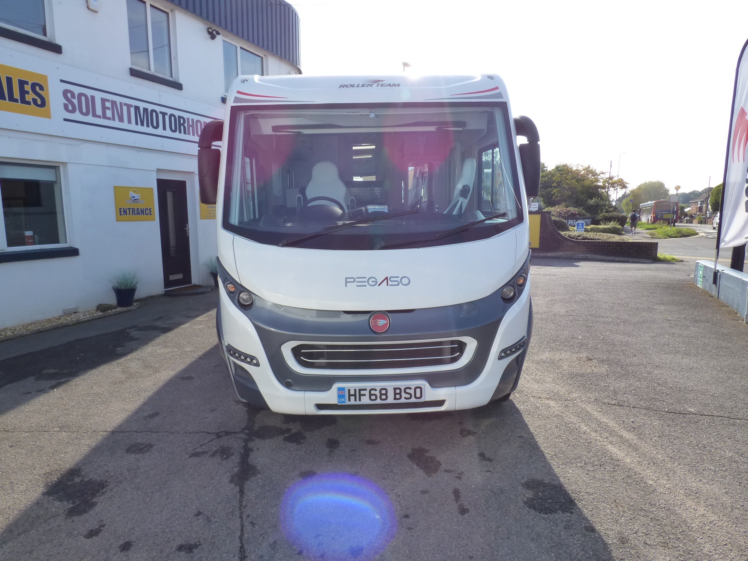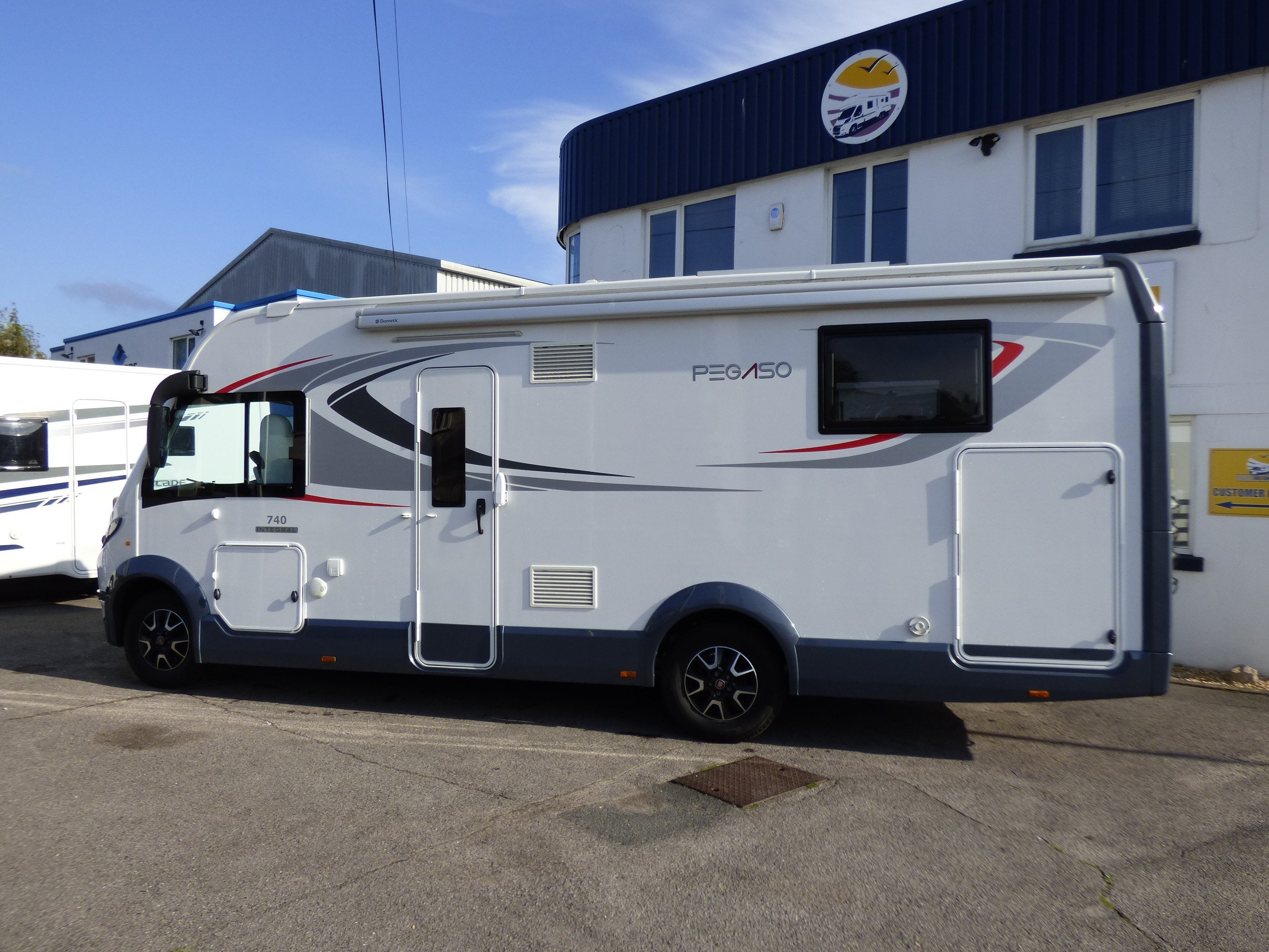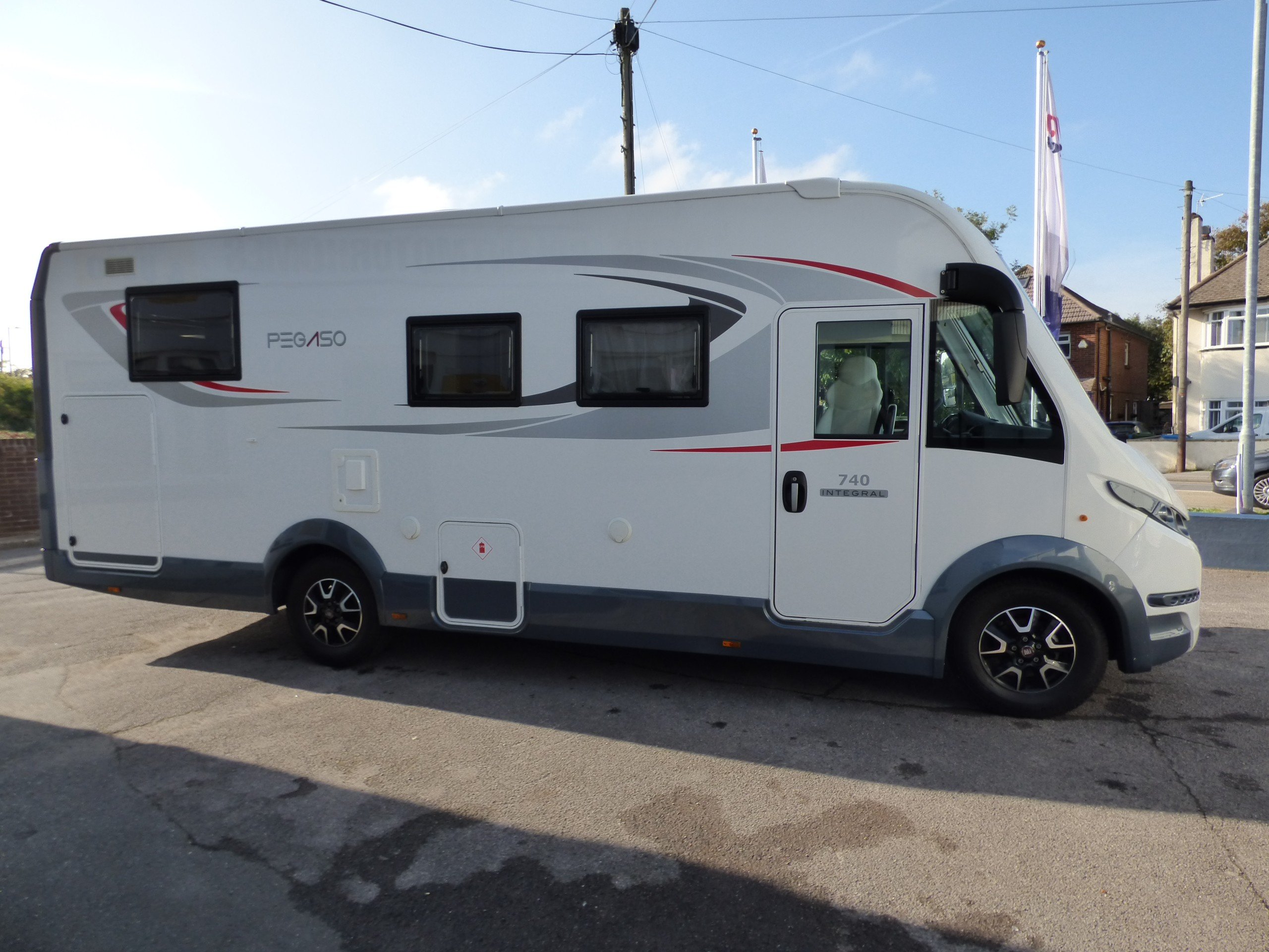 A rare chance to buy a wonderful Pegaso 740 Island bed 4 berth motorhome. Based on the Fiat Ducato chassis with 6 speed manual transmission and re-mapped 130bhp engine. The popular layout has a double bed that pulls down over the driver and passenger seats leaving the eco-leather covered lounge usable when the bed is in the down position. The central kitchen has a 3 burner gas hob and Thetford Gas oven/grill. The large fridge/freezer is opposite and the central bathroom has a cassette type toilet on one side, a central basin set into a cupboard arrangement and separate shower cubicle on the other side. The rear bedroom has an adjustable Island bed with wardrobes either side. Heating and hot water is taken car of by a Truma dual fuel system. Features and optional extras on this Pegaso 740 include: Solar panel, Fiamma 4 Bike rack, Dometic wind out awning, reversing camera, parking sensors, External shower point, Truma iNet system, Satellite Dish and SOG extractor system. L. 7.38m, W. 2.35m, H 2.96m, 3,500kg, 4 Berth, 4 Seat Belts, 12,867 miles.