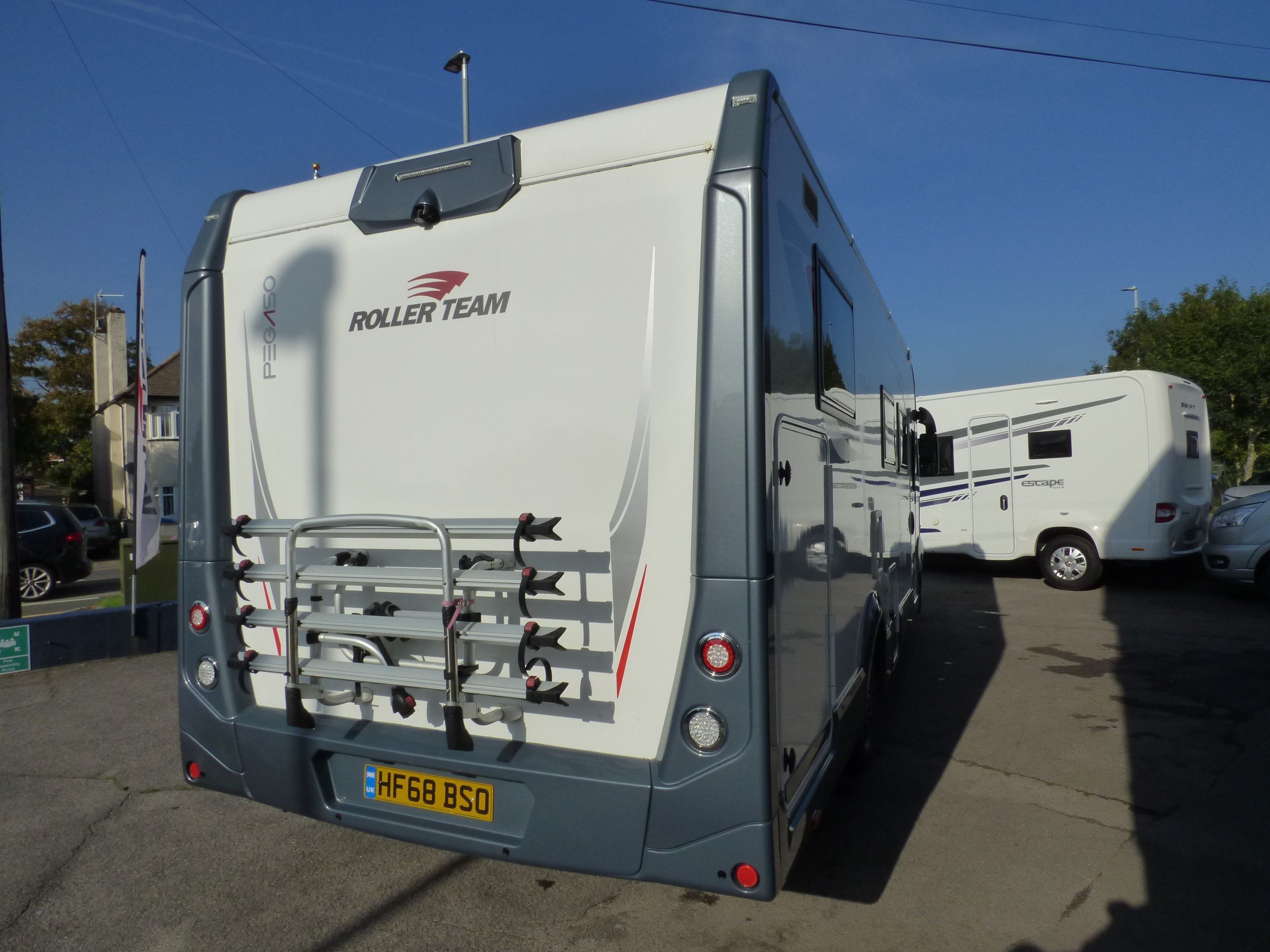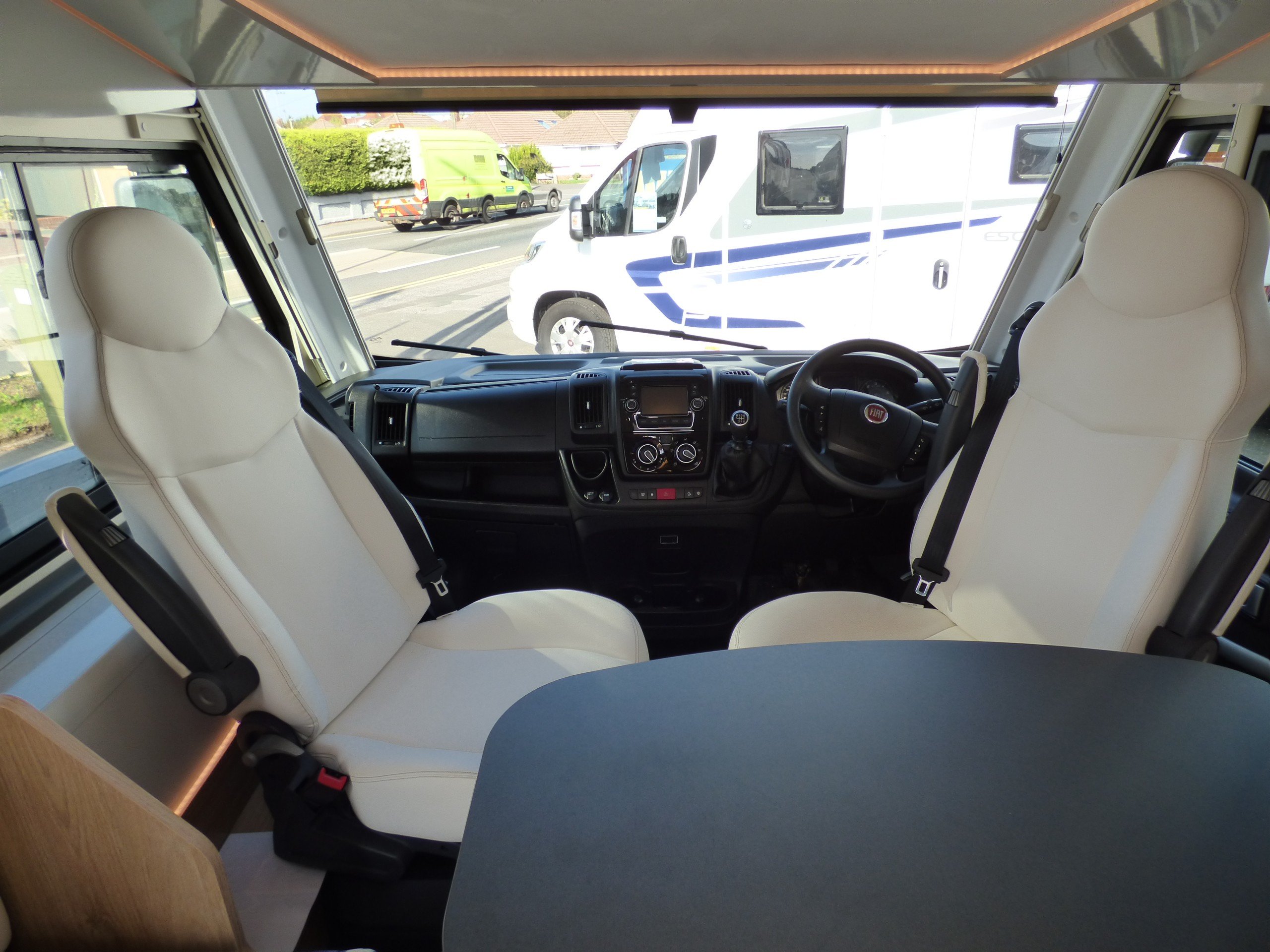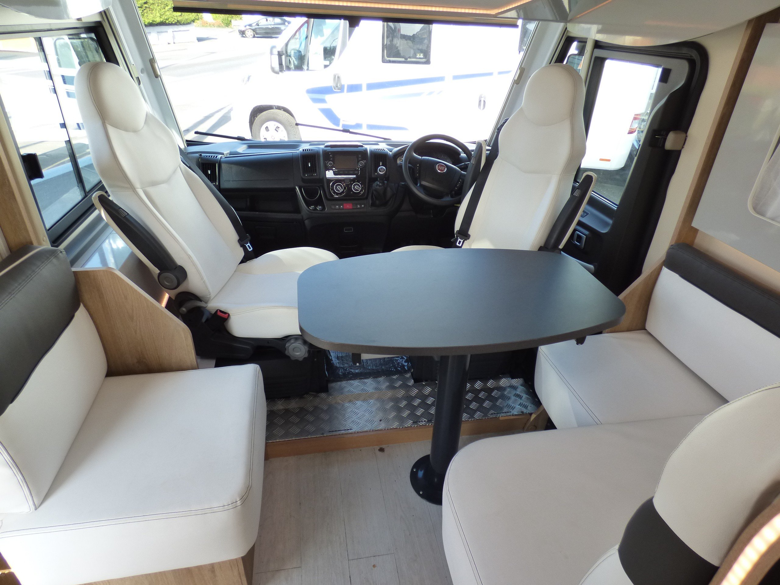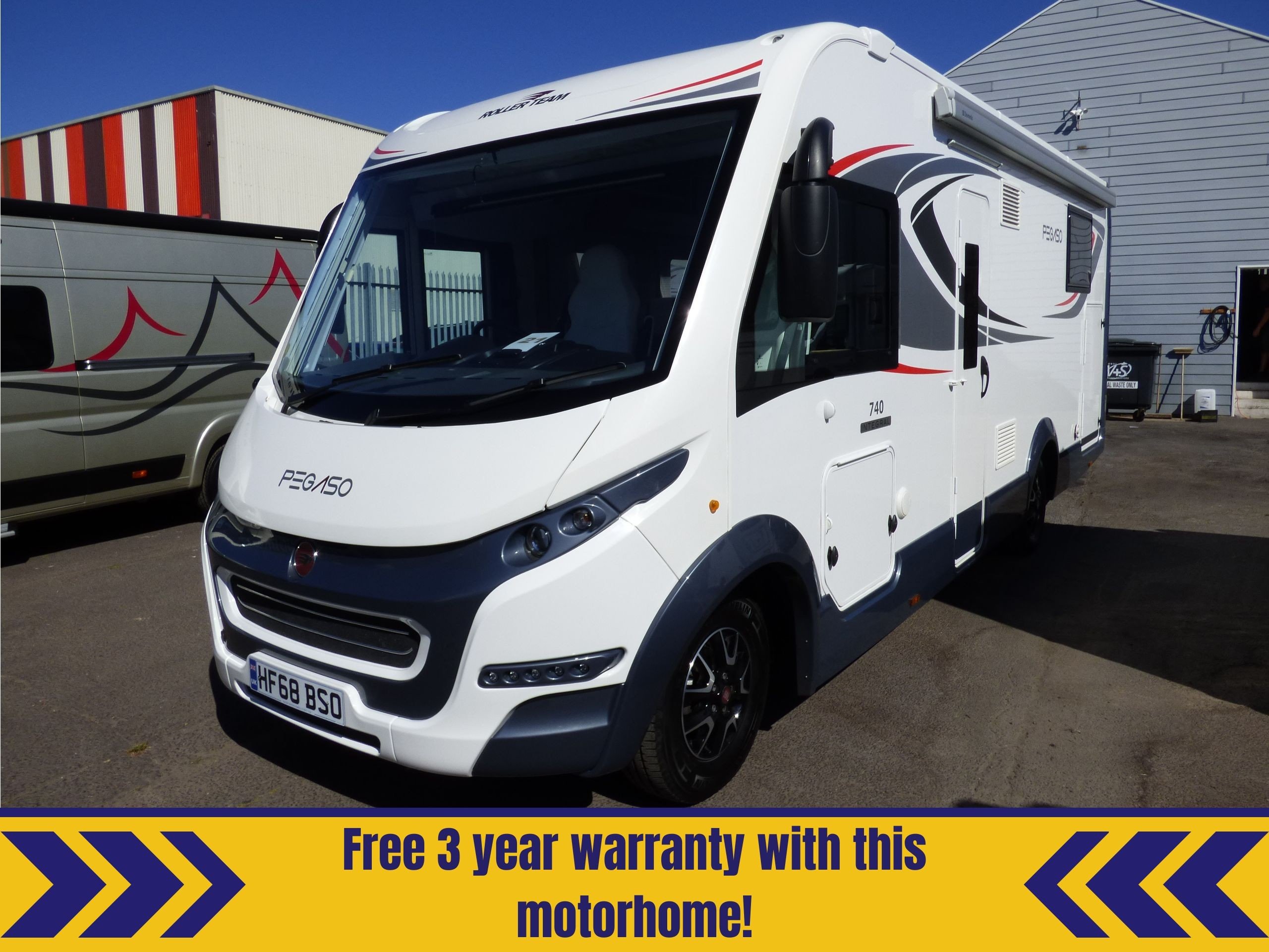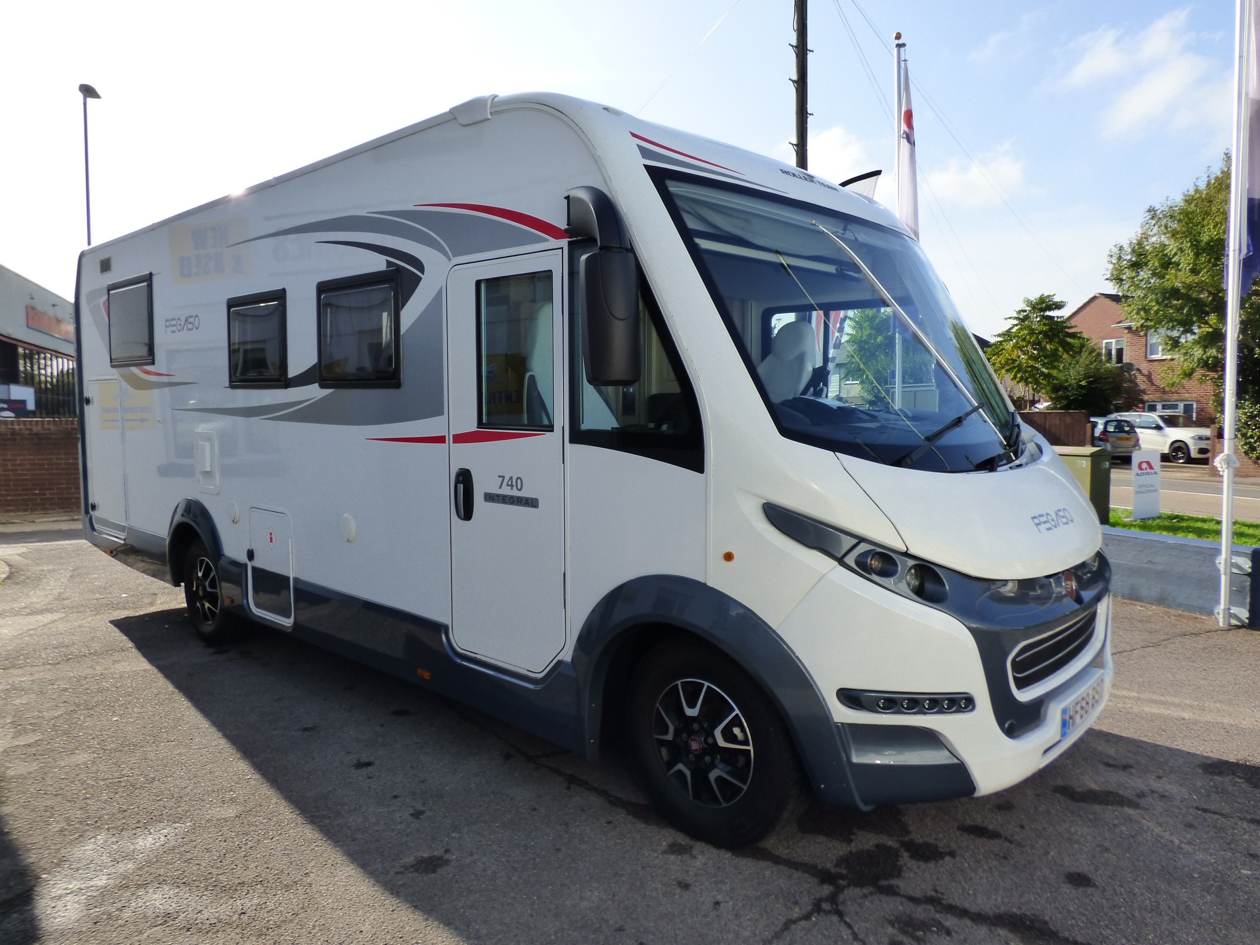 A rare chance to buy a wonderful Pegaso 740 Island bed 4 berth motorhome. Based on the Fiat Ducato chassis with 6 speed manual transmission and re-mapped 130bhp engine. The popular layout has a double bed that pulls down over the driver and passenger seats leaving the eco-leather covered lounge usable when the bed is in the down position. The central kitchen has a 3 burner gas hob and Thetford Gas oven/grill. The large fridge/freezer is opposite and the central bathroom has a cassette type toilet on one side, a central basin set into a cupboard arrangement and separate shower cubicle on the other side. The rear bedroom has an adjustable Island bed with wardrobes either side. Heating and hot water is taken car of by a Truma dual fuel system. Features and optional extras on this Pegaso 740 include: Solar panel, Fiamma 4 Bike rack, Dometic wind out awning, reversing camera, parking sensors, External shower point, Truma iNet system, Satellite Dish and SOG extractor system. L. 7.38m, W. 2.35m, H 2.96m, 3,500kg, 4 Berth, 4 Seat Belts, 12,867 miles.